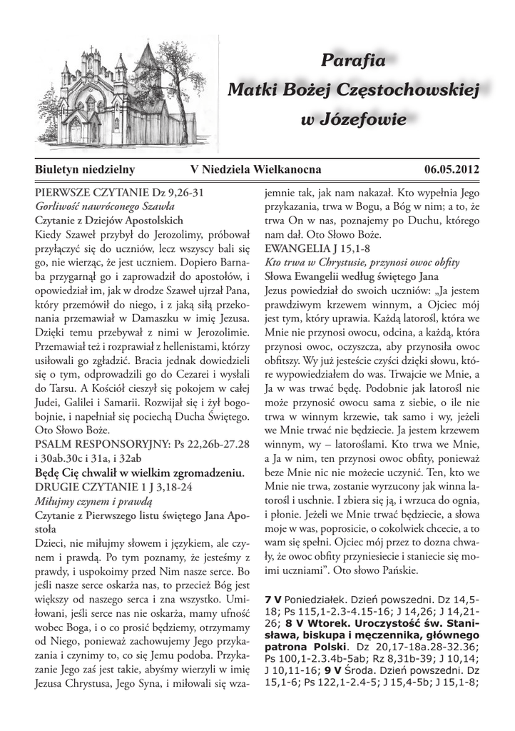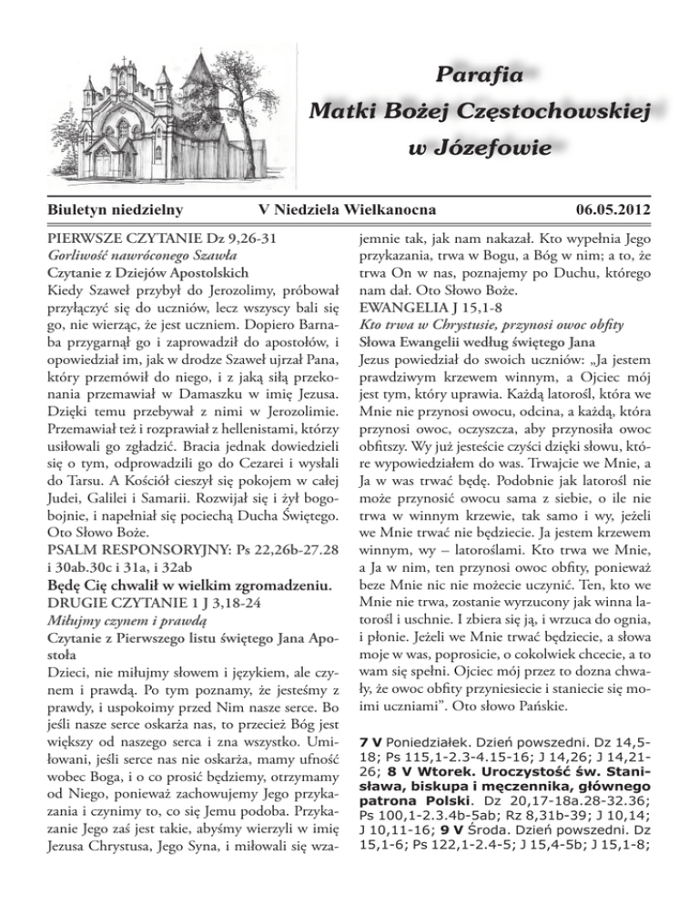 Parafia Matki Bożej Częstochowskiej w Józefowie Biuletyn niedzielny V Niedziela Wielkanocna PIERWSZE CZYTANIE Dz 9,26-31 Gorliwość nawróconego Szawła Czytanie z Dziejów Apostolskich Kiedy Szaweł przybył do Jerozolimy, próbował przyłączyć się do uczniów, lecz wszyscy bali się go, nie wierząc, że jest uczniem. Dopiero Barnaba przygarnął go i zaprowadził do apostołów, i opowiedział im, jak w drodze Szaweł ujrzał Pana, który przemówił do niego, i z jaką siłą przekonania przemawiał w Damaszku w imię Jezusa. Dzięki temu przebywał z nimi w Jerozolimie. Przemawiał też i rozprawiał z hellenistami, którzy usiłowali go zgładzić. Bracia jednak dowiedzieli się o tym, odprowadzili go do Cezarei i wysłali do Tarsu. A Kościół cieszył się pokojem w całej Judei, Galilei i Samarii. Rozwijał się i żył bogobojnie, i napełniał się pociechą Ducha Świętego. Oto Słowo Boże. PSALM RESPONSORYJNY: Ps 22,26b-27.28 i 30ab.30c i 31a, i 32ab Będę Cię chwalił w wielkim zgromadzeniu. DRUGIE CZYTANIE 1 J 3,18-24 Miłujmy czynem i prawdą Czytanie z Pierwszego listu świętego Jana Apostoła Dzieci, nie miłujmy słowem i językiem, ale czynem i prawdą. Po tym poznamy, że jesteśmy z prawdy, i uspokoimy przed Nim nasze serce. Bo jeśli nasze serce oskarża nas, to przecież Bóg jest większy od naszego serca i zna wszystko. Umiłowani, jeśli serce nas nie oskarża, mamy ufność wobec Boga, i o co prosić będziemy, otrzymamy od Niego, ponieważ zachowujemy Jego przykazania i czynimy to, co się Jemu podoba. Przykazanie Jego zaś jest takie, abyśmy wierzyli w imię Jezusa Chrystusa, Jego Syna, i miłowali się wza- 06.05.2012 jemnie tak, jak nam nakazał. Kto wypełnia Jego przykazania, trwa w Bogu, a Bóg w nim; a to, że trwa On w nas, poznajemy po Duchu, którego nam dał. Oto Słowo Boże. EWANGELIA J 15,1-8 Kto trwa w Chrystusie, przynosi owoc obfity Słowa Ewangelii według świętego Jana Jezus powiedział do swoich uczniów: „Ja jestem prawdziwym krzewem winnym, a Ojciec mój jest tym, który uprawia. Każdą latorośl, która we Mnie nie przynosi owocu, odcina, a każdą, która przynosi owoc, oczyszcza, aby przynosiła owoc obfitszy. Wy już jesteście czyści dzięki słowu, które wypowiedziałem do was. Trwajcie we Mnie, a Ja w was trwać będę. Podobnie jak latorośl nie może przynosić owocu sama z siebie, o ile nie trwa w winnym krzewie, tak samo i wy, jeżeli we Mnie trwać nie będziecie. Ja jestem krzewem winnym, wy – latoroślami. Kto trwa we Mnie, a Ja w nim, ten przynosi owoc obfity, ponieważ beze Mnie nic nie możecie uczynić. Ten, kto we Mnie nie trwa, zostanie wyrzucony jak winna latorośl i uschnie. I zbiera się ją, i wrzuca do ognia, i płonie. Jeżeli we Mnie trwać będziecie, a słowa moje w was, poprosicie, o cokolwiek chcecie, a to wam się spełni. Ojciec mój przez to dozna chwały, że owoc obfity przyniesiecie i staniecie się moimi uczniami”. Oto słowo Pańskie. 7 V Poniedziałek. Dzień powszedni. Dz 14,518; Ps 115,1-2.3-4.15-16; J 14,26; J 14,2126; 8 V Wtorek. Uroczystość św. Stanisława, biskupa i męczennika, głównego patrona Polski. Dz 20,17-18a.28-32.36; Ps 100,1-2.3.4b-5ab; Rz 8,31b-39; J 10,14; J 10,11-16; 9 V Środa. Dzień powszedni. Dz 15,1-6; Ps 122,1-2.4-5; J 15,4-5b; J 15,1-8; 10 V Czwartek. Dzień powszedni. Dz 15,721; Ps 96,1-2.3 i 10; J 10,27; J 15,9-11; 11 V Piątek. Dzień powszedni. Dz 15,22-31; Ps 57,8-9.10-12; J 15,15b; J 15,12-17; 12 V Sobota. Dzień powszedni albo wspomnienie świętych męczenników Nereusza i Achillesa, lub św. Pankracego, męczennika. Dz 16,110; Ps 100,1-2.3.4ab-5; Kol 3,1; J 15,18-21; 13 V Szósta Niedziela Wielkanocna. Dz 10,25-26.34-35.44-48; Ps 98,1.2-3ab.3cd4; 1 J 4,7-10; J 14,23; J 15,9-17. INTENCJE MSZALNE Niedziela 6.5. – 5 Niedziela Wielkanocy Ap. FILIPA I JAKUBA 7.00 + Rafała i Lucjana Boguszów (Gr. 6) + Wojciecha Kanabusa (Gr. 6) + Tadeusza Stępnia (Gr. 6) 8.30 + Stanisławę Piotrowską i cr. Piotrowskich. 10.00 + Stanisława Skwarka (im.), Konstantego i Bronisławę Skwarków. 11.30 + Stanisława Króla (im.) cr. Latuszków i Królów. 13.00 Za Parafian. 15.00 Msza wg mszału Jana XXIII – o nawrócenie osoby Bogu wiadomej. 18.00 + Eleonorę Ozimina, Stefanię, Antoniego, Tadeusza, Lucjana, Stefana i Stanisława z rodz. Radziszewskich. 20.00 + Edwarda Krupę (9 r. Sm.) jego r-ców Agnieszkę i Szczepana. Poniedziałek 7.5. 6.30 + Rafała i Lucjana Boguszów (Gr. 7) 6.30 + Romana i Zbigniewa Ilczuków (Gr. 7) 7.00 + Wojciecha Kanabusa (Gr. 7) 7.00 + Tadeusza Stępnia (Gr. 7) 7.00 + Wiktorię, Antoniego, Stanisława i Danutę Cholewickich. 8.30 + Katarzynę i Jana Kuchniewskich, Teresę i Stanisława Kuchniewskich, Tadeusza Kuchniewskiego (1 r. śm.) 18.00 + Michała, Helenę, Stanisława i Wacława Kotlińskich, Wtorek 8.5. – ŚW. STANISŁAWA, BISKUPA I MĘCZENNIKA 6.30 + Rafała i Lucjana Boguszów (Gr. 8) 6.30 + Stanisławę i Wacława Sarneckich, Marię i Kazimierza Sarneckich. 6.30 Dz-bł. w 8 r. urodzin Cecylii z prośbą o bł. Boże dla niej i cr. 7.00 + Wojciecha Kanabusa (Gr. 8) 7.00 + Tadeusza Stępnia (Gr. 8) 7.00 + Stanisława Grudnia (im.), Jana Grudnia i Jana Popisa. 8.30 + Romana i Zbigniewa Ilczuków (Gr. 8). 8.30 + Stanisława Błaszczyka, Stanisławę, Józefa i Adama Piotrowskich. 18.00 + Stanisława Żabickiego i cr. Żabickich. Środa 9.5. 6.30 + Rafała i Lucjana Boguszów (Gr. 9) 6.30 + Romana i Zbigniewa Ilczuków (Gr. 9) 6.30 + Marię Gruchalską (mies. po śm.) 7.00 + Wojciecha Kanabusa (Gr. 9) 7.00 + Tadeusza Stępnia (Gr. 9) 7.00 + Stanisławę Przetacką i Stanisława Górnego. 8.30 + Irenę Gawłowską (mies. po śm.) 18.00 Nowenna do MB Nieustającej Pomocy Dz.-bł .w 2 r. chrztu Sary + Annę Rejmer (2 r. śm.). + Stanisława Zalewskiego. + Władysława Barana (1 r. śm.), Grzegorza Barana (13 r. śm.), cr. Serzysków i Baranów. + Wacława Zawistowskiego i jego rodziców oraz Bożenę Zawistowską. + 