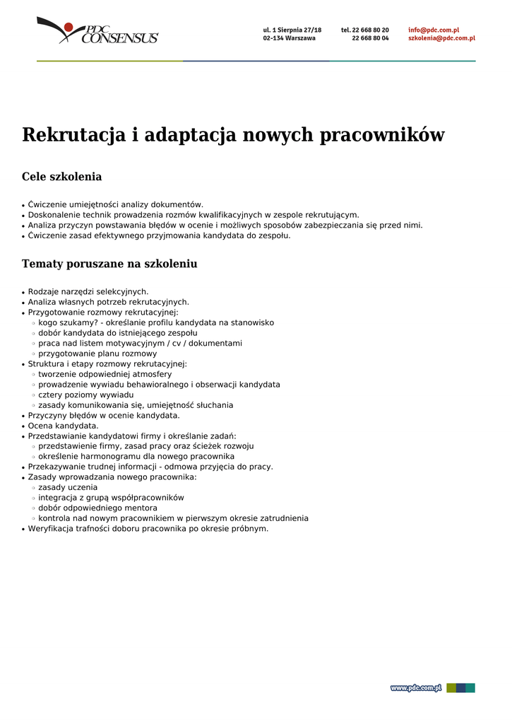 Rekrutacja i adaptacja nowych pracowników Cele szkolenia ● ● ● ● Ćwiczenie umiejętności analizy dokumentów. Doskonalenie technik prowadzenia rozmów kwalifikacyjnych w zespole rekrutującym. Analiza przyczyn powstawania błędów w ocenie i możliwych sposobów zabezpieczania się przed nimi. Ćwiczenie zasad efektywnego przyjmowania kandydata do zespołu. Tematy poruszane na szkoleniu ● ● ● Rodzaje narzędzi selekcyjnych. Analiza własnych potrzeb rekrutacyjnych. Przygotowanie rozmowy rekrutacyjnej: kogo szukamy? - określanie profilu kandydata na stanowisko dobór kandydata do istniejącego zespołu praca nad listem motywacyjnym / cv / dokumentami przygotowanie planu rozmowy Struktura i etapy rozmowy rekrutacyjnej: tworzenie odpowiedniej atmosfery prowadzenie wywiadu behawioralnego i obserwacji kandydata cztery poziomy wywiadu zasady komunikowania się, umiejętność słuchania Przyczyny błędów w ocenie kandydata. Ocena kandydata. Przedstawianie kandydatowi firmy i określanie zadań: przedstawienie firmy, zasad pracy oraz ścieżek rozwoju określenie harmonogramu dla nowego pracownika Przekazywanie trudnej informacji - odmowa przyjęcia do pracy. Zasady wprowadzania nowego pracownika: zasady uczenia integracja z grupą współpracowników dobór odpowiedniego mentora kontrola nad nowym pracownikiem w pierwszym okresie zatrudnienia Weryfikacja trafności doboru pracownika po okresie próbnym. ❍ ❍ ❍ ❍ ● ❍ ❍ ❍ ❍ ● ● ● ❍ ❍ ● ● ❍ ❍ ❍ ❍ ●