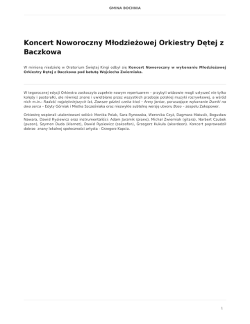 GMINA BOCHNIA Koncert Noworoczny Młodzieżowej Orkiestry Dętej z Baczkowa W minioną niedzielę w Oratorium Świętej Kingi odbył się Koncert Noworoczny w wykonaniu Młodzieżowej Orkiestry Dętej z Baczkowa pod batutą Wojciecha Zwierniaka. W tegorocznej edycji Orkiestra zaskoczyła zupełnie nowym repertuarem – przybyli widzowie mogli usłyszeć nie tylko kolędy i pastorałki, ale również znane i uwielbiane przez wszystkich przeboje polskiej muzyki rozrywkowej, a wśród nich m.in.: Radość najpiękniejszych lat, Zawsze gdzieś czeka ktoś – Anny Jantar, poruszające wykonanie Dumki na dwa serca – Edyty Górniak i Mietka Szcześniaka oraz niezwykle subtelną wersję utworu Boso – zespołu Zakopower. Orkiestrę wspierali utalentowani soliści: Monika Polak, Sara Rynowska, Weronika Czyż, Dagmara Matusik, Bogusław Nawara, Dawid Rysiewicz oraz instrumentaliści: Adam Jarzmik (piano), Michał Zwierniak (gitara), Norbert Czubek (puzon), Szymon Duda (klarnet), Dawid Rysiewicz (saksofon), Grzegorz Kukuła (akordeon). Koncert poprowadził dobrze znany lokalnej społeczności artysta - Grzegorz Kapcia. 1