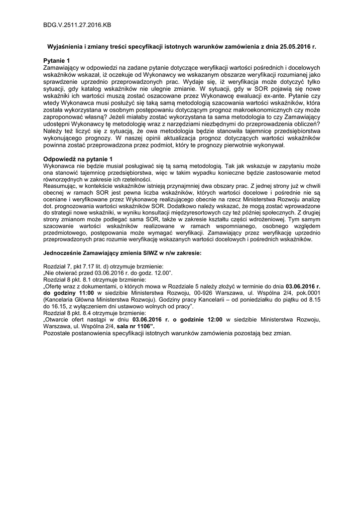 BDG.V.2511.27.2016.KB Wyjaśnienia i zmiany treści specyfikacji istotnych warunków zamówienia z dnia 25.05.2016 r. Pytanie 1 Zamawiający w odpowiedzi na zadane pytanie dotyczące weryfikacji wartości pośrednich i docelowych wskaźników wskazał, iż oczekuje od Wykonawcy we wskazanym obszarze weryfikacji rozumianej jako sprawdzenie uprzednio przeprowadzonych prac. Wydaje się, iż weryfikacja może dotyczyć tylko sytuacji, gdy katalog wskaźników nie ulegnie zmianie. W sytuacji, gdy w SOR pojawią się nowe wskaźniki ich wartości muszą zostać oszacowane przez Wykonawcę ewaluacji ex-ante. Pytanie czy wtedy Wykonawca musi posłużyć się taką samą metodologią szacowania wartości wskaźników, która została wykorzystana w osobnym postępowaniu dotyczącym prognoz makroekonomicznych czy może zaproponować własną? Jeżeli miałaby zostać wykorzystana ta sama metodologia to czy Zamawiający udostępni Wykonawcy tę metodologię wraz z narzędziami niezbędnymi do przeprowadzenia obliczeń? Należy też liczyć się z sytuacją, że owa metodologia będzie stanowiła tajemnicę przedsiębiorstwa wykonującego prognozy. W naszej opinii aktualizacja prognoz dotyczących wartości wskaźników powinna zostać przeprowadzona przez podmiot, który te prognozy pierwotnie wykonywał. Odpowiedź na pytanie 1 Wykonawca nie będzie musiał posługiwać się tą samą metodologią. Tak jak wskazuje w zapytaniu może ona stanowić tajemnicę przedsiębiorstwa, więc w takim wypadku konieczne będzie zastosowanie metod równorzędnych w zakresie ich rzetelności. Reasumując, w kontekście wskaźników istnieją przynajmniej dwa obszary prac. Z jednej strony już w chwili obecnej w ramach SOR jest pewna liczba wskaźników, których wartości docelowe i pośrednie nie są oceniane i weryfikowane przez Wykonawcę realizującego obecnie na rzecz Ministerstwa Rozwoju analizę dot. prognozowania wartości wskaźników SOR. Dodatkowo należy wskazać, że mogą zostać wprowadzone do strategii nowe wskaźniki, w wyniku konsultacji międzyresortowych czy też później społecznych. Z drugiej strony zmianom może podlegać sama SOR, także w zakresie kształtu części wdrożeniowej. Tym samym szacowanie wartości wskaźników realizowane w ramach wspomnianego, osobnego względem przedmiotowego, postępowania może wymagać weryfikacji. Zamawiający przez weryfikację uprzednio przeprowadzonych prac rozumie weryfikację wskazanych wartości docelowych i pośrednich wskaźników. Jednocześnie Zamawiający zmienia SIWZ w n/w zakresie: Rozdział 7, pkt 7.17 lit. d) otrzymuje brzmienie: „Nie otwierać przed 03.06.2016 r. do godz. 12.00”. Rozdział 8 pkt. 8.1 otrzymuje brzmienie: „Ofertę wraz z dokumentami, o których mowa w Rozdziale 5 należy złożyć w terminie do dnia 03.06.2016 r. do godziny 11:00 w siedzibie Ministerstwa Rozwoju, 00-926 Warszawa, ul. Wspólna 2/4, pok.0001 (Kancelaria Główna Ministerstwa Rozwoju). Godziny pracy Kancelarii – od poniedziałku do piątku od 8.15 do 16.15, z wyłączeniem dni ustawowo wolnych od pracy”. Rozdział 8 pkt. 8.4 otrzymuje brzmienie: „Otwarcie ofert nastąpi w dniu 03.06.2016 r. o godzinie 12:00 w siedzibie Ministerstwa Rozwoju, Warszawa, ul. Wspólna 2/4, sala nr 1106”. Pozostałe postanowienia specyfikacji istotnych warunków zamówienia pozostają bez zmian.