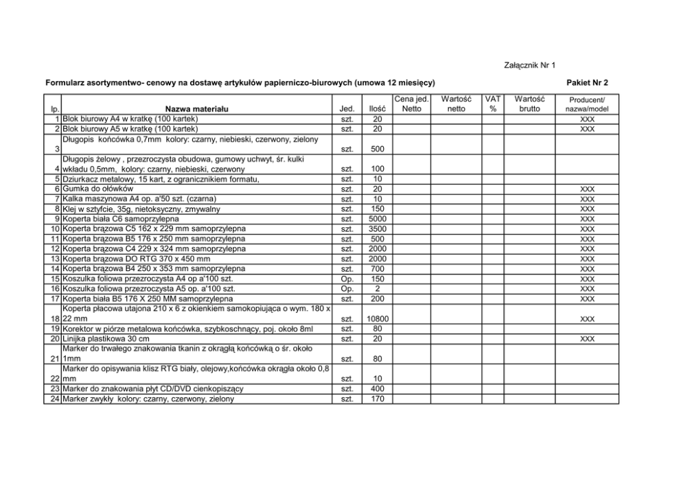 Załącznik Nr 1 Formularz asortymentwo- cenowy na dostawę artykułów papierniczo-biurowych (umowa 12 miesięcy) lp. Nazwa materiału 1 Blok biurowy A4 w kratkę (100 kartek) 2 Blok biurowy A5 w kratkę (100 kartek) Długopis końcówka 0,7mm kolory: czarny, niebieski, czerwony, zielony 3 Długopis żelowy , przezroczysta obudowa, gumowy uchwyt, śr. kulki 4 wkładu 0,5mm, kolory: czarny, niebieski, czerwony 5 Dziurkacz metalowy, 15 kart, z ogranicznikiem formatu, 6 Gumka do ołówków 7 Kalka maszynowa A4 op. a'50 szt. (czarna) 8 Klej w sztyfcie, 35g, nietoksyczny, zmywalny 9 Koperta biała C6 samoprzylepna 10 Koperta brązowa C5 162 x 229 mm samoprzylepna 11 Koperta brązowa B5 176 x 250 mm samoprzylepna 12 Koperta brązowa C4 229 x 324 mm samoprzylepna 13 Koperta brązowa DO RTG 370 x 450 mm 14 Koperta brązowa B4 250 x 353 mm samoprzylepna 15 Koszulka foliowa przezroczysta A4 op a'100 szt. 16 Koszulka foliowa przezroczysta A5 op. a'100 szt. 17 Koperta biała B5 176 X 250 MM samoprzylepna Koperta płacowa utajona 210 x 6 z okienkiem samokopiująca o wym. 180 x 18 22 mm 19 Korektor w piórze metalowa końcówka, szybkoschnący, poj. około 8ml 20 Linijka plastikowa 30 cm Marker do trwałego znakowania tkanin z okrągłą końcówką o śr. około 21 1mm Marker do opisywania klisz RTG biały, olejowy,końcówka okrągła około 0,8 22 mm 23 Marker do znakowania płyt CD/DVD cienkopiszący 24 Marker zwykły kolory: czarny, czerwony, zielony Jed. szt. szt. Ilość 20 20 szt. 500 szt. szt. szt. szt. szt. szt. szt. szt. szt. szt. szt. Op. Op. szt. 100 10 20 10 150 5000 3500 500 2000 2000 700 150 2 200 szt. szt. szt. 10800 80 20 szt. 80 szt. szt. szt. 10 400 170 Cena jed. Netto Pakiet Nr 2 Wartość netto VAT % Wartość brutto Producent/ nazwa/model XXX XXX XXX XXX XXX XXX XXX XXX XXX XXX XXX XXX XXX XXX XXX XXX Nożyczki biurowe, metalowe, z nierdzewnej stali, z rączką z niełamiącego 25 plastiku, średnie Karteczki w bloczku, samoprzylepne, 75x75mm, 100 karteczek w bloczku 26 27 Ołówek, bez gumki, z drewna, o twardości HB Papier komputerowy 240x12x3 z perforacją, z napisami (oryginał i kopia), 28 kolory: oryginał biały, kopie żółty i różowy), składanka 600 szt. 29 Papier do ksera A5, biały, gramatura 80g/m2, opak. 500 kartek 30 Papier do ksera A4, biały, gramatura 80g/m2, opak. 500 kartek 31 Papier do ksera A4, żółty, gramatura 80g/m2, opak. 500 kartek 32 Papier do ksera A3, biały, gramatura 80g/m2, opak. 500 kartek 33 Rolka do faksu, 216mmx30m 34 Rolka termoczuła 57 mmx30m 35 Rolka termoczuła 110 mmx30m 36 Rozszywacz do zszywek 24/6 Segregator A4, grzbiet 75mm, oklejony na zewn. poliolefiną lub folią PP, dwustr., wym. etykieta na grzbiecie, okuty otwór na palec, na dolnych 37 krawędziach metalowe okucia Segregator A4, grzbiet 50mm, oklejony na zewn. poliolefiną lub folią PP, dwustr., wym. etykieta na grzbiecie, okuty otwór na palec, na dolnych 38 krawędziach metalowe okucia Segregator A5, grzbiet 75mm, oklejony na zewn. poliolefiną lub folią PP, dwustr., wym. etykieta na grzbiecie, okuty otwór na palec, na dolnych 39 krawędziach metalowe okucia Segregator A5, grzbiet 50mm, oklejony na zewn. poliolefiną lub folią PP, dwustr., wym. etykieta na grzbiecie, okuty otwór na palec, na dolnych 40 krawędziach metalowe okucia 41 Skoroszyt kartonowy A4, oczkowy, połówkowy, biały, z wąsami 42 Skoroszyt kartonowy A4, oczkowy, pełny, biały, z wąsami Skoroszyt PCV A4, przednia okładka przezroczysta, tylna kolorowa, 43 wysuwany pasek opisowy, papierowy z wąsami, do wpinania 44 Skoroszyt plastikowy przezroczysty z klipsem A4 o pojemności 30 kartek 45 Spinacze metalowe 28 mm op. a'100szt. 46 Spinacze metalowe 50 mm op. a'100szt. szt. 40 XXX szt. szt. 30 30 XXX XXX karton ryza ryza ryza ryza szt. szt. szt. szt. 5 3 1500 15 2 15 20 20 10 XXX szt. 600 XXX szt. 60 XXX szt. 10 XXX szt. szt. szt. 5 150 150 XXX XXX XXX szt. 400 XXX szt. szt. szt. 30 600 70 XXX XXX XXX XXX XXX XXX XXX XXX XXX XXX 47 Teczka wiązana A4, biała, z kartonu 48 Teczka z gumką, kartonowa, lakierowana, na dokumenty formatu A4 49 Temperówka metalowa jednostronna Tusz do stempli gumowych, poj. około 25ml, kolory: czarny, czerwony, 50 zielony, niebieski 51 Taśma klejąca biurowa, 24mmx30m, przezroczysta 52 Taśma klejąca pakowa, 48mmx50m, brązowa Teczka do akt osobowych A4 wyposażona w mechanizm 2 ringowy na grzbiecie znajduje się kieszeń i kartonik na dane personalne (miękka 53 oprawa) Teczka do akt osobowych A4 wyposażona w mechanizm 2 ringowy na grzbiecie znajduje się kieszeń i kartonik na dane personalne (twarda 54 oprawa) Zakreślacz fluorescencyjny, na bazie wody, ścięta końcówka, szerokość 55 linii 2-5mm, kolory: żółty, zielony, pomarańczowy Zszywacz biurowy metalowy, min. 12 kart zszywania, na zszywki 24/6, 56 głębokość zszywania 6-7 cm 57 Zeszyt A4, kratka, 96 kartek, miękka oprawa, szyty 58 Zeszyt A5, kratka, 96 kartek, miękka oprawa, szyty 59 Zszywki 23/ 8, opak. 1000 szt. (do 40 kart) 60 Zszywki 23/ 10, opak. 1000 szt. (do 60 kart) 61 Zszywki 23/ 13, opak. 1000 szt. (do 90 kart) 62 Zszywki 23/ 15, opak. 1000 szt. (do 100 kart) 63 Zszywki 24/6, opak. 1000 szt. Szuflada na dokumenty o formacie A4, przezroczysta, leżąca, z wcięciem z 64 przodu, z możliwością łączenie w pionie Zamawiajacy wymaga dołączenia próbek po 1 szt. z następujących pozycji: 3, 4, 5, 21, 22, 23, 24, szt. szt. szt. 1000 300 10 XXX XXX XXX szt. szt. szt. 70 150 40 XXX XXX XXX szt. 20 XXX szt. 10 XXX szt. 50 XXX szt. szt. szt. op. op. op. op. szt. 50 210 270 80 10 10 10 600 XXX XXX XXX XXX XXX XXX XXX szt. 20 XXX