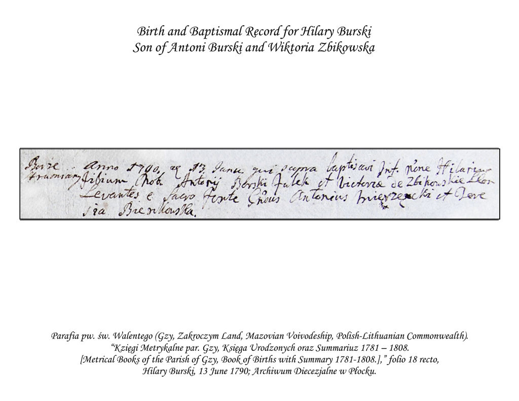 Birth and Baptismal Record for Hilary Burski Son of Antoni Burski and Wiktoria Zbikowska Parafia pw. św. Walentego (Gzy, Zakroczym Land, Mazovian Voivodeship, Polish-Lithuanian Commonwealth). “Kzięgi Metrykalne par. Gzy, Księga Urodzonych oraz Summariuz 1781 – 1808. [Metrical Books of the Parish of Gzy, Book of Births with Summary 1781-1808.],” folio 18 recto, Hilary Burski, 13 June 1790; Archiwum Diecezjalne w Płocku. Birth and Baptismal Record for Hilary Burski Son of Antoni Burski and Wiktoria Zbikowska Borze Anno 1790 die 13. Junu qui supra baptisavi Inf. Nne Hilarium Strumiany filium Nob. Antonij Borski Jalek et Victoria de Zbikowskie LCon Levantes e Sacro Fonte Gnous Antonius Mierzecki et Tere sia Bieszkowska. Borze In the year 1790, on the 13th day of June, I named above [Walenty Dębicki] baptized an Strumiany infant with the name Hilary, son of the nobles Antoni Burski “Jalek” and Wiktoria née Zbikowska, a legally married couple. The Godparents in the Sacred Font were the Nobles Antoni Mierzecki and Teresa Bieszkowska. Parafia pw. św. Walentego (Gzy, Zakroczym Land, Mazovian Voivodeship, Polish-Lithuanian Commonwealth). “Kzięgi Metrykalne par. Gzy, Księga Urodzonych oraz Summariuz 1781 – 1808. [Metrical Books of the Parish of Gzy, Book of Births with Summary 1781-1808.],” folio 18 recto, Hilary Burski, 13 June 1790; Archiwum Diecezjalne w Płocku.