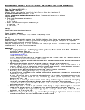 Regulamin Gry Miejskiej „Dookoła Kwidzyna z Kartą EURO26 Kwidzyn Moje Miasto” Data Gry Miejskiej: 22.04.2016 r. Rozpoczęcie: godz. 09:00 Miejsce zbiórki i rozpoczęcia: Teatr (Kwidzyńskie Centrum Kultury) ul. Katedralna 18 Planowane zakończenie: około godz. 13:00 Miejsce zakończenia i gali wręczenia nagród: Tereny Rekreacyjno-Wypoczynkowe „Miłosna” Organizatorzy: 1. Kwidzyńskie Stowarzyszenie Oświatowe ul. Chopina 4 82-500 Kwidzyn 2. Polskie Stowarzyszenie Projektów Młodzieżowych ul. Długi Targ 11/12 80-828 Gdańsk Zasięg: Obszar administracyjny miasta Kwidzyna. Grupa docelowa (adresat): Młodzież z Kwidzyna posiadająca Kartę EURO26 Kwidzyn Moje Miasto. Cel gry: Zobrazowanie funkcjonalności projektu Karty EURO26 Kwidzyn Moje Miasto oraz zaprezentowanie wszystkich partnerów projektu. Zbudowanie efektywnej komunikacji pomiędzy stronami projektu. Zachęcenie do korzystania z oferty kulturalnej, sportowej i naukowej Kwidzyna. Zdobycie umiejętności pracy w grupie. Pobudzenie do kreatywnego myślenia, nieszablonowego działania oraz aktywnej postawy na rzecz środowiska lokalnego. Zasady gry: 1. Do gry przystąpić mogą 4 osobowe grupy wraz z opiekunem, które w dniach 07.04.2016 – 17.04.2016 r. dokonały e-mailowej rejestracji. Adres na który należy przesłać zgłoszenie to: [email protected] W zgłoszeniu należy podać: Imiona i nazwiska, nr kart oraz nazwę szkoły wszystkich członków zespołu, a także imię i nazwisko opiekuna oraz wskazanie czy jest to nauczyciel czy rodzic uczniów. Do zgłoszenia Uczestnik zobowiązany jest przesłać skan podpisanej zgody rodzica lub opiekuna prawnego wg. wzoru z zał. nr 1. 2. Zadaniem uczestników jest pokonanie wskazanej trasy oraz wykonanie zadań punktowanych. Ilość zebranych punktów decyduje o końcowej klasyfikacji. Każda drużyna musi wykonać zadania w 6 punktach. Drużyny, które po zakończeniu rywalizacji zostaną sklasyfikowane z największą ilością punktów (I, II, III miejsce), otrzymają nagrody ufundowane przez Organizatorów. 3. Warunkiem udziału w grze jest posiadanie ważnej Karty EURO26 Kwidzyn Moje Miasto. 4. Uczestnicy gry, w trakcie jej trwania poruszają się wyłącznie pieszo. W każdym punkcie kontaktowym liczba graczy w zespole będzie weryfikowana z liczbą graczy oznaczoną na karcie drużyny wg zał. nr 2. W razie niezgodności gracze mogą zostać zdyskwalifikowani. W przypadku naruszenia regulaminu przez uczestnika gry, złamania zasad fair play, utrudniania gry innym graczom organizatorzy mają prawo wykluczenia drużyny z gry. Gra toczy się w normalnym ruchu miejskim, zatem należy zwrócić uwagę na zachowanie szczególnej ostrożności i stosowanie się do zaleceń opiekuna grupy. Zespoły uczestników będą rywalizowały i wykonywały postawione przed nimi zadania. Oceniane będą: pomysłowość, wiedza, kojarzenie faktów, praca zespołowa i orientacja w terenie. 5. Poprzez zgłoszenie do udziału w grze uczestnik wyraża zgodę na wzięcie udziału w grze na warunkach określonych w regulaminie oraz na przetwarzanie przez organizatorów danych osobowych uczestnika w zakresie niezbędnym dla przeprowadzenia gry (zgodnie z ustawą o ochronie danych osobowych z dnia 29.09.1997 (Dz. U. nr 133 poz. 883). 6. W kwestiach dotyczących przebiegu gry, nieprzewidzianych niniejszym regulaminem, a także w zakresie interpretacji regulaminu, głos rozstrzygający należy do organizatorów. Załącznik nr 1 Regulaminu Gry Miejskiej „Dookoła Kwidzyna z Kartą EURO26 Kwidzyn Moje Miasto” Gra Miejska „Dookoła Kwidzyna z Kartą EURO26 Kwidzyn Moje Miasto” Oświadczenie Rodzica/Opiekuna gracza na udział w Grze Miejskiej ……………………………………………………. (imię i nazwisko rodzica/opiekuna prawnego) ……………………………………………………. (nr kod i miejscowość) ……………………………………………………. (ulica, nr budynku i lokalu) ……………………………………………………. (tel. kontaktowy) Ja, …………………………………………………... niżej podpisany oświadczam, że: 1. wyrażam zgodę na udział mojego dziecka ……………………………………………………..…………. w Grze Miejskiej „Dookoła Kwidzyna z Kartą EURO26 Kwidzyn Moje Miasto” w dniu 22.04.2016 r. w godz. 09:00 -13:00, 2. zapoznałem się z Regulaminem Gry oraz akceptuję jego postanowienia, 3. wyrażam zgodę na samodzielny dojazd i powrót dziecka z miejsca Gry, 4. nie są mi znane żadne przeciwwskazania zdrowotne do wzięcia udziału przez moje dziecko w Grze. ………………………………………. …………………………………………… (miejscowość i data) (czytelny podpis) Załącznik nr 2 Regulaminu Gry Miejskiej „Dookoła Kwidzyna z Kartą EURO26 Kwidzyn Moje Miasto” Gra Miejska „Dookoła Kwidzyna z Kartą EURO26 Kwidzyn Moje Miasto” Karta drużyny nr…….. Uczestnicy gry (imię i nazwisko): 1…………………………………………… 2…………………………………………… 3…………………………………………… 4…………………………………………… Opiekun drużyny (imię i nazwisko)………………………………….. PUNKTACJA (wypełnia organizator punktu) Numer Nazwa punktu Lokalizacja ulice 1. START GRY Zespół Pieśni i Tańca „POWIŚLE”; Kino-Teatr Katedralna 18 2. Stowarzyszenie „Eko-Inicjatywa” Miłosna 1 3. Klub Sportowy Capoeira 4. Kwidzyńskie Centrum Sportu i Rekreacji 5. Związek Harcerstwa Polskiego Hufiec Kwidzyn Tereny RekreacyjnoWypoczynkowe „Miłosna” Wiejska 1A (Hala sportowa KCSiR) Wiejska 1A (Hala sportowa KCSiR) Warszawska 16 6. KONIEC GRY Miłosna 18 Punkty (1-5) Podpis i pieczątka organizatora punktu
