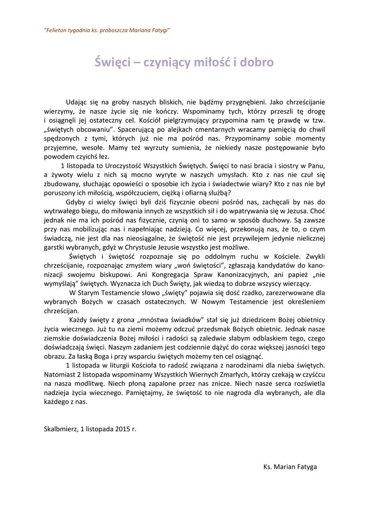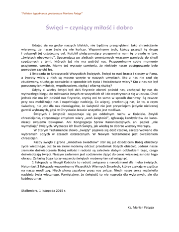 "Felieton tygodnia ks. proboszcza Mariana Fatygi" Święci – czyniący miłość i dobro Udając się na groby naszych bliskich, nie bądźmy przygnębieni. Jako chrześcijanie wierzymy, że nasze życie się nie kończy. Wspominamy tych, którzy przeszli tę drogę i osiągnęli jej ostateczny cel. Kościół pielgrzymujący przypomina nam tę prawdę w tzw. „świętych obcowaniu”. Spacerującą po alejkach cmentarnych wracamy pamięcią do chwil spędzonych z tymi, których już nie ma pośród nas. Przypominamy sobie momenty przyjemne, wesołe. Mamy też wyrzuty sumienia, że niekiedy nasze postępowanie było powodem czyichś łez. 1 listopada to Uroczystość Wszystkich Świętych. Święci to nasi bracia i siostry w Panu, a żywoty wielu z nich są mocno wyryte w naszych umysłach. Kto z nas nie czuł się zbudowany, słuchając opowieści o sposobie ich życia i świadectwie wiary? Kto z nas nie był poruszony ich miłością, współczuciem, ciężką i ofiarną służbą? Gdyby ci wielcy święci byli dziś fizycznie obecni pośród nas, zachęcali by nas do wytrwałego biegu, do miłowania innych ze wszystkich sił i do wpatrywania się w Jezusa. Choć jednak nie ma ich pośród nas fizycznie, czynią oni to samo w sposób duchowy. Są zawsze przy nas mobilizując nas i napełniając nadzieją. Co więcej, przekonują nas, że to, o czym świadczą, nie jest dla nas nieosiągalne, że świętość nie jest przywilejem jedynie nielicznej garstki wybranych, gdyż w Chrystusie Jezusie wszystko jest możliwe. Świętych i świętość rozpoznaje się po oddolnym ruchu w Kościele. Zwykli chrześcijanie, rozpoznając zmysłem wiary „woń świętości”, zgłaszają kandydatów do kanonizacji swojemu biskupowi. Ani Kongregacja Spraw Kanonizacyjnych, ani papież „nie wymyślają” świętych. Wyznacza ich Duch Święty, jak wiedzą to dobrze wszyscy wierzący. W Starym Testamencie słowo „święty” pojawia się dość rzadko, zarezerwowane dla wybranych Bożych w czasach ostatecznych. W Nowym Testamencie jest określeniem chrześcijan. Każdy święty z grona „mnóstwa świadków” stał się już dziedzicem Bożej obietnicy życia wiecznego. Już tu na ziemi możemy odczuć przedsmak Bożych obietnic. Jednak nasze ziemskie doświadczenia Bożej miłości i radości są zaledwie słabym odblaskiem tego, czego doświadczają święci. Naszym zadaniem jest codziennie dążyć do coraz większej jasności tego obrazu. Za łaską Boga i przy wsparciu świętych możemy ten cel osiągnąć. 1 listopada w liturgii Kościoła to radość związana z narodzinami dla nieba świętych. Natomiast 2 listopada wspominamy Wszystkich Wiernych Zmarłych, którzy czekają w czyśćcu na nasza modlitwę. Niech płoną zapalone przez nas znicze. Niech nasze serca rozświetla nadzieja życia wiecznego. Pamiętajmy, że świętość to nie nagroda dla wybranych, ale dla każdego z nas. Skalbmierz, 1 listopada 2015 r. Ks. Marian Fatyga