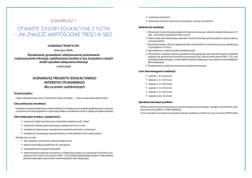 yy ewaluacja rozwiązania SCENARIUSZ 1 OTWARTE ZASOBY EDUKACYJNE Z FIZYKI – JAK ZNALEŹĆ WARTOŚCIOWE TREŚCI W SIECI SCENARIUSZ TEMATYCZNY dotyczący działu Wyszukiwanie, gromadzenie, selekcjonowanie, przetwarzanie i wykorzystywanie informacji, współtworzenie zasobów w sieci, korzystanie z różnych źródeł i sposobów zdobywania informacji z Informatyki yy prezentacja sposobu otrzymania rozwiązania i samego rozwiązania Zadania do realizacji: 1. Wykonanie ćwiczeń do poszczególnych lekcji scenariusza pt. „Otwarte Zasoby Edukacyjne z Fizyki – jak znaleźć wartościowe treści w sieci” 2.Wybór działu (lub określonego zjawiska) z Fizyki, do którego pomocą będzie rezultat wykonywanego projektu 3. Wyszukanie źródeł, z których będą pochodzić multimedialne i interaktywne zasoby dydaktyczne (i sporządzenie ich listy) 4. Zgromadzenie i selekcja zasobów dydaktycznych 5. Przemyślenie i zaproponowanie najbardziej atrakcyjnego sposobu zaprezentowania rezultatów projektu (np. prezentacja PowerPoint, prezentacja Prezi, witryna internetowa HTML + CSS, multimedialny plakat Glogster, multimedialna plansza edukacyjna, baza danych multimedialnych, film edukacyjny) 6.Przygotowanie i publiczna prezentacja rezultatu końcowego Czas (harmonogram) realizacji: SCENARIUSZ PROJEKTU EDUKACYJNEGO INTERDYSCYPLINARNEGO dla uczniów uzdolnionych Temat projektu: „Pakiet interaktywnych treści z przedmiotu Fizyka do działu … (nazwa wybranego działu Fizyki) ” Cele praktyczne (rezultaty): Rezultatem projektu będzie baza multimedialnych i interaktywnych zasobów dydaktycznych stanowiących pomoc do nauki zagadnień z wybranego działu z przedmiotu Fizyka w szkole ponadgimnazjalnej. Cele edukacyjne (wiedza, umiejętności): yy znajomość źródeł wartościowych materiałów dydaktycznych z fizyki yy znajomość strategii skuteczniejszego wyszukiwania treści w sieci yy umiejętność skutecznego wyszukiwania wartościowych treści w Internecie yy umiejętność atrakcyjnego zaprezentowania multimedialnych treści edukacyjnych Metody pracy ucznia: yy opis, dyskusja i zrozumienie sytuacji problemowej yy podanie specyfikacji problemów do rozwiązania yy zaprojektowanie rozwiązania (projekt) yy implementacja (realizacja) rozwiązania w atrakcyjnej postaci (np. prezentacja PowerPoint, prezentacja Prezi, witryna internetowa HTML + CSS, multimedialny plakat Glogster, multimedialna plansza edukacyjna, baza danych multimedialnych, film edukacyjny) yy Zadanie 1. (4 x 45 minut) yy Zadanie 2. (1 x 45 minut) yy Zadanie 3. (3 x 45 minut) yy Zadanie 4. (3 x 45 minut) yy Zadanie 5. (2 x 45 minut) yy Zadanie 6. (6 x 45 minut) Sposób prezentacji wyników: Publiczna prezentacja rozwiązania, przy użyciu komputera przenośnego z dostępem do Internetu, podłączonego do projektora multimedialnego. Innym sposobem prezentacji rozwiązania może być publikacja w Internecie, np. na witrynie WWW szkoły.