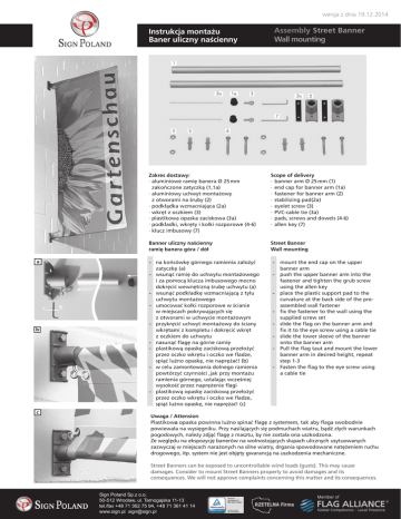 wersja z dnia 19.12.2014 Assembly Street Banner Wall mounting Instrukcja montażu Baner uliczny naścienny 1 3a 1a 3 2a 2 7 4 a b c 5 6 Zakres dostawy: · aluminiowe ramię banera Ø 25 mm zakończone zatyczką (1,1a) · aluminiowy uchwyt montażowy z otworami na śruby (2) · podkłądka wzmacniająca (2a) · wkręt z oczkiem (3) · plastikowa opaska zaciskowa (3a) · podkładki, wkręty i kołki rozporowe (4-6) · klucz imbusowy (7) Scope of delivery · banner arm Ø 25 mm (1) · end cap for banner arm (1a) · fastener for banner arm (2) · stabilizing pad(2a) · eyelet screw (3) · PVC-cable tie (3a) · pads, screws and dowels (4-6) · allen key (7) Banner uliczny naścienny ramię banera góra / dół Street Banner Wall mounting - na końcówkę górnego ramienia założyć zatyczkę (a) - wsunąć ramię do uchwytu montażowego i za pomocą klucza imbusowego mocno dokręcić wewnętrzną śrubę uchwytu (a) - wsunąć podkładkę wzmacniającą z tyłu uchwytu montażowego - umocować kołki rozporowe w ścianie w miejscach pokrywających się z otworami w uchwycie montażowym - przykręcić uchwyt montażowy do ściany wkrętami z kompletu i dokręcić wkręt z oczkiem do uchwytu - nasunąć flagę na górne ramię - plastikową opaskę zaciskową przełożyć przez oczko wkrętu i oczko we fladze, spiąć luźno opaskę, nie naprężać! (b) - w celu zamontowania dolnego ramienia powtórzyć czynności ,jak przy montażu ramienia górnego, ustalając wcześniej wysokość przez naprężenie flagi - plastikową opaskę zaciskową przełożyć przez oczko wkrętu i oczko we fladze, spiąć luźno opaskę, nie naprężać! (c) - - - - mount the end cap on the upper banner arm push the upper banner arm into the fastener and tighten the grub screw using the allen key place the plastic support pad to the curvature at the back side of the preassembled wall fastener fix the fastener to the wall using the supplied screw set slide the flag on the banner arm and fix it to the eye screw using a cable tie slide the lower sleeve of the banner onto the banner arm Pull the flag taut and mount the lower banner arm in desired height, repeat step 1-3 Fasten the flag to the eye screw using a cable tie Uwaga / Attension Plastikowa opaska powinna luźno spinać flagę z systemem, tak aby flaga swobodnie powiewała na wysięgniku. Przy nasilających się podmuchach wiatru, bądź złych warunkach pogodowych, należy zdjąć flagę z masztu, by nie została ona uszkodzona. Ze względu na ekspozycję banerów na wolnostojących słupach ulicznych usytuowanych zazwyczaj w miejscach narażonych na silne wiatry, drgania spowodowane natężeniem ruchu drogowego, itp. system nie jest objęty gwarancją na uszkodzenia mechaniczne. Street Banners can be exposed to uncontrollable wind loads (gusts). This may cause damages. Consider to mount Street Banners properly to avoid damages and its consequences. We will not approve complaints concerning this matter and its consequences. Sign Poland Sp.z o.o. 50-512 Wrocław, ul. Tarnogajska 11-13 tel./fax +48 71 362 75 94, +48 71 361 41 14 www.sign.pl [email protected]