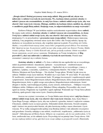 Orędzie Matki Bożej z 25. marca 2016 r. „Drogie dzieci! Dzisiaj przynoszę wam moją miłość. Bóg pozwolił mi, abym was miłowała i z miłości wzywała do nawrócenia. Wy, kochane dzieci, jesteście ubodzy w miłość i jeszcze nie zrozumieliście, że mój Syn Jezus z miłości oddał swoje życie, aby was zbawić i dać wam życie wieczne. Dlatego, módlcie się kochane dzieci, módlcie się, abyście w modlitwie pojęli Bożą miłość. Dziękuję wam, że odpowiedzieliście na moje wezwanie”. Królowo Pokoju! W tym krótkim orędziu sześciokrotnie wypowiadasz słowo miłość. Bo mamy mało miłości. Jesteśmy ubodzy w miłość i jeszcze nie zrozumieliśmy, że Jezus Twój Syn z miłości oddał swoje życie, aby nas zbawić i dać nam życie wieczne. Matko, dziękujemy Ci, że przychodzisz i przynosisz nam swoją miłość. Obdarowujesz matczyną miłością. I my pragniemy otwierać nasze życie dla Ciebie i dla Twojej miłości, łącząc się duchowo ze wszystkimi na świecie, aby wspólnie śpiewać tę pieśń: Przyszliśmy do Ciebie, Matko, z wszystkich krain naszej ziemi, nasze bóle i pragnienia przed oblicze Twe niesiemy. Ref: Spojrzyj na nas, by pocieszyć, połóż na nas rękę swoją, poleć nas Synowi Twemu, Matko świata i pokoju. Patrzy w Ciebie Kościół cały, jak na gwiazdę ocalenia. Osłoń wszystkich Swym ramieniem, oczyść serca i sumienia. Dziękujemy za Twoje świadectwo, iż Bóg pozwolił Ci, abyś nas miłowała i z miłością wzywała do nawrócenia. Pomóż nam zrozumieć i zanurzyć się w miłości Jezusa. Jesteśmy ubodzy w miłość, a Ty Jezu z miłości do nas ogołociłeś się ze wszystkiego, stałeś się pośmiewiskiem i skazańcem; oplutym – wyszydzonym – zmaltretowanym – ubiczowanym – odrzuconym – wzgardzonym… Ogołociłeś się ze wszystkiego: z mocy, z godności, z piękna, z szacunku, z podziwu, z entuzjazmu tłumów. Nie widać w Tobie Mistrza, Mesjasza ani Syna Bożego… Nie słychać Twego głosu. Wiodą Cię jak owcę na zabicie. Oddałeś swoje życie ludziom. Wydałeś się w ręce ludzi. W serce ludzi. W usta ludzi. W możliwości, zaradność i przewrotność ludzi. W potęgę ówczesnych i współczesnych opinii i poprawności. Jesteś błogosławionym cichym; błogosławionym, który cierpi prześladowania; błogosławionym, który w głębi swego serca płacze; błogosławionym miłosiernym. Jesteś ubogim w duchu, wprowadzającym pokój, czysty sercem, miłosiernym… Oddajesz wszystko. Oddajesz siebie. Oddajesz całe życie. Składasz Ofiarę całopalną. Przyszedłeś, aby rzucić ogień na ziemię. Pragnienie się wypełniło i ogień zapłonął. Wykonało się! Twoje Serce płonie miłością, spala grzech i daje nowe życie. Zmartwychwstanie. Jeszcze raz czytam i rozważam, co Twoja Matka nam dzisiaj mówi: mój Syn Jezus z miłości oddał swoje życie, aby was zbawić i dać wam życie wieczne. Jezu, Synu Maryi i Synu Boga Żywego, oddajesz życie, aby nas wybawić z grzechu, śmierci i wpływów szatana. Chrystusie, oddałeś życie za nasze grzechy. Dokonałeś dzieła zbawienia. Swoich cierpień, męki i śmierci nie przeżywałeś biernie, ale jako heroiczną walkę o nasze zbawienie i życie wieczne. W tę walkę zaangażowałeś pełnię swej Boskiej miłości i tak odniosłeś zwycięstwo nad grzechem. Grzechy zabijają w nas miłość, wrażliwość, współczucie, „oddawanie życia za innych”. Odwodzą nas od Słowa Życia: Miłujcie się wzajemnie, jak Ja was umiłowałem. A Ty Jezu, umiłowałeś nas, aż do oddania życia. Przywołuję też na pamięć inne Twoje słowa: Nikt nie ma większej miłości od tej, gdy ktoś życie swoje oddaje za przyjaciół swoich. Zbawicielu mój, tak właśnie uczyniłeś! A więc i ja muszę żyć kolejnym słowem Życia: Miłujcie waszych nieprzyjaciół. Jezu – Miłości zdradzona, pojmana, ubiczowana, cierniem zraniona, opluta, wyszydzona, przeklinana, na śmierć skazana i umierająca na krzyżu – do końca nas, często zawziętych nieprzyjaciół, umiłowałeś i wołałeś za nami do Ojca: Ojcze, przebacz im bo nie wiedzą co czynią. Jezu Chryste, Panie miły, o Baranku tak cierpliwy! Bądź uwielbiony w tej Miłości, w Twoim przebitym sercu, w Krwi Przenajświętszej. Twój Krzyż jest drzewem Życia. Jesteśmy ocaleni. Wielbimy Twoje Zmartwychwstanie. Dziękujemy za Komunię Świętą, a w niej za życie wieczne. Panie Jezu, jesteśmy świadomi jak daleko nam do Twej miłości – bezinteresownej, umierającej dla siebie, wynagradzającej. Jak w życzeniach, które otrzymałem, że kochać to wynagradzać, przyjmować czyjąś nędzę, grzech i błąd na siebie, aby go uwolnić i oddać czystego w ramiona Jezusa; kochać to zabierać wszelkie zło, a darować Dobro. Dlatego nawracajmy się i módlmy się abyśmy w modlitwie pojęli Bożą miłość – jak wzywa nas Królowa Pokoju w rozważanym dziś orędziu. Dawco Życia, Panie Zmartwychwstały, wyprowadzaj nas z grobów letniości, obojętności, rutyny i przyzwyczajeń. Dobry Pasterzu obroń nas przed pokusą znużenia. Obyśmy się nigdy nie zmęczyli nawróceniem, miłością i modlitwą. Amen. o. Eugeniusz Śpiołek Sch.P.