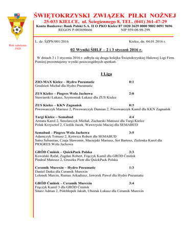 ŚWIĘTOKRZYSKI ZWIĄZEK PIŁKI NOŻNEJ 25-033 KIELCE, ul. Ściegiennego 8, TEL. (041) 361-47-29 Konto Bankowe: Bank Polski S.A. II O PKO Kielce 87 1020 2629 0000 9802 0091 9696 REGON P-003690666 NIP 959-08-98-299 L. dz. ŚZPN/001/2016 Rok założenia 1928 Kielce, dn. 04.01.2016 r. 02 Wyniki ŚHLF – 2 i 3 styczeń 2016 r. W dniach 2 i 3 stycznia 2016 r. odbyła się druga kolejka Świętokrzyskiej Halowej Ligi Firm. Poniżej prezentujemy wyniki poszczególnych spotkań: I Liga ZIO-MAX Kielce – Hydro Pneumatic Grudzień Michał dla Hydro Pneumatic 0:1 ZUS Kielce – Piogres Wola Jachowa Stawiarski Łukasz, Szymoniak Łukasz dla ZUS Kielce 2:0 ZUS Kielce – KKN Zagnańsk 0:3 Piwowarczyk Mariusz 2, Piwowarczyk Damian 2, Piwowarczyk Kamil dla KKN Zagnańsk Targi Kielce – Semabud 4:4 Armata Karol 2, Smolarczyk Michał, Zacharski Mateusz dla Targi Kielce Polak Krzysztof 2, Cieślik Jacek, Wawrzycki Maciej dla SEMABUD Semabud – Piogres Wola Jachowa 3:5 Adamczyk Tomasz 2, Kotwica Robert dla SEMABUD Satro Sebastian, Czaja Sławomir, Maciejski Mariusz, Sot Bartosz, Zielonka Karol dla PIOGRES Wola Jachowa GRÓD Ćmińsk – QuickPack Polska 3:3 Kowalski Rafał, Zagdan Robert, Frączyk Kamil dla GRÓD Ćmińsk Pindral Mateusz 2, Gruszka Piotr dla QuickPack Polska Ceramik Murexin – Hydro Pneumatic 1:3 Daniel Detka dla Ceramik Murexin Lelonek Marcin, Rumas Arkadiusz, Jaworek Paweł dla Hydro Pneumatic GRÓD Ćmińsk – Ceramik Murexin 3:4 Frączyk Kamil 3 dla GRÓD Ćmińsk Sitarz Adrian 2, Półchłopek Jakub, Ubożak Łukasz dla Ceramik Murexin L.p. I Liga ŚHLF 1. Hydro Pneumatic 2. KKN Zagnańsk 3. Targi Kielce 4. QuickPack Polska 5. ZIO-MAX 6. Oknomaks Łopuszno 7. ZUS Kielce 8. Ceramik Murexin 9. Piogres Wola Jachowa 10. Gród Ćmińsk 11. Semabud 12. URB Plus Mecze Punkty Bramki Różnica 3 2 2 2 2 2 4 3 2 2 3 1 9 6 4 4 3 3 3 3 3 1 1 0 9 1 6 0 12 5 7 4 5 1 8 6 4 21 6 10 5 5 6 7 7 14 0 1 8 6 7 3 4 2 -17 -4 0 -1 -7 -1 II Liga VELLER Kielce - TELEPROMO 3:1 Chmielewski Szymon, Tutaj Łukasz, Zdoliński Emil dla VELLER Kielce Papucki Mateusz dla TELEPROMO KIK BIS Instalacje Budowlane – AGMAT Małogoszcz 4:3 Zieliński Jacek 2, Kosiński Krzysztof 2 dla KIK BIS Instalacje Budowlane Janikowski Nikodem, Kosiniak Krystian dla AGMAT Małogoszcz VELLER Kielce – KIK BIS Instalacje Budowlane 0:7 Kmieć Łukasz 3, Zieliński Jacek 3, Kosiński Krzysztof dla KIK BIS Instalacje Budowlane NIBURSKI – Foto Alfa Kołodziejczyk Marcin 5, Góral Łukasz dla NIBURSKI Kowalczyk Piotr, Sękowski Piotr dla Foto Alfa 6:2 PŚK Fabet Konstrukcje – SKAN-COLOR Aluminium 4:3 Wawer Miłosz 2, Anioł Paweł, Kubicki Dominik dla PŚK Fabet Konstrukcje Urbanek Przemysław 2, Głuszek Rafał dla SKAN-COLOR Aluminium SKAN-COLOR Aluminium – McDonald’s Kielce 3:0 vo PŚK Fabet Konstrukcje – Elektro-Complex Strawczyn 3:5 Tekiel Jakub, Anioł Paweł dla PŚK Fabet Konstrukcje Majka Karol 2, Raczyński Tomasz, Majka Mateusz, Sternak Bartłomiej dla Elektro-Complex Strawczyn MMW Szalunki – TELEPROMO 9:3 Karol Grabalski 3, Czarwiński Marcin 2, Wojtasiński Grzegorz 2, Janaszek Dawid, Papros Bartłomiej dla MMW Szalunki Szlufik Arkadiusz 2, Zarzycki Cezary dla TELEPROMO AGMAT Małogoszcz – Elektro-Complex Strawczyn 2:3 Janikowski Nikodem, Kleszcz Filip dla AGMAT Małogoszcz Raczyński Tomasz 2, Majka Mateusz dla Elektro-Complex Strawczyn AGMAT Małogoszcz – Foto Alfa 2:4 Janikowski Nikodem, Walas Karol dla AGMAT Małogoszcz Sękowski Piotr 2, Miążek Paweł, Kowalski Łukasz dla Foto Alfa L.p. II Liga ŚHLF 1. NIBURSKI 2. KIK BIS Inst. Budow. 3. MMW Szalunki 4. AZS UJK Kielce 5. Elektro-Complex Strawczyn 6. PŚK Fabet Konstrukcje 7. Studnie.biz 8. Foto Alfa 9. VELLER Kielce 10. Skan-Color Aluminium 11. PHU Wojda Zeimmery 12. AGMAT Małogoszcz 13. McDonald's Kielce 14. Telepromo Mecze Punkty Bramki Różnica 3 3 3 2 3 2 2 4 2 2 1 4 2 3 9 9 9 6 6 3 3 3 3 3 0 0 0 0 21 15 14 13 11 7 9 8 3 6 2 10 2 5 6 5 6 3 12 8 7 13 8 4 3 18 13 20 15 10 8 10 -1 -1 2 -5 -5 2 -1 -8 -11 -15 Otrzymują: - „Echo Dnia” - „Gazeta Wyborcza” - „Kielecka Piłka” Z poważaniem Sekretarz Świętokrzyskiego ZPN Arkadiusz Krala