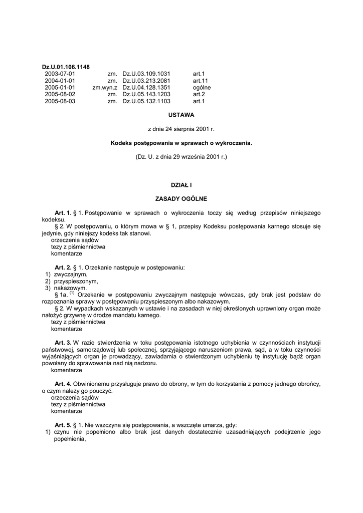 Dz.U.01.106.1148 2003-07-01 zm. Dz.U.03.109.1031 2004-01-01 zm. Dz.U.03.213.2081 2005-01-01 zm.wyn.z Dz.U.04.128.1351 2005-08-02 zm. Dz.U.05.143.1203 2005-08-03 zm. Dz.U.05.132.1103 art.1 art.11 ogólne art.2 art.1 USTAWA z dnia 24 sierpnia 2001 r. Kodeks postępowania w sprawach o wykroczenia. (Dz. U. z dnia 29 września 2001 r.) DZIAŁ I ZASADY OGÓLNE Art. 1. § 1. Postępowanie w sprawach o wykroczenia toczy się według przepisów niniejszego kodeksu. § 2. W postępowaniu, o którym mowa w § 1, przepisy Kodeksu postępowania karnego stosuje się jedynie, gdy niniejszy kodeks tak stanowi. orzeczenia sądów tezy z piśmiennictwa komentarze Art. 2. § 1. Orzekanie następuje w postępowaniu: 1) zwyczajnym, 2) przyspieszonym, 3) nakazowym. § 1a. (1) Orzekanie w postępowaniu zwyczajnym następuje wówczas, gdy brak jest podstaw do rozpoznania sprawy w postępowaniu przyspieszonym albo nakazowym. § 2. W wypadkach wskazanych w ustawie i na zasadach w niej określonych uprawniony organ może nałożyć grzywnę w drodze mandatu karnego. tezy z piśmiennictwa komentarze Art. 3. W razie stwierdzenia w toku postępowania istotnego uchybienia w czynnościach instytucji państwowej, samorządowej lub społecznej, sprzyjającego naruszeniom prawa, sąd, a w toku czynności wyjaśniających organ je prowadzący, zawiadamia o stwierdzonym uchybieniu tę instytucję bądź organ powołany do sprawowania nad nią nadzoru. komentarze Art. 4. Obwinionemu przysługuje prawo do obrony, w tym do korzystania z pomocy jednego obrońcy, o czym należy go pouczyć. orzeczenia sądów tezy z piśmiennictwa komentarze Art. 5. § 1. Nie wszczyna się postępowania, a wszczęte umarza, gdy: 1) czynu nie popełniono albo brak jest danych dostatecznie uzasadniających podejrzenie jego popełnienia, 2) 3) 4) 5) 6) czyn nie zawiera znamion wykroczenia albo ustawa stanowi, że sprawca nie popełnia wykroczenia, ustawa stanowi, że sprawca nie podlega karze, nastąpiło przedawnienie orzekania, obwiniony zmarł, obwiniony jest: a) uwierzytelnionym w Rzeczypospolitej Polskiej, szefem przedstawicielstwa dyplomatycznego państwa obcego, b) osobą należącą do personelu dyplomatycznego tego przedstawicielstwa, c) osobą należącą do personelu administracyjnego lub technicznego tego przedstawicielstwa, d) członkiem rodziny osób wymienionych w lit. a)-c) i pozostaje z nimi we wspólnocie domowej, e) inną osobą korzystającą z immunitetu dyplomatycznego, na podstawie ustaw, umów lub powszechnie uznanych zwyczajów międzynarodowych, f) kierownikiem urzędu konsularnego lub innym urzędnikiem konsularnym państwa obcego albo inną osobą zrównaną z nimi na podstawie ustaw, umów lub powszechnie uznanych zwyczajów międzynarodowych, 7) obwiniony z mocy przepisów szczególnych nie podlega orzecznictwu na podstawie niniejszego kodeksu, 8) postępowanie co do tego samego czynu obwinionego zostało prawomocnie zakończone lub wcześniej wszczęte, toczy się, 9) brak jest skargi uprawnionego oskarżyciela albo żądania ścigania pochodzącego od osoby uprawnionej lub zezwolenia na ściganie, gdy ustawa tego wymaga, 10) zachodzi inna okoliczność wyłączająca z mocy ustawy orzekanie w postępowaniu na podstawie niniejszego kodeksu. § 2. Przepisu § 1 pkt 6 nie stosuje się: 1) do osób w nim wymienionych, jeżeli są obywatelami polskimi lub mają w Polsce miejsce stałego zamieszkania, przy czym osoby, o których mowa w lit. f), nie podlegają orzecznictwu na podstawie niniejszego kodeksu, tylko w zakresie czynności pełnionych w toku i w wykonaniu funkcji urzędowych, 2) jeżeli umowa międzynarodowa, której Rzeczpospolita Polska jest stroną, stanowi inaczej. § 3. Przepisu § 1 pkt 6 można nie stosować do obywatela państwa obcego, z którym nie ma w tym przedmiocie umowy, a państwo to nie zapewnia wzajemności. § 4. Do chwili otrzymania wymaganego przez ustawę zezwolenia na ściganie lub żądania ścigania organ prowadzący czynności wyjaśniające może dokonywać czynności niecierpiących zwłoki w celu zabezpieczenia śladów i dowodów, a także czynności zmierzających do wyjaśnienia, czy żądanie będzie złożone lub zezwolenie będzie wydane. orzeczenia sądów tezy z piśmiennictwa komentarze wzory Art. 6. § 1. W sprawach o wykroczenia ścigane na żądanie pokrzywdzonego występujący z wnioskiem o ukaranie, jeżeli nie jest nim pokrzywdzony, powinien uzyskać wymagane żądanie od osoby uprawnionej do jego złożenia. Żądanie może być złożone na piśmie albo zgłoszone ustnie do protokołu. § 2. Żądanie złożone co do niektórych tylko współdziałających w popełnieniu czynu pozostaje skuteczne także wobec osób niewskazanych w żądaniu, jeżeli nie są to osoby najbliższe dla pokrzywdzonego, o czym należy pouczyć składającego żądanie przed jego przyjęciem. § 3. Żądanie może być cofnięte. Niedopuszczalne jest cofnięcie żądania wobec niektórych tylko współdziałających w popełnieniu czynu, chyba że są to osoby najbliższe dla pokrzywdzonego. Cofnięcie może nastąpić do momentu rozpoczęcia przewodu sądowego na pierwszej rozprawie. W razie cofnięcia żądania ponowne jego złożenie jest niedopuszczalne. § 4. Jeżeli wniosek o ukaranie pochodzi od pokrzywdzonego, odstąpienie przez niego od popierania takiego wniosku oznacza także odstąpienie przez niego od popierania żądania ścigania. tezy z piśmiennictwa komentarze wzory Art. 7. Policja i inne organy w zakresie postępowania w sprawach o wykroczenia wykonują polecenia sądu oraz prowadzą w granicach określonych w ustawie czynności wyjaśniające. komentarze Art. 8. W postępowaniu uregulowanym w niniejszym kodeksie stosuje się odpowiednio przepisy art. 2, 4, 5, 7-9, 13, 14, 15 § 2, art. 16, 18 § 2, art. 20 i 23 Kodeksu postępowania karnego. tezy z piśmiennictwa projekty ustaw komentarze DZIAŁ II SĄD Rozdział 1 Właściwość i skład sądu Art. 9. § 1. W sprawach o 