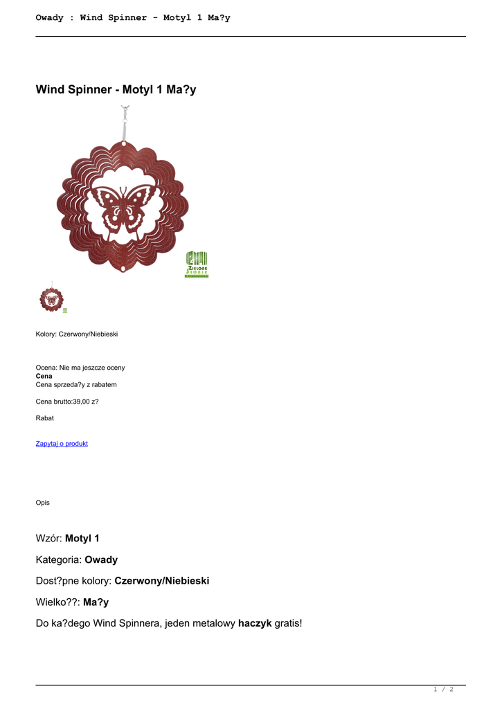 Owady : Wind Spinner - Motyl 1 Ma?y Wind Spinner - Motyl 1 Ma?y Kolory: Czerwony/Niebieski Ocena: Nie ma jeszcze oceny Cena Cena sprzeda?y z rabatem Cena brutto:39,00 z? Rabat Zapytaj o produkt Opis Wzór: Motyl 1 Kategoria: Owady Dost?pne kolory: Czerwony/Niebieski Wielko??: Ma?y Do ka?dego Wind Spinnera, jeden metalowy haczyk gratis! 1 / 2 Owady : Wind Spinner - Motyl 1 Ma?y Wind Spinnery czyli ozdoby ze stali nierdzewnej, które poruszaj?c si? na wietrze lub przy pomocy silniczka, tworz? pi?kn? iluzj? trójwymiarowo?ci. Je?eli chcesz dowiedzie? si? wi?cej na ich temat, kliknij tutaj. Opinie Nikt jeszcze nie recenzowa? tego produktu. 2 / 2 Powered by TCPDF (www.tcpdf.org)