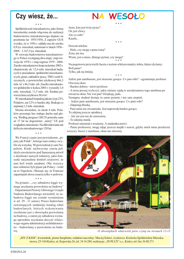 Czy wiesz, ¿e... *** Spó³dzielczoæ mieszkaniowa, jako forma inwestorska zosta³a w³¹czona do realizacji budownictwa mieszkaniowego dopiero na prze³omie lat 1955/1956. Z zapisów GUS wynika, ¿e w 1956 r. odda³a ona do u¿ytku 0,8 tys. mieszkañ, natomiast w latach 1956 2004 3.167,3 tys. mieszkañ. W rozwoju budownictwa mieszkaniowego w Polsce wystêpuj¹ dwa etapy: etap rozwoju do 1978 r. i etap regresu 1979 - 2004. Zasoby mieszkaniowe kraju na koniec 2003 r. obejmowa³y ok. 12,6 mln. mieszkañ bêd¹cych w posiadaniu: spó³dzielni mieszkaniowych, gmin, zak³adów pracy, TBS i osób fizycznych, o powierzchni u¿ytkowej 866,3 mln. m2 z 46,3 mln. izb. Zasoby mieszkaniowe spó³dzielni w koñcu 2003 r. wynosi³y 3,4 mln. mieszkañ, 11,5 mln. izb. rednia powierzchnia u¿ytkowa 50,4 m2. W mieszkaniach kiepskiej jakoci ¿yje 23% Polaków, za 12% w bardzo z³ej. Brakuje co najmniej 1,5 mln. mieszkañ. Mo¿na stwierdziæ, ¿e oko³o 4 mln. Polaków pozostaje bez sta³ego dachu nad g³ow¹. Wed³ug prognoz OECD potrzeba nam a¿ 37 lat na dogonienie starej UE pod wzglêdem zamo¿noci. Na zlikwidowanie za deficytu mieszkaniowego 120 lat. *** We Francji czêste jest powiedzenie pijany jak Polak, którego nasi rodacy zwykle siê wstydz¹. Wypowiedzia³ je sam Napoleon. Kiedy zachwycony szar¿¹ polskich szwole¿erów pod Samosierr¹ mówi³ o dzielnoci naszych ¿o³nierzy, jaki francuski nacjonalista doniós³ cesarzowi, ¿e nasi byli wtedy nar¹bani. Oby wszyscy nasi ¿o³nierze byli pijani jak Polacy - rzek³ na to Napoleon. Okazuje siê, ¿e Francuzi zapamiêtali s³owa cesarza tylko w po³owie. *** Na pytanie: czy zabudowa loggii wymaga uzyskania pozwolenia na budowê - Departament Prawny G³ównego Urzêdu Nadzoru Budowlanego stwierdzi³, ¿e zabudowa loggii nie zosta³a wymieniona w art. 29 - 31 ustawy Prawo budowlane zawieraj¹cych zamkniêty katalog robót budowlanych, których wykonywanie zwolnione jest z obowi¹zku pozwolenia na budowê, a zatem jej zabudowa wymaga uprzednio uzyskania decyzji w³aciwego organu administracji architektoniczno - budowlanej o pozwoleniu na budowê. NA WESO O£O O Jasiu, kim jest twój ojciec? On jest chory. Ale co robi? Kaszle... *** *** Dzwoni telefon: - Halo, czy mogê z pana ¿on¹? ¯ony nie ma. Wiem, jest u mnie, dlatego pytam, czy mogê? *** Na pogotowie przywieli faceta z no¿em wbitym miêdzy ¿ebra, lekarz dy¿urny: Boli pana? Tylko, jak siê miejê. *** Jedzie pan autobusem, jest strasznie gor¹co. Co pan robi? - egzaminuje profesor. Otworzê okno. - Bardzo dobrze - mówi profesor. - A teraz proszê wyliczyæ, jakie zmiany zajd¹ w aerodynamice tego autobusu po otwarciu okna. Nie wie pan? Dziêkujê, pa³a. Nastêpny student dostaje to samo pytanie i ten sam stopieñ. - Jedzie pani autobusem, jest strasznie gor¹co. Co pani robi? - Zdejmujê bluzkê. - Pani mnie nie zrozumia³a. Jest naprawdê bardzo gor¹co. To zdejmê jeszcze spódnicê. - Ale ¿ar jest nie do zniesienia. - To zdejmê stanik. Profesor oniemia³ z wra¿enia. A studentka mówi: - Panie profesorze, mogê zdj¹æ jeszcze majtki i nawet, gdyby mieli mnie przelecieæ wszyscy faceci z autobusu, okna nie otworzê. O obowi¹zkach w³acicieli psów czytaj na stronach 12-13 MY Z KSM, kwartalnik, pismo bezp³atne, redaktor naczelny: Maciej Solarz, wydawca: Kielecka Spó³dzielnia Mieszkaniowa, 25-344 Kielce, ul. Kujawska 26, tel. 34 16 280, realizacja: IN PLUS s.c., Kielce, tel./fax 36 88 271 STRONA 20