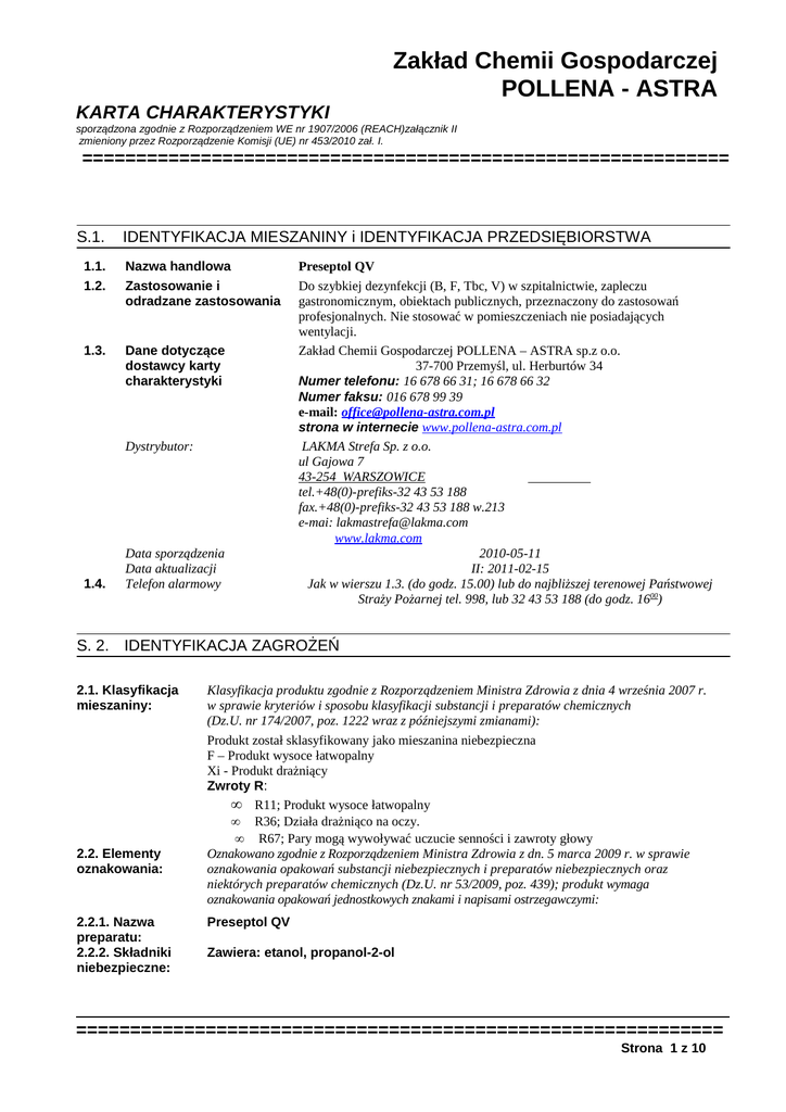 Zakład Chemii Gospodarczej POLLENA - ASTRA KARTA CHARAKTERYSTYKI sporządzona zgodnie z Rozporządzeniem WE nr 1907/2006 (REACH)załącznik II zmieniony przez Rozporządzenie Komisji (UE) nr 453/2010 zał. I. ============================================================ S.1. IDENTYFIKACJA MIESZANINY i IDENTYFIKACJA PRZEDSIĘBIORSTWA 1.1. 1.2. Nazwa handlowa Zastosowanie i odradzane zastosowania 1.3. Dane dotyczące dostawcy karty charakterystyki Dystrybutor: 1.4. Data sporządzenia Data aktualizacji Telefon alarmowy Preseptol QV Do szybkiej dezynfekcji (B, F, Tbc, V) w szpitalnictwie, zapleczu gastronomicznym, obiektach publicznych, przeznaczony do zastosowań profesjonalnych. Nie stosować w pomieszczeniach nie posiadających wentylacji. Zakład Chemii Gospodarczej POLLENA – ASTRA sp.z o.o. 37-700 Przemyśl, ul. Herburtów 34 Numer telefonu: 16 678 66 31; 16 678 66 32 Numer faksu: 016 678 99 39 e-mail: [email protected] strona w internecie www.pollena-astra.com.pl LAKMA Strefa Sp. z o.o. ul Gajowa 7 43-254 WARSZOWICE tel.+48(0)-prefiks-32 43 53 188 fax.+48(0)-prefiks-32 43 53 188 w.213 e-mai: [email protected] www.lakma.com 2010-05-11 II: 2011-02-15 Jak w wierszu 1.3. (do godz. 15.00) lub do najbliższej terenowej Państwowej Straży Pożarnej tel. 998, lub 32 43 53 188 (do godz. 1600) S. 2. IDENTYFIKACJA ZAGROŻEŃ 2.1. Klasyfikacja mieszaniny: 2.2. Elementy oznakowania: 2.2.1. Nazwa preparatu: 2.2.2. Składniki niebezpieczne: Klasyfikacja produktu zgodnie z Rozporządzeniem Ministra Zdrowia z dnia 4 września 2007 r. w sprawie kryteriów i sposobu klasyfikacji substancji i preparatów chemicznych (Dz.U. nr 174/2007, poz. 1222 wraz z późniejszymi zmianami): Produkt został sklasyfikowany jako mieszanina niebezpieczna F – Produkt wysoce łatwopalny Xi - Produkt drażniący Zwroty R: • R11; Produkt wysoce łatwopalny • R36; Działa drażniąco na oczy. • R67; Pary mogą wywoływać uczucie senności i zawroty głowy Oznakowano zgodnie z Rozporządzeniem Ministra Zdrowia z dn. 5 marca 2009 r. w sprawie oznakowania opakowań substancji niebezpiecznych i preparatów niebezpiecznych oraz niektórych preparatów chemicznych (Dz.U. nr 53/2009, poz. 439); produkt wymaga oznakowania opakowań jednostkowych znakami i napisami ostrzegawczymi: Preseptol QV Zawiera: etanol, propanol-2-ol ============================================================ Strona 1 z 10 Zakład Chemii Gospodarczej POLLENA - ASTRA KARTA CHARAKTERYSTYKI sporządzona zgodnie z Rozporządzeniem WE nr 1907/2006 (REACH)załącznik II zmieniony przez Rozporządzenie Komisji (UE) nr 453/2010 zał. I. ============================================================ 2.2.3. Symbole, zwroty i napisy ostrzegawcze: F – Produkt wysoce łatwopalny Zwroty R: Zwroty S: 2.3. Inne zagrożenia: • • • Xi - Produkt drażniący R11; Produkt wysoce łatwopalny R36; Działa drażniąco na oczy. R67; Pary mogą wywoływać uczucie senności i zawroty głowy S 7 - Przechowywać pojemnik szczelnie zamknięty S 16 - Nie przechowywać w pobliżu źródeł zapłonu - nie palić tytoniu S 26 - Zanieczyszczone oczy przemyć natychmiast dużą ilością wody i zasięgnąć porady lekarza S35 - Usuwać produkt i jego opakowanie w sposób bezpieczny S46 – W razie połknięcia niezwłocznie zasięgnij porady lekarza – pokaż opakowanie lub etykietą S51- Stosować wyłącznie w dobrze wentylowanych pomieszczeniach. Napisy dodatkowe Nieznane S. 3. SKŁAD/INFORMACJA O SKŁADNIKACH Składniki niebezpieczne zawarte w produkcie: Nazwa substancji/INCI name Etanol 96 v/v INCI name: ethanol Propan-2-ol INCI name; isopropyl alcohol N-(3aminopropylo)-Ndodecylopropano1,3-diamina INCI name: nr indeksowy nr WE 603-00200-5 200-578-6 603-11700-0 200-661-7 219-1458 % wagowy Symbol zagrożenia Zwroty R brak 50,00% F R11 67-63-0 brak 20,00% F Xi R11 R36; R67 2372-82-9: brak 0,135% C Xn N R34 R22 R50 nr CAS 64-17-5 Nr rej. (pełne brzmienie zwrotów R podano w punkcie 16) S. 4. ŚRODKI PIERWSZEJ POMOCY 4.1. Opis środków pierwszej pomocy Uwagi ogólne : Natychmiast wyprowadzić poszkodowanego na świeże powietrze. W przypadku wystąpienia ============================================================ Strona 2 z 10 Zakład Chemii Gospodarczej POLLENA - ASTRA KARTA CHARAKTERYSTYKI sporządzona zgodnie z Rozporządzeniem WE nr 1907/2006 (REACH)załącznik II zmieniony przez Rozporządzenie Komisji (UE) nr 453/2010 zał. I. ============================================================ Nazwa substancji/INCI name nr indeksowy nr WE nr CAS Nr rej. % wagowy Symbol zagrożenia Zwroty R (pełne brzmienie zwrotów R podano w punkcie 16) jakichkolwiek niepokojących objawów wezwać natychmiast lekarza lub odwieźć poszkodowanego do szpitala, pokazać opakowanie preparatu lub etykietę. Wdychanie: W przypadku zatrzymania oddechu zastosować sztuczne oddychanie. Zapewnić poszkodowanemu ciepło i warunki do odpoczynku. Wezwać natychmiast pomoc medyczną. Skóra: Zdjąć skażoną odzież. Natychmiast umyć skórę dużą ilością letniej wody, najlepiej bieżącej. W przypadku podrażnienia skóry (zaczerwienienie) skonsultować się natychmiast z lekarzem. Oczy: Zdjąć szkła kontaktowe. Natychmiast przemywać oczy dużą ilością letniej wody co najmniej 15 min. (przy odwiniętych powiekach), unikać silnego strumienia wody ze względu na ryzyko uszkodzenia rogówki, w przypadku zanieczyszczenia jednego oka, chronić w trakcie przemywania drugie oko przed zanieczyszczeniem. Skonsultować się natychmiast z lekarzem okulistą!. Uwaga: osoby narażone na skażenie oczu powinny być pouczone o konieczności i sposobie ich natychmiastowego płukania. Połknięcie : Wypłukać usta wodą. Nie powodować wymiotów. Podać do wypicia białka jaj kurzych, mleko lub wodę. Wezwać natychmiast pomoc medyczną. UWAGA! Pacjenta nieprzytomnego ułożyć w pozycji bocznej ustalonej, zapewnić zatrutemu spokój, chronić przed utratą ciepła, kontrolować oddech i puls. Nigdy nie w