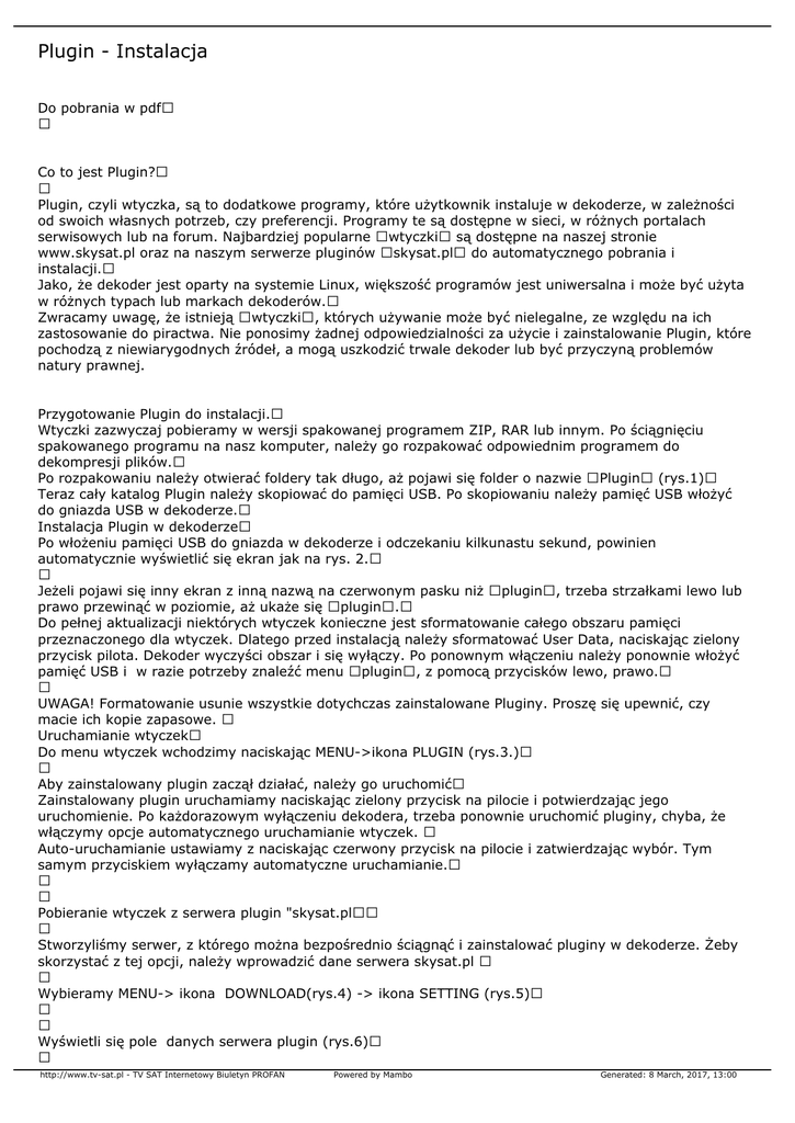 Plugin - Instalacja Do pobrania w pdf Co to jest Plugin? Plugin, czyli wtyczka, są to dodatkowe programy, które użytkownik instaluje w dekoderze, w zależności od swoich własnych potrzeb, czy preferencji. Programy te są dostępne w sieci, w różnych portalach serwisowych lub na forum. Najbardziej popularne wtyczki są dostępne na naszej stronie www.skysat.pl oraz na naszym serwerze pluginów skysat.pl do automatycznego pobrania i instalacji. Jako, że dekoder jest oparty na systemie Linux, większość programów jest uniwersalna i może być użyta w różnych typach lub markach dekoderów. Zwracamy uwagę, że istnieją wtyczki, których używanie może być nielegalne, ze względu na ich zastosowanie do piractwa. Nie ponosimy żadnej odpowiedzialności za użycie i zainstalowanie Plugin, które pochodzą z niewiarygodnych źródeł, a mogą uszkodzić trwale dekoder lub być przyczyną problemów natury prawnej. Przygotowanie Plugin do instalacji. Wtyczki zazwyczaj pobieramy w wersji spakowanej programem ZIP, RAR lub innym. Po ściągnięciu spakowanego programu na nasz komputer, należy go rozpakować odpowiednim programem do dekompresji plików. Po rozpakowaniu należy otwierać foldery tak długo, aż pojawi się folder o nazwie Plugin (rys.1) Teraz cały katalog Plugin należy skopiować do pamięci USB. Po skopiowaniu należy pamięć USB włożyć do gniazda USB w dekoderze. Instalacja Plugin w dekoderze Po włożeniu pamięci USB do gniazda w dekoderze i odczekaniu kilkunastu sekund, powinien automatycznie wyświetlić się ekran jak na rys. 2. Jeżeli pojawi się inny ekran z inną nazwą na czerwonym pasku niż plugin, trzeba strzałkami lewo lub prawo przewinąć w poziomie, aż ukaże się plugin. Do pełnej aktualizacji niektórych wtyczek konieczne jest sformatowanie całego obszaru pamięci przeznaczonego dla wtyczek. Dlatego przed instalacją należy sformatować User Data, naciskając zielony przycisk pilota. Dekoder wyczyści obszar i się wyłączy. Po ponownym włączeniu należy ponownie włożyć pamięć USB i w razie potrzeby znaleźć menu plugin, z pomocą przycisków lewo, prawo. UWAGA! Formatowanie usunie wszystkie dotychczas zainstalowane Pluginy. Proszę się upewnić, czy macie ich kopie zapasowe. Uruchamianie wtyczek Do menu wtyczek wchodzimy naciskając MENU->ikona PLUGIN (rys.3.) Aby zainstalowany plugin zaczął działać, należy go uruchomić Zainstalowany plugin uruchamiamy naciskając zielony przycisk na pilocie i potwierdzając jego uruchomienie. Po każdorazowym wyłączeniu dekodera, trzeba ponownie uruchomić pluginy, chyba, że włączymy opcje automatycznego uruchamianie wtyczek. Auto-uruchamianie ustawiamy z naciskając czerwony przycisk na pilocie i zatwierdzając wybór. Tym samym przyciskiem wyłączamy automatyczne uruchamianie. Pobieranie wtyczek z serwera plugin "skysat.pl Stworzyliśmy serwer, z którego można bezpośrednio ściągnąć i zainstalować pluginy w dekoderze. Żeby skorzystać z tej opcji, należy wprowadzić dane serwera skysat.pl Wybieramy MENU-> ikona DOWNLOAD(rys.4) -> ikona SETTING (rys.5) Wyświetli się pole danych serwera plugin (rys.6) http://www.tv-sat.pl - TV SAT Internetowy Biuletyn PROFAN Powered by Mambo Generated: 8 March, 2017, 13:00 - czerwonym przyciskiem otwieramy pole do wprowadzenia adresu serwera: skysat.pl (rys.7) - zielonym przyciskiem wprowadzamy login: (pole pozostawiamy puste serwer skysat.pl nie wymaga logowania) - żółtym przyciskiem wprowadzamy hasło: (pole pozostawiamy puste - serwer skysat.pl nie wymaga logowania) Zestaw znaków zmieniamy przyciskiem niebieskim, kursor przesuwamy zaznaczając , wprowadzone błędnie znaki usuwamy naciskając zielony przycisk, spacje wprowadzamy żółtym przyciskiem, całość po wprowadzeniu zatwierdzamy przyciskiem czerwonym. Wartości numeryczne wprowadzamy bezpośrednio z klawiatury numerycznej pilota. Po wprowadzeniu danych serwera, wychodzimy z tej opcji, naciskając Menu i wybieramy ikonę Plugin (rys.8). Jeżeli dane serwera zostały prawidłowo wprowadzone, wyświetli się ekran jak na rys.9. Pluginy są zapisane w katalogach tematycznych. Do listy plików z pluginami przechodzimy naciskając przycisk -> na pilocie (rys.10) UWAGA! Zanim pobierzemy i zainstalujemy pluginy, prosimy wykonać następujące czynności: - Zapoznań się z opisem i działaniem wtyczki, którą chcemy zainstalować. Opis znajdziemy na stronie www.skysat.pl lub w artykule Pluginy do instalacji - Pluginy do pobrania mają po lewej stronie nazwy pole zaznaczeniu wyboru. Najpierw należy przyciskiem OK. odznaczyć te pluginy, których nie chcemy pobrać. - Przed pobraniem i instalacją nowych pluginów, należy zatrzymać działanie pluginów już zainstalowanych! Zapobiegnie to zawieszeniu się dekodera. Pluginy pobieramy i instalujemy naciskając czerwony przycisk na pilocie. Po pobraniu i prawidłowym zainstalowa-niu, wyświetli się informacja installation complete succesfully lub instalation failed w przypadku niepowodzenia. Przy wyjściu z menu, pojawi się zapytanie, czy chcemy zresetować dekoder proszę wybrać TAK, ponieważ większość pluginów instaluje się do końca po resecie. Listy kanałów do pobrania z serwera pluginów skysat.pl Na serwerze skysat.pl umieściliśmy aktualne listy kanałów dla różnych platform satelitarnych (CYFRA+, Cyfrowy Polsat, N oraz różnych satelitów jak Hot Bird, Astra itd.). Po wyświetlenie listy folderów z pluginami (rys.11.), wybieramy folder Listy kanałów. Wyświetli się ekran z gotowymi listami do pobrania. UWAGA! Odznaczamy listy, których nie pobieramy, pozostawiając zaznaczenie naszej wybranej listy (w przeciwnym wypadku dekoder i tak zainstaluje ostatnia z list na wykazie) Po pobraniu listy kanałów, przy wyjściu z menu należy koniecznie zresetować dekoder, wybierając TAK, inaczej lista się nie zainstaluje. Po pobraniu, należy ustawić ponownie funkcje DISEqC, przypisując http://www.tv-sat.