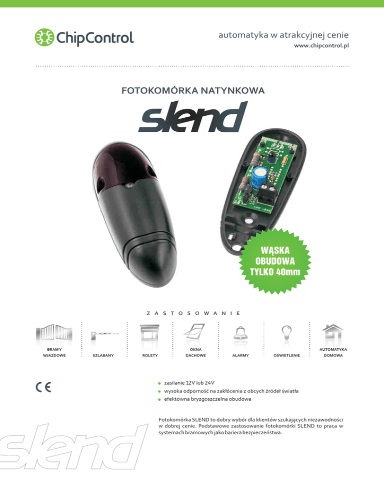 automatyka w atrakcyjnej cenie www.chipcontrol.pl FOTOKOMÓRKA NATYNKOWA WĄSKA OBUDOWA TYLKO 40mm Z A S T O S O W A N I E BRAMY WJAZDOWE AUTOMATYKA OKNA SZLABANY ROLETY DACHOWE ALARMY OŚWIETLENIE DOMOWA zasilanie 12V lub 24V wysoka odporność na zakłócenia z obcych źródeł światła efektowna bryzgoszczelna obudowa Fotokomórka SLEND to dobry wybór dla klientów szukających niezawodności w dobrej cenie. Podstawowe zastosowanie fotokomórki SLEND to praca w systemach bramowych jako bariera bezpieczeństwa. FOTOKOMÓRKA NATYNKOWA Wymiary 41 mm 40 m m 110 mm Specyfikacja gwarantowany zasięg działania: 15m zasilanie odbiornika i nadajnika: 12VDC, 24V AC/DC temperatura pracy: od -20° do +55°C gabaryty zewnętrzne obudowy: 40x41x110 mm sposób montażu: obudowa natynkowa materiał obudowy: ABS, poliwęglanowe klosze wyjście stykowe: typu NC interfejs użytkownika: dioda sygnalizująca synchronizację promienia nadajnika z odbiornikiem ul. Brzeska 7, PL 85-145 Bydgoszcz, tel./fax +48 52 340 15 83 e-mail: [email protected] www.chipcontrol.pl