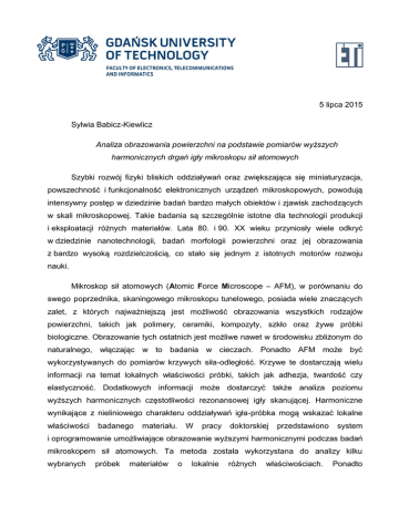 5 lipca 2015 Sylwia Babicz-Kiewlicz Analiza obrazowania powierzchni na podstawie pomiarów wyższych harmonicznych drgań igły mikroskopu sił atomowych Szybki rozwój fizyki bliskich oddziaływań oraz zwiększająca się miniaturyzacja, powszechność i funkcjonalność elektronicznych urządzeń mikroskopowych, powodują intensywny postęp w dziedzinie badań bardzo małych obiektów i zjawisk zachodzących w skali mikroskopowej. Takie badania są szczególnie istotne dla technologii produkcji i eksploatacji różnych materiałów. Lata 80. i 90. XX wieku przyniosły wiele odkryć w dziedzinie nanotechnologii, badań morfologii powierzchni oraz jej obrazowania z bardzo wysoką rozdzielczością, co stało się jednym z istotnych motorów rozwoju nauki. Mikroskop sił atomowych (Atomic Force Microscope – AFM), w porównaniu do swego poprzednika, skaningowego mikroskopu tunelowego, posiada wiele znaczących zalet, z których najważniejszą jest możliwość obrazowania wszystkich rodzajów powierzchni, takich jak polimery, ceramiki, kompozyty, szkło oraz żywe próbki biologiczne. Obrazowanie tych ostatnich jest możliwe nawet w środowisku zbliżonym do naturalnego, włączając w to badania w cieczach. Ponadto AFM może być wykorzystywanych do pomiarów krzywych siła-odległość. Krzywe te dostarczają wielu informacji na temat lokalnych właściwości próbki, takich jak adhezja, twardość czy elastyczność. Dodatkowych informacji może dostarczyć także analiza poziomu wyższych harmonicznych częstotliwości rezonansowej igły skanującej. Harmoniczne wynikające z nieliniowego charakteru oddziaływań igła-próbka mogą wskazać lokalne właściwości badanego materiału. W pracy doktorskiej przedstawiono system i oprogramowanie umożliwiające obrazowanie wyższymi harmonicznymi podczas badań mikroskopem sił atomowych. Ta metoda została wykorzystana do analizy kilku wybranych próbek materiałów o lokalnie różnych właściwościach. Ponadto zaproponowano algorytm umożliwiający automatyczną poprawę jakości otrzymanych obrazów. Głównym celem pracy było stworzenie systemu umożliwiającego jednoczesne obrazowanie kilkoma wyższymi harmonicznymi w trakcie skanowania powierzchni próbki w różnych warunkach środowiskowych (np. podczas rozwoju korozji) oraz poprawa jakości otrzymanych obrazów. Istotną cechą proponowanego systemu pomiarowego jest jego niewielki koszt i łatwość implementacji w różnych modelach AFM bez ingerencji w budowę mikroskopu. W skład systemu wchodzą karta pomiarowa i urządzenie wirtualne rejestrujące sygnały generowane przez AFM z wystarczająco dużą częstotliwością. Zastosowanie programowej detekcji synchronicznej (lock-in amplifier) umożliwia ustalenie intensywności wyższych harmonicznych skanującej igły oraz zmniejszenie składowych losowych, występujących w warunkach prowadzonego eksperymentu. W pracy zaprezentowano zasadę działania i możliwości wykorzystania AFM do badań właściwości różnych obiektów. Przedstawiono podstawy matematyczne powstawania wyższych harmonicznych, wynikających z nieliniowości odziaływań igłapróbka podczas oscylacyjnego ruchu igły skanującej. Intensywność zjawisk nieliniowych podczas występowania wymienionych oddziaływań ma ścisły związek z fizycznymi właściwościami badanej próbki. Zatem obrazowanie wyższymi harmonicznymi może być wykorzystane do uzyskania informacji o występowaniu dodatkowych detali na badanej powierzchni w sposób efektywniejszy niż dedykowane oprogramowanie mikroskopu. Szczegółowo opisano opracowany system pomiarowy umożliwiający rejestrację sygnałów niezbędnych do detekcji poziomu wyższych harmonicznych. W skład systemu wchodzą karta pomiarowa oraz instrument wirtualny umożliwiające dostatecznie szybkie próbkowanie i zapisywanie sygnałów. Opracowane oprogramowanie pozwala na wykrywanie poziomu wyższych harmonicznych z wykorzystaniem programowej detekcji synchronicznej. Kolejne moduły oprogramowania umożliwiają analizę powstałych obrazów, poprawę ich jakości oraz automatyczne łączenie obrazów wielu harmonicznych w celu optymalnego przedstawienia szczegółów powierzchni. Za pomocą opisanego systemu pomiarowego i oprogramowania przebadano kilka próbek materiałów. Przeprowadzone badania udowadniają, że obrazowanie wyższymi harmonicznymi jest najbardziej efektowne podczas badań materiałów heterogenicznych, o zróżnicowanej powierzchni. Ponadto, przedstawiona metoda pomiarowa może być z powodzeniem zastosowana w różnych warunkach środowiskowych, jak np. ciecz. Najbardziej interesujące wyniki zostały przestawione dla wybranych próbek materiałów o różnych właściwościach fizycznych, m.in. warystorów oraz stali. Badania powierzchni warystorów potwierdzają zasadność pomiarów dla próbek heterogenicznych o złożonej budowie topograficznej. Podobne efekty uzyskano podczas badania rozwoju zjawiska korozji. Można to wytłumaczyć między innymi właściwościami fizycznymi, np. wartością modułu Younga, w miejscu powstania tlenków będących efektem korozji. Ponadto, korozja powoduje powstanie wybrzuszeń i wgłębień, które również są bardzo dobrze obrazowane za pomocą wyższych harmonicznych. Badania potwierdzają tezę, że obrazowanie wyższymi harmonicznymi może być wykorzystane podczas monitorowania procesu korozji. W pracy poruszono także problem oceny jakości obrazów. W celu określenia przydatności obrazów do dalszej analizy wykorzystano dwa parametry statystyczne: stosunek sygnał-szum oraz entropię. Na podstawie tych parametrów określono obrazy o najlepszej jakości, które mogą być wykorzystane w algorytmie automatycznie łączącym najbardziej wartościowe obrazy. Potwierdza to drugą tezę, że ekspozycję wybranych szczegółów obrazów wyższych harmonicznych można poprawić za pomocą proponowanego postępowania na podstawie parametrów: