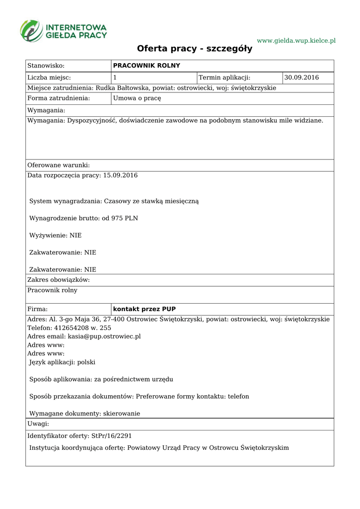 Oferta pracy - szczegóły Stanowisko: PRACOWNIK ROLNY Liczba miejsc: 1 www.gielda.wup.kielce.pl Termin aplikacji: 30.09.2016 Miejsce zatrudnienia: Rudka Bałtowska, powiat: ostrowiecki, woj: świętokrzyskie Forma zatrudnienia: Umowa o pracę Wymagania: Wymagania: Dyspozycyjność, doświadczenie zawodowe na podobnym stanowisku mile widziane. Oferowane warunki: Data rozpoczęcia pracy: 15.09.2016 System wynagradzania: Czasowy ze stawką miesięczną Wynagrodzenie brutto: od 975 PLN Wyżywienie: NIE Zakwaterowanie: NIE Zakwaterowanie: NIE Zakres obowiązków: Pracownik rolny Firma: kontakt przez PUP Adres: Al. 3-go Maja 36, 27-400 Ostrowiec Świętokrzyski, powiat: ostrowiecki, woj: świętokrzyskie Telefon: 412654208 w. 255 Adres email: [email protected] Adres www: Adres www: Język aplikacji: polski Sposób aplikowania: za pośrednictwem urzędu Sposób przekazania dokumentów: Preferowane formy kontaktu: telefon Wymagane dokumenty: skierowanie Uwagi: Identyfikator oferty: StPr/16/2291 Instytucja koordynująca ofertę: Powiatowy Urząd Pracy w Ostrowcu Świętokrzyskim Urząd Pracy dokłada wszelkich starań, aby oferty pracy będące w zasobach urzędu, były rzetelne i wiarygodne. Ponieważ wszystkie oferty pracy pochodzą od osób trzecich Urząd Pracy zastrzega, że odpowiedzialność za ewentualne rozbieżności pomiędzy warunkami pracy zaprezentowanymi w niniejszej ofercie a warunkami zaproponowanymi przez potencjalnego pracodawcę ponosi pracodawca.