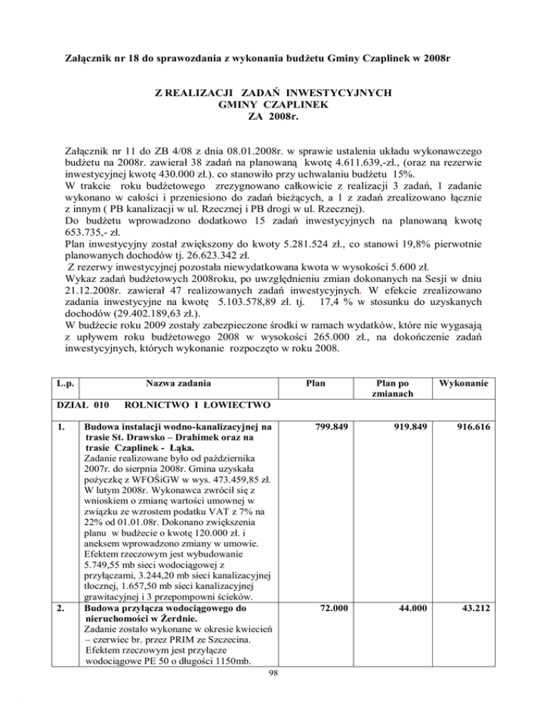 Załącznik nr 18 do sprawozdania z wykonania budżetu Gminy Czaplinek w 2008r Z REALIZACJI ZADAŃ INWESTYCYJNYCH GMINY CZAPLINEK ZA 2008r. Załącznik nr 11 do ZB 4/08 z dnia 08.01.2008r. w sprawie ustalenia układu wykonawczego budżetu na 2008r. zawierał 38 zadań na planowaną kwotę 4.611.639,-zł., (oraz na rezerwie inwestycyjnej kwotę 430.000 zł.). co stanowiło przy uchwalaniu budżetu 15%. W trakcie roku budżetowego zrezygnowano całkowicie z realizacji 3 zadań, 1 zadanie wykonano w całości i przeniesiono do zadań bieżących, a 1 z zadań zrealizowano łącznie z innym ( PB kanalizacji w ul. Rzecznej i PB drogi w ul. Rzecznej). Do budżetu wprowadzono dodatkowo 15 zadań inwestycyjnych na planowaną kwotę 653.735,- zł. Plan inwestycyjny został zwiększony do kwoty 5.281.524 zł., co stanowi 19,8% pierwotnie planowanych dochodów tj. 26.623.342 zł. Z rezerwy inwestycyjnej pozostała niewydatkowana kwota w wysokości 5.600 zł. Wykaz zadań budżetowych 2008roku, po uwzględnieniu zmian dokonanych na Sesji w dniu 21.12.2008r. zawierał 47 realizowanych zadań inwestycyjnych. W efekcie zrealizowano zadania inwestycyjne na kwotę 5.103.578,89 zł. tj. 17,4 % w stosunku do uzyskanych dochodów (29.402.189,63 zł.). W budżecie roku 2009 zostały zabezpieczone środki w ramach wydatków, które nie wygasają z upływem roku budżetowego 2008 w wysokości 265.000 zł., na dokończenie zadań inwestycyjnych, których wykonanie rozpoczęto w roku 2008. L.p. Nazwa zadania DZIAŁ 010 1. 2. Plan Plan po zmianach Wykonanie ROLNICTWO I ŁOWIECTWO Budowa instalacji wodno-kanalizacyjnej na trasie St. Drawsko – Drahimek oraz na trasie Czaplinek - Łąka. Zadanie realizowane było od października 2007r. do sierpnia 2008r. Gmina uzyskała pożyczkę z WFOŚiGW w wys. 473.459,85 zł. W lutym 2008r. Wykonawca zwrócił się z wnioskiem o zmianę wartości umownej w związku ze wzrostem podatku VAT z 7% na 22% od 01.01.08r. Dokonano zwiększenia planu w budżecie o kwotę 120.000 zł. i aneksem wprowadzono zmiany w umowie. Efektem rzeczowym jest wybudowanie 5.749,55 mb sieci wodociągowej z przyłączami, 3.244,20 mb sieci kanalizacyjnej tłocznej, 1.657,50 mb sieci kanalizacyjnej grawitacyjnej i 3 przepompowni ścieków. Budowa przyłącza wodociągowego do nieruchomości w Żerdnie. Zadanie zostało wykonane w okresie kwiecień – czerwiec br. przez PRIM ze Szczecina. Efektem rzeczowym jest przyłącze wodociągowe PE 50 o długości 1150mb. 98 799.849 919.849 916.616 72.000 44.000 43.212 DZIAŁ 600 – TRANSPORT I ŁĄCZNOŚĆ 3. 4. 5. 6. 7. 8. Budowa dróg na Osiedlu Wiejska Dokonano zwiększenia planowanych środków, gdyż cena oferty najkorzystniejszej przewyższała zabezpieczone przez Gminę środki na realizację tego zadania. Wykonano jezdnię dwupasmową o szer. 6,0mb i obustronne chodniki o szer. 2,0mb z kostki polbrukowej oraz oświetlenie drogowe (18 pkt. świetlnych). Modernizacja ulicy Tartacznej W roku 2008 przebudowano nawierzchnię jezdni i wykonano chodnik na odcinku od ul. Wałeckiej do ul. Mazurskiej. Zaistniała konieczności korekty projektu budowlanego w celu rozwiązania problemu odprowadzenia wód opadowych zarówno z pasa drogowego jak i terenów przyległych, w tym przepompowni ścieków. Na podstawie protokołu konieczności strony postanowiły wydłużyć termin wykonania zadania do 30.04.09r. i aneksem wprowadzono zmiany do umowy. Budowa nawierzchni jezdni i chodnika ulicy Pilskiej (projekt). Został opracowany projekt budowlany budowy drogi i uzyskano decyzję pozwolenia na budowę. Koszt zadania 190.000 zl. Projekty budowy dróg w ul. Wąskiej i Rzecznej (II część) i Ostrorogu. W roku 2007 został opracowany projekt budowlany budowy drogi w ul. Wąskiej od ul. Drahimskiej do ul. Polnej. Koszt zadania 290.000 zł. W 2008r. wyk. projekt budowy drogi na odcinku od ulicy Drahimskiej do nieruchomości Wąska 2. Koszt zadania 149.000 zł. Opracowano projekt przebudowy ulicy Rzecznej wraz z wykonanie kanalizacji deszczowej. Koszt zadania 405.000 zł. Przebudowa nawierzchni drogowej rynku i deptaka w ramach rewitalizacji centrum Czaplinka. Wykonanie zadania przeniesiono na rok 2008 w ramach wydatków, które nie wygasły z upływem roku 2008. Przebudowa drogi do m. Wrześnica Po wyborze oferty najkorzystniejszej dokonano zwiększenia planowanych w budżecie środków, w wysokości umożliwiającej wykonanie zadania. Przebudowano drogę na długości 1,40 km i szerokości 4,00mb. Gmina uzyskała na to zadanie dofinansowanie z FOGR w kwocie 215.115 36 zł. 99 862.000 1.162.000 1.161.096 200.000 200.000 200.000 8.000 4.000 4.744 21.000 16.000 15.638 30.000 30.000 30.000 500.000 580.000 579.529 9. Przebudowa drogi w m. Kluczewo do jeziora Wykonano nawierzchnię drogi na długości 570mb i szerokości 3,50mb . Na to zadanie Gmina również uzyskała dofinansowanie z FOGR w kwocie 53.279,93 zl. 150.000 150.000 122.800 10. Budowa nawierzchni drogi wewnętrznej w Sikorach (projekt) Zadanie jest realizowane w ramach wydatków, które nie wygasły z upływem roku 2008. Termin wykonania do 31.05.2009r. DZIAŁ 630 – TURYSTYKA 10.000 10.000 10.000 11. 80.000 20.000 12.768 90.000 47.840 47.836 130.000 130.000 102.740 100.000 100.000 100.000 Wykonanie utwardzenia alei cmentarnej Wykonano alejkę z kostki polbrukowej na nowej części cmentarza, na pow. 427,04m2; obrzeża trawnikowe 382,40 mb. DZIAŁ 750 - ADMINISTRACJA PUBLICZNA 10.000 25.000 25.000 16. 78.000 78.000 65.686 80.000 45.000 12.200 Budowa pomostu w Starym Drawsku Opracowano raportu oddziaływania na środowisko, uzyskano decyzję środowiskową. 12. Modernizacja Ośrodka Sportów Wodnych Wykonano badania geologiczne i batymetrycznych części jeziora planowanego do budowy obiektów inżynierii wodnej. Przeprowadzone trzy postępowania przetargowe na wybór wykonawcy projektu budowlanego modernizacji Ośrodka zostały unieważnione, gdyż ceny ofert przewyższały środki, jakie Gmina miała przeznaczone 