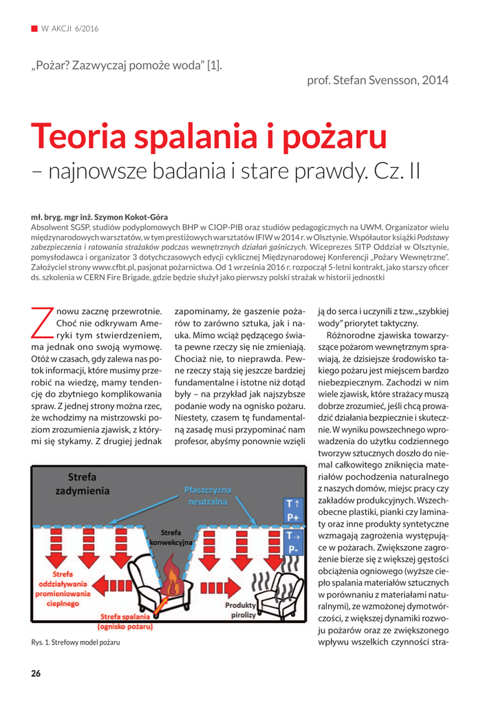 W AKCJI 6/2016 „Po×ar? Zazwyczaj pomo×e woda” [1]. prof. Stefan Svensson, 2014 Teoria spalania ibpo×aru – najnowsze badania ibstare prawdy. Cz. II mÊ. bryg. mgrbin×. Szymon Kokot-Góra Absolwent SGSP, studiów podyplomowych BHP wbCIOP-PIB oraz studiów pedagogicznych nabUWM. Organizator wielu miÇdzynarodowych warsztatów, wbtym presti×owych warsztatów IFIW wb2014 r.bwbOlsztynie. WspóÊautor ksiÃ×ki Podstawy zabezpieczenia ib ratowania stra×aków podczas wewnÇtrznych dziaÊaÌ gaÐniczych. Wiceprezes SITP OddziaÊ wb Olsztynie, pomysÊodawca iborganizator 3bdotychczasowych edycji cyklicznej MiÇdzynarodowej Konferencji „Po×ary WewnÇtrzne”. ZaÊo×yciel strony www.cfbt.pl, pasjonat po×arnictwa. Odb1bwrzeÐnia 2016 r.brozpoczÃÊ 5-letni kontrakt, jako starszy oĆcer ds. szkolenia wbCERN Fire Brigade, gdzie bÇdzie sÊu×yÊ jako pierwszy polski stra×ak wbhistorii jednostki Z nowu zacznę przewrotnie. Choć nie odkrywam Ameryki tym stwierdzeniem, ma jednak ono swoją wymowę. Otóż w czasach, gdy zalewa nas potok informacji, które musimy przerobić na wiedzę, mamy tendencję do zbytniego komplikowania spraw. Z jednej strony można rzec, że wchodzimy na mistrzowski poziom zrozumienia zjawisk, z którymi się stykamy. Z drugiej jednak Rys. 1.bStrefowy model po×aru 26 zapominamy, że gaszenie pożarów to zarówno sztuka, jak i nauka. Mimo wciąż pędzącego świata pewne rzeczy się nie zmieniają. Chociaż nie, to nieprawda. Pewne rzeczy stają się jeszcze bardziej fundamentalne i istotne niż dotąd były – na przykład jak najszybsze podanie wody na ognisko pożaru. Niestety, czasem tę fundamentalną zasadę musi przypominać nam profesor, abyśmy ponownie wzięli ją do serca i uczynili z tzw. „szybkiej wody” priorytet taktyczny. Różnorodne zjawiska towarzyszące pożarom wewnętrznym sprawiają, że dzisiejsze środowisko takiego pożaru jest miejscem bardzo niebezpiecznym. Zachodzi w nim wiele zjawisk, które strażacy muszą dobrze zrozumieć, jeśli chcą prowadzić działania bezpiecznie i skutecznie. W wyniku powszechnego wprowadzenia do użytku codziennego tworzyw sztucznych doszło do niemal całkowitego zniknięcia materiałów pochodzenia naturalnego z naszych domów, miejsc pracy czy zakładów produkcyjnych. Wszechobecne plastiki, pianki czy laminaty oraz inne produkty syntetyczne wzmagają zagrożenia występujące w pożarach. Zwiększone zagrożenie bierze się z większej gęstości obciążenia ogniowego (wyższe ciepło spalania materiałów sztucznych w porównaniu z materiałami naturalnymi), ze wzmożonej dymotwórczości, z większej dynamiki rozwoju pożarów oraz ze zwiększonego wpływu wszelkich czynności stra- W AKCJI 6/2016 Rys. 2.bPorównanie krzywych po×aru: tradycyjnej (czerwona) ibwspóÊczesnej (niebieska) [6] żaków na pożar. W niniejszym artykule wyjaśniono kilka ważnych zjawisk związanych z pożarami oraz działaniami strażaków. Proces spalania abÐrodowisko po×aru wewnÇtrznego Po omówieniu mechanizmów towarzyszących procesowi spalania nadszedł czas na umiejscowienie ich w środowisku pożaru wewnętrznego. Część z zagadnień omawianych w pierwszej części artykułu („W Akcji”, 5/2016, s. 26) była już omówiona w tym kontekście, tym razem jednak naszym polem rozważań będzie pożar wewnętrzny od początku jego powstania do momentu jego zakończenia. Kiedy proces spalania rozpoczyna się w pomieszczeniu, zaczyna się dziać kilka rzeczy. Najłatwiej wytłumaczyć je na tzw. modelu strefowym pożaru wewnętrznego. Miejsce, w którym zaczyna się proces spalania, nazywamy strefą spalania. Jest to obszar, w którym występuje spalanie płomieniowe i/lub bezpłomieniowe (żarzenie, tlenie) i z którego emitowane są promieniowanie cieplne oraz dym. Ponad strefą spalania znajduje się strefa konwekcyjna. Pojęcie kolumny konwekcyj- nej ognia zostało wyjaśnione w poprzedniej części. Wokół ogniska pożaru istnieje strefa oddziaływania promieniowania cieplnego, którego źródłami są zarówno płomień (im większa powierzchnia płomienia, tym większa wartość gęstości strumienia promieniowania cieplnego), jak również warstwa podsufitowa gorących gazów pożarowych – zwana strefą zadymienia. Strefę zadymioną od przestrzeni wolnej od zadymienia oddziela płaszczyzna neutralna (zwana niekiedy strefą neutralną, jednak to pierwsze określenie lepiej oddaje jej charakter) [2]. Płaszczyzna neutralna jest miejscem, w którym panuje ciśnienie atmosferyczne (neutralne) – powyżej w warstwie zadymienia występuje nadciśnienie (powodowane ekspansją termalną gazów), a poniżej – podciśnienie (powodowane zasysaniem powietrza do strefy spalania). Inaczej mówiąc, płaszczyzna neutralna jest najczęściej poziomą granicą między strefą zadymienia a strefą wolną od dymu. Dlaczego w jednym pomieszczeniu możliwe jest zarówno podciśnienie, jak i nadciśnienie? Dlatego, że różnica temperatur w tych obu obszarach sięga nawet kilkuset stopni! Płaszczyzna neutralna niemal pokrywa się z li- nią strefy zadymienia. De facto istnieje niewielkie przesunięcie, niemniej dla wizualnej oceny zachowania płaszczyzny neutralnej, będącej podstawą rozpoznania warunków ogniowych, nie ma ono większego znaczenia. NagÊe rozprzestrzenienie siÇ po×aru Na tym etapie wypada przypomnieć, że niebezpieczne zjawiska pożarowe określane są w literaturze jako rapid fire progress – nagłe rozprzestrzenienie się pożaru. Zazwyczaj ich wystąpienie wiąże się z przejściem pożaru w fazę w pełni rozwiniętą. Wśród zjawisk zawierających się w tym pojęciu naukowcy wyróżnili z czasem 3 zasadnicze zjawiska: · fire gas ignition – zapłon gazów pożarowych – jako grupę kilku zjawisk związanych z występowaniem gazów pożarowych w stanie palności lub przejściem ich w taki stan poprzez wymieszanie z powietrzem, ogrzanie i/lub pojawienie się źródła zapłonu; 