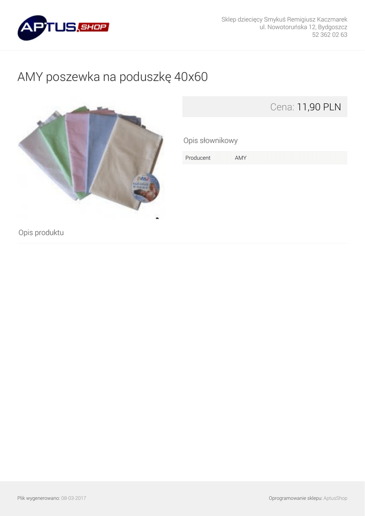 Sklep dziecięcy Smykuś Remigiusz Kaczmarek ul. Nowotoruńska 12, Bydgoszcz 52 362 02 63 AMY poszewka na poduszkę 40x60 Cena: 11,90 PLN Opis słownikowy Producent AMY Opis produktu Plik wygenerowano: 08-03-2017 Powered by TCPDF (www.tcpdf.org) Oprogramowanie sklepu: AptusShop