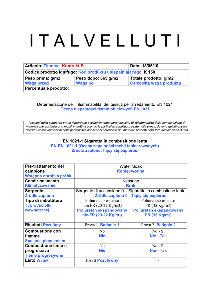 ITALVELLUTI Articolo: Tkanina Kontrakt B. Data: 18/05/10 Codice prodotto ignifugo: Kod produktu uniepalniającego K 150 Peso prima: g/m2 Peso dopo: 665 g/m2 Totale prodotto: g/m2 Waga przed Waga po Całkowita waga produktu Percentuale prodotto: Determinazione dell’infiammabilita dei tessuti per arredamento EN 1021 Ocena niepalności tkanin obiciowych EN 1021 I risultati della seguente prova riguardano esclusivamente caratteristiche di infiammabilita della combinazione di materiali che costituiscono mobili imbottiti secondo le particolari condizioni usate nella prova, devono quindi essere utilizzati come valutazioni della pericolosita d”incendio potenziale dei materiali prodotti nella loro destinazione d”uso. EN 1021-1 Sigaretta in combusitione lenta PN-EN 1021-1 (Ocena zapalności mebli tapicerowanych) Źródło zapłonu: tlący się papieros. Pre-trattamento del Water Soak campione Kąpiel wodna Wstępna obróbka próbki Condizionamento Nessuno Klimatyzowanie Brak Sorgente Sorgente di accensione 0 – Sigaretta in combustione lenta Źródło zapłonu Źródło zapłonu 0 - Tlący się papieros Tipo di imbottitura Poliuretano espanso Poliuretano espanso Typ wyściółki non FR (20-22 Kg/m3) FR (35 Kg/m3) wewnętrznej Poliuretan ekspandowany Poliuretan ekspandowany nie-FR (20-22 Kg/m3) FR (35 Kg/m3) Risultati Rezultaty Combustione con fiamme Spalanie płomieniem Combustione lenta e progressiva Tlenie progresywne Esito Wynik Prova 1 Badanie 1 No Nie Prova 2 Badanie 2 No - Si Nie - Tak No Nie No - Si Nie - Tak PASS Pozytywny - EN 1021-2 Fiamma equivalente ad un fiammifero Źródło zapłonu : płomień równoważny z zapałką Pre-trattam,ento del campione Wstępna obróbka próbki Condizionamento Klimatyzowanie Sorgente Źródło zapłonu Tipo di imbottitura Typ wyściółki wewnętrznej Risultati Rezultaty Combustione con fiamme Spalanie płomieniem Combustione lenta e progressiva Tlenie progresywne Esito Wynik Note: Water Soak Kąpiel wodna Nessuno Brak Sorgente di accensione 1 – Piccola fiamma equivalente ad un fiammifero Źródło zapłonu 1 – płomień równoważny z zapałką Poliuretano espanso non FR (20-22 Kg/m3) Poliuretan ekspandowany nie-FR (20-22 Kg/m3) Prova 1 Próba 1 25 sec Prova 2 Próba 2 34 sec Prova 3 Próba 3 <No> 120 sec Nie Non rilevata Nie wykryto Non rilevata Nie wykryto Non rilevata – Rilevata Nie wykryto Wykryto - PASS Pozytywny PASS Pozytywny