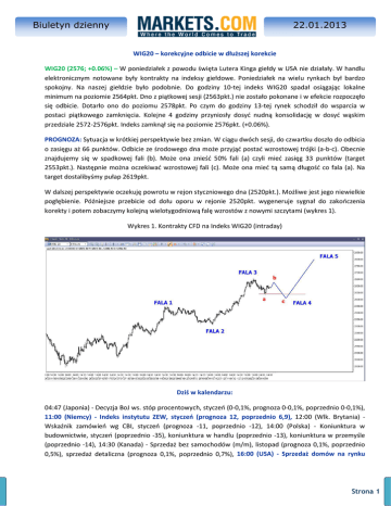 Biuletyn dzienny 22.01.2013 15 WIG20 – korekcyjne odbicie w dłuższej korekcie WIG20 (2576; +0.06%) – W poniedziałek z powodu święta Lutera Kinga giełdy w USA nie działały. W handlu elektronicznym notowane były kontrakty na indeksy giełdowe. Poniedziałek na wielu rynkach był bardzo spokojny. Na naszej giełdzie było podobnie. Do godziny 10-tej indeks WIG20 spadał osiągając lokalne minimum na poziomie 2564pkt. Dno z piątkowej sesji (2563pkt.) nie zostało pokonane i w efekcie rozpoczęło się odbicie. Dotarło ono do poziomu 2578pkt. Po czym do godziny 13-tej rynek schodził do wsparcia w postaci piątkowego zamknięcia. Kolejne 4 godziny przyniosły dosyć nudną konsolidację w dosyć wąskim przedziale 2572-2576pkt. Indeks zamknął się na poziomie 2576pkt. (+0.06%). PROGNOZA: Sytuacja w krótkiej perspektywie bez zmian. W ciągu dwóch sesji, do czwartku doszło do odbicia o zasięgu aż 66 punktów. Odbicie ze środowego dna może przyjąć postać wzrostowej trójki (a-b-c). Obecnie znajdujemy się w spadkowej fali (b). Może ona znieść 50% fali (a) czyli mieć zasięg 33 punktów (target 2553pkt.). Następnie można oczekiwać wzrostowej fali (c). Może ona mieć tą samą długość co fala (a). Na target dostalibyśmy pułap 2619pkt. W dalszej perspektywie oczekuję powrotu w rejon styczniowego dna (2520pkt.). Możliwe jest jego niewielkie pogłębienie. Późniejsze przebicie od dołu oporu w rejonie 2520pkt. wygeneruje sygnał do zakończenia korekty i potem zobaczymy kolejną wielotygodniową falę wzrostów z nowymi szczytami (wykres 1). Wykres 1. Kontrakty CFD na Indeks WIG20 (intraday) Dziś w kalendarzu: 04:47 (Japonia) - Decyzja BoJ ws. stóp procentowych, styczeń (0-0,1%, prognoza 0-0,1%, poprzednio 0-0,1%), 11:00 (Niemcy) - Indeks instytutu ZEW, styczeń (prognoza 12, poprzednio 6,9), 12:00 (Wlk. Brytania) Wskaźnik zamówień wg CBI, styczeń (prognoza -11, poprzednio -12), 14:00 (Polska) - Koniunktura w budownictwie, styczeń (poprzednio -35), koniunktura w handlu (poprzednio -13), koniunktura w przemyśle (poprzednio -14), 14:30 (Kanada) - Sprzedaż bez samochodów (m/m), listopad (prognoza 0,1%, poprzednio 0,5%), sprzedaż detaliczna (prognoza 0,1%, poprzednio 0,7%), 16:00 (USA) - Sprzedaż domów na rynku Strona 1 Biuletyn dzienny 22.01.2013 15 wtórnym, grudzień (prognoza 5,1 mln, poprzednio 5,04 mln), Indeks Fed z Richmond, styczeń (prognoza 4, poprzednio 5). Rynek w USA S&P500 Future (1483.25; +0.28%) – W poniedziałek z powodu święta Lutera Kinga giełdy w USA nie działały. W handlu elektronicznym notowane były kontrakty na indeksy giełdowe. W poniedziałek przez kilkanaście godzin kurs kontraktów na indeks S&P500 pozostawał w fazie konsolidacji w rejonie 1478-1481.65pkt. Kilkanaście minut po godzinie 16-tej doszło do wybicia w górę. Nowe maksimum wypadło na poziomie 1483.65pkt. Zamknięcie blisko dziennego szczytu. Z powodu święta zakończenie handlu nastąpiło wcześniej o godzinie 17:30. Dziś w nocy osiągnięty został nowy szczyt na poziomie 1484.15pkt. Potem doszło do niewielkiego spadku do poziomu 1479.65pkt. O godzinie 08:00 kontrakty były notowane po 1481pkt. (-0.15%). PROGNOZA: Z dna z 15-go stycznia (1457pkt.) do ostatniego szczytu widoczna jest wzrostowa 5-falowa struktura. Przebicie wsparcia w okolicy 1480pkt. wygeneruje sygnał do korekty tej fali. Jeśli rynek utrzyma się powyżej 1470pkt. (lokalne szczyty z pierwszej połowy stycznia), to możliwy jest powrót na ostatni szczyt (wykres 2) i po jego przełamaniu dalsze wzrosty i atak być może na 1500pkt. W przeciwnym wypadku (brak nowego szczytu), sygnał do głębszej korekty pojawi się po przebiciu wsparcia w rejonie 1460pkt. Wykres 2. Kontrakty na indeks S&P500 w układzie intraday Ciekawie wygląda sytuacja na wykresie kontraktów na indeks Nasdaq100. Układ fal w dłuższej perspektywie (licząc z dna z listopada) jest bardziej czytelny. Grudniowa korekta przyjęła zupełnie inną postać niż na Strona 2 Biuletyn dzienny 22.01.2013 15 wykresie kontraktów na indeks S&P500, przez co wymowa wsparcia w postaci szczytu z początku grudnia (fala 1) jest o wiele bardziej klarowna. Natomiast w krótkiej perspektywie na rynku technologicznym trwa wielosesyjna konsolidacja. W krótkim terminie możliwy jest atak na opór a potem ruch w dół (wykres 3). Wykres 3. Kontrakty na indeks Nasdaq100 w układzie intraday Nieudana próba przełamania oporu może doprowadzić do spadku do dolnego ograniczenia blisko 2tygodniowej konsolidacji. Nieznacznie niżej znajduje się bardzo ważne wsparcie w postaci szczytu fali 1-szej z początku grudnia. Jest to poziom 2695pkt. Przełamanie tego wsparcia może doprowadzić do powrotu na listopadowe dno. W przeciwnym przypadku możliwy jest powrót na styczniowe maksimum. Sławomir Dębowski Markets.com Niniejsza publikacja została przygotowana przez Safecap Investments (Poland) Sp. z o.o. i jest dostarczona wyłącznie w celach informacyjnych. Przeznaczona jest dla inwestorów, którzy nie podejmują swoich decyzji inwestycyjnych w oparciu o nią. Inwestorzy powinni mieć swoją własną ocenę co do właściwości i celowości inwestowania w którykolwiek z wymienianych instrument finansowy, opartą na analizie danego instrumentu, ryzyka z nim związanego, ich własnej strategii inwestycyjnej oraz przy uwzględnieniu ich prawnej, podatkowej i finansowej sytuacji. Dotychczasowe efekty inwestycji w dany instrument finansowy nie są gwarancją przyszłych wyników. Safecap Investments (Poland) Sp. z o.o., jak również żaden z jej pracowników w związku z niniejszą publikacją nie będzie odpowiedzialny za jakiekolwiek decyzje inwestycyjne. Strona 3