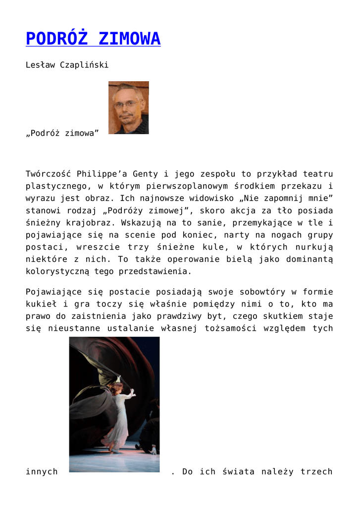 PODRÓŻ ZIMOWA Lesław Czapliński „Podróż zimowa” Twórczość Philippe’a Genty i jego zespołu to przykład teatru plastycznego, w którym pierwszoplanowym środkiem przekazu i wyrazu jest obraz. Ich najnowsze widowisko „Nie zapomnij mnie” stanowi rodzaj „Podróży zimowej”, skoro akcja za tło posiada śnieżny krajobraz. Wskazują na to sanie, przemykające w tle i pojawiające się na scenie pod koniec, narty na nogach grupy postaci, wreszcie trzy śnieżne kule, w których nurkują niektóre z nich. To także operowanie bielą jako dominantą kolorystyczną tego przedstawienia. Pojawiające się postacie posiadają swoje sobowtóry w formie kukieł i gra toczy się właśnie pomiędzy nimi o to, kto ma prawo do zaistnienia jako prawdziwy byt, czego skutkiem staje się nieustanne ustalanie własnej tożsamości względem tych innych . Do ich świata należy trzech Andersenowskich wysłanników śmierci, którzy starają się unicestwić życie, uosabiane przez kobietę i mężczyznę. W tym celu posługują się wodą która bynajmniej nie ożywia, lecz uśmierca, skoro przemienia się w lód, którym skuwa żyjących. Ich zwłoki ładują do sani, ale kiedy pojawią się na horyzoncie, jak na początku, tyle że zmierzając w przeciwnym kierunku, ich ofiary w cudowny sposób ożyją i wymkną się im. Ten konflikt pomiędzy żywą egzystencją a jej pałubą, czyli martwą formą, przywodzi na myśl seanse w teatrze śmierci Tadeusza Kantora, choć mnie się bardziej kojarzy z wyrosłymi z nich przedstawieniami Janusza Wiśniewskiego . To swoiste panopticum zaludniają ponadto twory popularnej kultury jak małpa Clarissa, która, prawem dialektycznego kontrastu, wykonuje na początku słynną arię „Lascia ch’io pianga” z Haendlowskiego „Rinalda”. W tle akustycznym daje się słyszeć brzęczenie much, ale także rozbrzmiewa repetytywna muzyka, uruchamiająca automatyzm zachowań postaci, powtarzających swe czynności. Oprócz działań, którym można przypisać znaczenie alegoryczne, pojawiają się także przejawy czystej gry, którą współtworzą ruchy drapowanej materii, mogącej przybrać kształt skrzydeł , które uwznioślą kobietę w bieli. Kiedy spektakl dobiegnie końca pojawia się refleksja, czy to wszystko, co przesunęło się przed naszymi oczyma i docierało do naszych uszu było wyłącznie przywidzeniem, tworem pobudzonej wyobraźni? Compagnie Philippe Gentyeż. Philippe Genty: „Nie zapomnij mnie”. Reż. Philippe Genty.