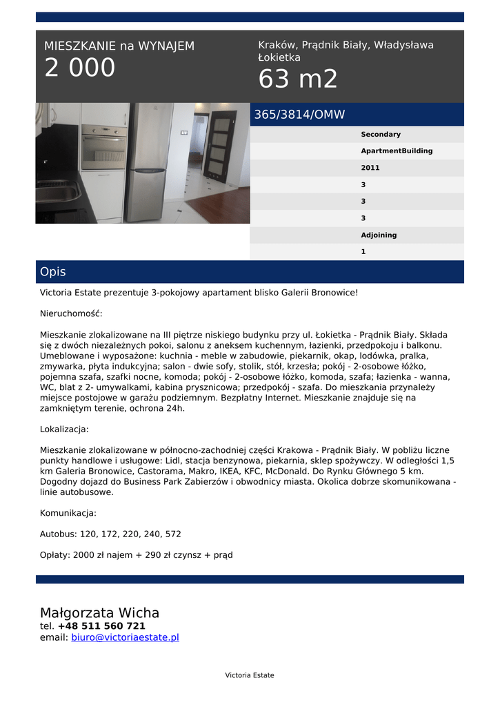 Kraków, Prądnik Biały, Władysława Łokietka MIESZKANIE na WYNAJEM 2 000 63 m2 365/3814/OMW Secondary ApartmentBuilding 2011 3 3 3 Adjoining 1 Opis Victoria Estate prezentuje 3-pokojowy apartament blisko Galerii Bronowice! Nieruchomość: Mieszkanie zlokalizowane na III piętrze niskiego budynku przy ul. Łokietka - Prądnik Biały. Składa się z dwóch niezależnych pokoi, salonu z aneksem kuchennym, łazienki, przedpokoju i balkonu. Umeblowane i wyposażone: kuchnia - meble w zabudowie, piekarnik, okap, lodówka, pralka, zmywarka, płyta indukcyjna; salon - dwie sofy, stolik, stół, krzesła; pokój - 2-osobowe łóżko, pojemna szafa, szafki nocne, komoda; pokój - 2-osobowe łóżko, komoda, szafa; łazienka - wanna, WC, blat z 2- umywalkami, kabina prysznicowa; przedpokój - szafa. Do mieszkania przynależy miejsce postojowe w garażu podziemnym. Bezpłatny Internet. Mieszkanie znajduje się na zamkniętym terenie, ochrona 24h. Lokalizacja: Mieszkanie zlokalizowane w północno-zachodniej części Krakowa - Prądnik Biały. W pobliżu liczne punkty handlowe i usługowe: Lidl, stacja benzynowa, piekarnia, sklep spożywczy. W odległości 1,5 km Galeria Bronowice, Castorama, Makro, IKEA, KFC, McDonald. Do Rynku Głównego 5 km. Dogodny dojazd do Business Park Zabierzów i obwodnicy miasta. Okolica dobrze skomunikowana linie autobusowe. Komunikacja: Autobus: 120, 172, 220, 240, 572 Opłaty: 2000 zł najem + 290 zł czynsz + prąd Małgorzata Wicha tel. +48 511 560 721 email: [email protected] Victoria Estate Victoria Estate Powered by TCPDF (www.tcpdf.org)