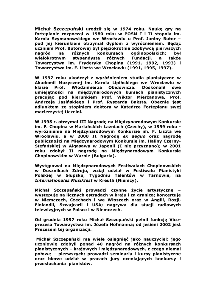 Michał Szczepański urodził się w 1974 roku. Naukę gry na fortepianie rozpoczął w 1980 roku w POSM I i II stopnia im. Karola Szymanowskiego we Wrocławiu u Prof. Janiny Butor – pod jej kierunkiem otrzymał dyplom z wyróżnieniem. Będąc uczniem Prof. Butorowej był pięciokrotnie zdobywcą pierwszych nagród na różnych konkursach ogólnopolskich; był wielokrotnym stypendystą różnych Fundacji, a także Towarzystwa im. Fryderyka Chopina (1991, 1992, 1993) i Towarzystwa im. F. Liszta we Wrocławiu (1991, 1995, 1997). W 1997 roku ukończył z wyróżnieniem studia pianistyczne w Akademii Muzycznej im. Karola Lipińskiego we Wrocławiu w klasie Prof. Włodzimierza Obidowicza. Doskonalił swe umiejętności na międzynarodowych kursach pianistycznych pracując pod kierunkiem Prof. Wiktor Mierżanowa, Prof. Andrzeja Jasińskiego i Prof. Ryszarda Baksta. Obecnie jest adiunktem ze stopiniem doktora w Katedrze Fortepianu swej macierzystej Uczelni. W 1995 r. otrzymał III Nagrodę na Międzynarodowym Konkursie im. F. Chopina w Mariańskich Łaźniach (Czechy), w 1999 roku wyróżnienie na Międzynarodowym Konkursie im. F. Liszta we Wrocławiu, a w 2000 II Nagrodę ex aeguo oraz nagrodę publiczności na Międzynarodowym Konkursie im. Haliny CzernyStefańskiej w Aigasawa w Japonii (I nie przyznano); w 2001 roku zdobył II nagrodę na Międzynarodowym Konkursie Chopinowskim w Warnie (Bułgaria). Występował na Międzynarodowych Festiwalach Chopinowskich w Dusznikach Zdroju, wziął udział w Festiwalu Pianistyki Polskiej w Słupsku, Tygodniu Talentów w Tarnowie, na Internationales Musikfest w Kreuth (Niemcy). Michał Szczepański prowadzi czynne występuje na licznych estradach w kraju i w Niemczech, Czechach i we Włoszech Finlandii, Szwajcarii i USA; nagrywa telewizyjnych w Polsce i w Niemczech. życie artystyczne – za granicą; koncertuje oraz w Anglii, Rosji, dla stacji radiowych Od grudnia 1997 roku Michał Szczepański pełnił funkcję Viceprezesa Towarzystwa im. Józefa Hofmanna; od jesieni 2002 jest Prezesem tej organizacji. Michał Szczepański ma wiele osiągnięć jako nauczyciel: jego uczniowie zdobyli ponad 40 nagród na różnych konkursach pianistycznych – krajowych i międzynarodowych, z czego niemal połowę – pierwszych; prowadzi seminaria i kursy pianistyczne oraz bierze udział w pracach jury oceniających konkursy i przesłuchania pianistów.