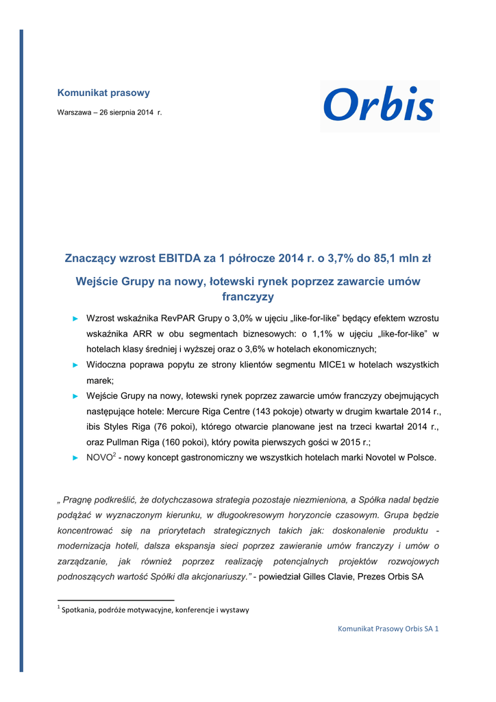 Komunikat prasowy Warszawa – 26 sierpnia 2014 r. Znaczący wzrost EBITDA za 1 półrocze 2014 r. o 3,7% do 85,1 mln zł Wejście Grupy na nowy, łotewski rynek poprzez zawarcie umów franczyzy ► Wzrost wskaźnika RevPAR Grupy o 3,0% w ujęciu „like-for-like” będący efektem wzrostu wskaźnika ARR w obu segmentach biznesowych: o 1,1% w ujęciu „like-for-like” w hotelach klasy średniej i wyższej oraz o 3,6% w hotelach ekonomicznych; ► Widoczna poprawa popytu ze strony klientów segmentu MICE1 w hotelach wszystkich marek; ► Wejście Grupy na nowy, łotewski rynek poprzez zawarcie umów franczyzy obejmujących następujące hotele: Mercure Riga Centre (143 pokoje) otwarty w drugim kwartale 2014 r., ibis Styles Riga (76 pokoi), którego otwarcie planowane jest na trzeci kwartał 2014 r., oraz Pullman Riga (160 pokoi), który powita pierwszych gości w 2015 r.; ► NOVO2 - nowy koncept gastronomiczny we wszystkich hotelach marki Novotel w Polsce. „ Pragnę podkreślić, że dotychczasowa strategia pozostaje niezmieniona, a Spółka nadal będzie podążać w wyznaczonym kierunku, w długookresowym horyzoncie czasowym. Grupa będzie koncentrować się na priorytetach strategicznych takich jak: doskonalenie produktu modernizacja hoteli, dalsza ekspansja sieci poprzez zawieranie umów franczyzy i umów o zarządzanie, jak również poprzez realizację potencjalnych projektów rozwojowych podnoszących wartość Spółki dla akcjonariuszy.” - powiedział Gilles Clavie, Prezes Orbis SA 1 Spotkania, podróże motywacyjne, konferencje i wystawy Komunikat Prasowy Orbis SA 1 Wyniki finansowe Według GUS w pierwszym półroczu 2014 r. w polskiej gospodarce utrzymywały się pozytywne tendencje, pomimo nieznacznego spadku dynamiki wzrostu. Dzięki korzystnemu otoczeniu gospodarczemu w pierwszym półroczu 2014 r. Orbis wypracował przychody w wysokości 322,8 mln zł, co oznacza wzrost o 1,9% w ujęciu „like-for-like” w porównaniu do roku ubiegłego. Zysk z działalności operacyjnej (EBITDA) wyniósł 85,1 mln zł, a Orbis zakończył pierwsze półrocze odnotowując 19,7% wzrost zysku netto, który osiągnął poziom 26,3 mln zł. Wyniki operacyjne Zwiększony popyt na imprezy MICE w hotelach wszystkich marek wywierał korzystny wpływ na wyniki Grupy. Pozytywne tendencje odnotowano także w zakresie liczby klientów biznesowych, odwiedzających nasze hotele w pierwszej połowie roku. Z drugiej strony wystąpił nieznaczny spadek popytu ze strony turystów, co szczególnie odczuły hotele ekonomiczne. Ogólnie wyniki operacyjne Orbisu utrzymują się na dobrym poziomie. Widoczny jest wzrost przychodu na jeden dostępny pokój (RevPAR) (o 3,0% w ujęciu „like-for-like”), będący efektem zarówno wyższych cen, jak i rosnącej frekwencji. Ekspansja Orbis rozwija swoją sieć hoteli. W pierwszym półroczu 2014 r. Grupa weszła na rynek łotewski, wprowadzając w Rydze 3 marki Accor: Mercure, ibis Styles i Pullman. Nowo otwarty hotel Mercure Riga Centre oferuje gościom 143 oryginalnie zaprojektowane pokoje. Rozpoczęcie działalności dwóch kolejnych hoteli zaplanowane jest w późniejszym terminie: w hotelu Pullman Riga (160 pokoi) trwają jeszcze prace budowlane, które zostaną zakończone w 2015 roku, natomiast ibis Styles Riga (76 pokoi) powita pierwszych gości już 1 września bieżącego roku. Poza rozwojem sieci poprzez umowy franczyzy, Orbis wdraża także własne projekty inwestycyjne, np. hotel Mercure w Krakowie. Podpisaliśmy już umowę przedwstępną na zakup gruntu i czekamy na uzyskanie pozwoleń, aby móc kontynuować ten projekt. Zarząd Orbisu potwierdza strategiczny cel, jakim jest kontynuacja budowy solidnego portfela hoteli, który wzmocni pozycję Spółki jako lidera na rynku hotelowym w Polsce i w Krajach Bałtyckich. Modernizacje Orbis wzmacnia swoją pozycję lidera także poprzez rozwój produktu. W pierwszym półroczu 2014 r. na projekty modernizacyjne przeznaczono kwotę 42,5 mln zł. Kluczowe prace Komunikat Prasowy Orbis SA 2 remontowe przeprowadzono w hotelach Sofitel Warsaw Victoria, Novotel Warszawa Centrum i Orbis Gdynia. Ponadto w 6 hotelach marki Novotel i w 1 hotelu marki Mercure zrealizowane zostały inne projekty mające na celu podniesienie standardu. Spółka dostrzega konieczność podążania za szybko zmieniającymi się oczekiwaniami gości, dlatego też będzie nieustannie inwestować i rozwijać się, by zachować przewagę konkurencyjną na rynku, zapewnić nowoczesny produkt i wysoki poziom oferowanych usług. Innowacje W pierwszym półroczu 2014 r. Orbis wprowadził nowy koncept gastronomiczny NOVO2 dla hoteli Novotel w Polsce. W swoim założeniu projekt NOVO2 to specjalnie zaaranżowana nowoczesna i wygodna przestrzeń, która skupia życie hotelowe, stając się atrakcyjnym uzupełnieniem lobby. Społeczna odpowiedzialność biznesu Orbis wyznacza trendy w zakresie społecznej odpowiedzialności biznesu w polskiej branży hotelowej. W pierwszym półroczu 2014 r. kolejne 20 młodych osób, które znajdują się w trudnej sytuacji i zostały wykluczone z funkcjonowania w życiu społecznym, skorzystało z programu „Accordeon Samodzielności”, uzyskując pomoc w usamodzielnieniu się i wejściu na rynek pracy. Orbis zaangażował się także w zapobieganie i przeciwdziałanie wykorzystywaniu dzieci w sektorze turystycznym i został zaproszony do aktywnego udziału w ogólnoświatowej kampanii Nie odwracaj wzroku”. Dzięki konsekwentnej realizacji wytycznych operacyjnych przez hotele Grupy, w pierwszym półroczu 2014 r. udało się obniżyć zużycie wody i energii o odpowiednio 12,8% i 1,3%, co przełożyło się na oszczędności w łącznej kwocie 2,5 mln zł. „Orbis w pierwszym półroczu 2014 r. odnotował znaczną poprawę wyników we wszystkich obszarach swojej działalności. Jako bardziej efektywne i rentowne przedsiębiorstwo możemy kontynuować nasz rozwój, by podnosić wartość firmy dla akcj
