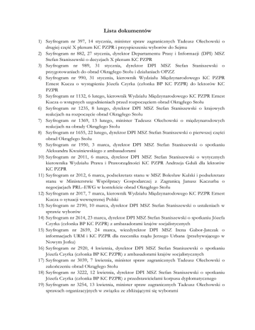 Lista dokumentów 1) Szyfrogram nr 397, 14 stycznia, minister spraw zagranicznych Tadeusz Olechowski o drugiej część X plenum KC PZPR i przyspieszeniu wyborów do Sejmu 2) Szyfrogram nr 882, 27 stycznia, dyrektor Departamentu Prasy i Informacji (DPI) MSZ Stefan Staniszewski o decyzjach X plenum KC PZPR 3) Szyfrogram nr 989, 31 stycznia, dyrektor DPI MSZ Stefan Staniszewski o przygotowaniach do obrad Okrągłego Stołu i działaniach OPZZ 4) Szyfrogram nr 990, 31 stycznia, kierownik Wydziału Międzynarodowego KC PZPR Ernest Kucza o wystąpieniu Józefa Czyrka (członka BP KC PZPR) do lektorów KC PZPR 5) Szyfrogram nr 1132, 6 lutego, kierownik Wydziału Międzynarodowego KC PZPR Ernest Kucza o wstępnych uzgodnieniach przed rozpoczęciem obrad Okrągłego Stołu 6) Szyfrogram nr 1235, 8 lutego, dyrektor DPI MSZ Stefan Staniszewski o krajowych reakcjach na rozpoczęcie obrad Okrągłego Stołu 7) Szyfrogram nr 1369, 13 lutego, minister Tadeusz Olechowski o międzynarodowych reakcjach na obrady Okrągłego Stołu 8) Szyfrogram nr 1655, 22 lutego, dyrektor DPI MSZ Stefan Staniszewski o pierwszej części obrad Okrągłego Stołu 9) Szyfrogram nr 1950, 3 marca, dyrektor DPI MSZ Stefan Staniszewski o spotkaniu Aleksandra Kwaśniewskiego z ambasadorami 10) Szyfrogram nr 2011, 6 marca, dyrektor DPI MSZ Stefan Staniszewski o wytycznych kierownika Wydziału Prawa i Praworządności KC PZPR Andrzeja Gduli dla lektorów KC PZPR 11) Szyfrogram nr 2012, 6 marca, podsekretarz stanu w MSZ Bolesław Kulski i podsekretarz stanu w Ministerstwie Współpracy Gospodarczej z Zagranicą Janusz Kaczurba o negocjacjach PRL–EWG w kontekście obrad Okrągłego Stołu 12) Szyfrogram nr 2017, 7 marca, kierownik Wydziału Międzynarodowego KC PZPR Ernest Kucza o sytuacji wewnętrznej Polski 13) Szyfrogram nr 2190, 10 marca, dyrektor DPI MSZ Stefan Staniszewski o ustaleniach w sprawie wyborów 14) Szyfrogram nr 2614, 23 marca, dyrektor DPI MSZ Stefan Staniszewski o spotkaniu Józefa Czyrka (członka BP KC PZPR) z ambasadorami krajów socjalistycznych 15) Szyfrogram nr 2659, 24 marca, wicedyrektor DPI MSZ Irena Gabor-Jatczak o informacjach URM i KC PZPR dla rzecznika rządu Jerzego Urbana (przebywającego w Nowym Jorku) 16) Szyfrogram nr 2920, 4 kwietnia, dyrektor DPI MSZ Stefan Staniszewski o spotkaniu Józefa Czyrka (członka BP KC PZPR) z ambasadorami krajów socjalistycznych 17) Szyfrogram nr 3039, 7 kwietnia, minister spraw zagranicznych Tadeusz Olechowski o zakończeniu obrad Okrągłego Stołu 18) Szyfrogram nr 3222, 12 kwietnia, dyrektor DPI MSZ Stefan Staniszewski o spotkaniu Józefa Czyrka (członka BP KC PZPR) z przedstawicielami korpusu dyplomatycznego 19) Szyfrogram nr 3254, 13 kwietnia, minister spraw zagranicznych Tadeusz Olechowski o sprawach organizacyjnych w związku ze zbliŜającymi się wyborami 20) Szyfrogram nr 3441, 19 kwietnia, dyrektor DPI MSZ Stefan Staniszewski o Krajowej Konferencji Delegatów 21) Szyfrogram nr 3471, 20 kwietnia, dyrektor DPI MSZ Stefan Staniszewski o międzynarodowych reakcjach na konkluzje Okrągłego Stołu 22) Szyfrogram nr 3498, 21 kwietnia, dyrektor Departamentu Konsularnego MSZ Krzysztof Szumski o działaniach wobec środowisk polonijnych 23) Szyfrogram nr 3585, 24 kwietnia, dyrektor DPI MSZ Stefan Staniszewski o uspokojeniu nastrojów i zainteresowaniu wyborami 24) Szyfrogram nr 3676, 26 kwietnia, dyrektor Departamentu Prawno-Traktatowego (DPT) MSZ Janusz Mickiewicz o głosowaniu obywateli polskich zagranicą 25) Szyfrogram nr 4015, 9 maja, dyrektor DPT MSZ Janusz Mickiewicz o powoływaniu osób związanych z „Solidarnością” do komisji wyborczych 26) Szyfrogram nr 4045, 9 maja, dyrektor DPI MSZ Stefan Staniszewski o konieczności intensyfikacji działań polskich korespondentów zagranicą 27) Szyfrogram nr 4066, 9 maja, dyrektor DPI MSZ Stefan Staniszewski o spotkaniu Józefa Czyrka (członka BP KC PZPR) z ambasadorami krajów socjalistycznych 28) Szyfrogram nr 4172, 12 maja, dyrektor DPT MSZ Janusz Mickiewicz o działaniach Biura Wyborczego Komitetu Obywatelskiego „Solidarność” 29) Szyfrogram nr 4249, 15 maja, dyrektor Departamentu Konsularnego MSZ Krzysztof Szumski o konieczności sprawdzenia nastrojów środowisk polonijnych 30) Szyfrogram nr 4285, 16 maja, dyrektor DPI MSZ Stefan Staniszewski o trwającej kampanii wyborczej 31) Szyfrogram nr 4388, 18 maja, dyrektor DPT MSZ Janusz Mickiewicz o moŜliwościach zorganizowania dodatkowych lokali wyborczych w USA 32) Szyfrogram nr 4437, 19 maja, zastępca kierownika Wydziału Międzynarodowego KC PZPR Stanisław Jarząbek z prośbą o pełną mobilizację aktywu partyjnego w kampanii wyborczej 33) Szyfrogram nr 4439, 20 maja, wicedyrektor DPI MSZ Irena Gabor-Jatczak o rozbudowie struktur „Solidarności” 34) Szyfrogram nr 4499, 22 maja, dyrektor Departamentu III MSZ w sprawie udzielenia wizy Zbigniewowi Brzezińskiemu 35) Szyfrogram nr 4594, 24 maja, kierownik Wydziału Międzynarodowego KC PZPR Ernest Kucza w spawie instrukcji dotyczących głosowania 36) Szyfrogram nr 4631, 26 maja, dyrektor DPI MSZ Stefan Staniszewski o intensyfikacji kampanii wyborczej PRL 37) Szyfrogram nr 4727, 30 maja, wicedyrektor DPI MSZ Irena Gabor-Jatczak o „natarczywej i agresywnej” kampanii „Solidarności”. 38) Szyfrogram nr 4822, 2 czerwca, wicedyrektor DPI MSZ Irena Gabor-Jatczak o zaostrzeniu kampanii wyborczej 39) Szyfrogram nr 4824, 2 czerwca, wicedyrektor DPI MSZ Irena Gabor-Jatczak o konieczności uzyskania przychylnych komentarzy w światowych mediach 40) Szyfrogram nr 4862, 2 czerwca, dyrektor Departamentu Łączności MSZ Andrzej Winiecki o obciąŜeniu środków łączności w związku z wyborami 41) Szyfrogram nr 4864, 2 czerwca, wicedyrektor DPI MSZ Irena Gabor-Jatczak o spotkaniu Józefa Czyrka (członka BP KC PZPR) z przedstawicielami korpusu dyplomatycznego 42) Szyfrogram nr 4877, 3 czerwca, dyrektor Departamentu Łączności MSZ Andrzej Winiecki o konsekwencjach incydentu w ambasadzie w Pary