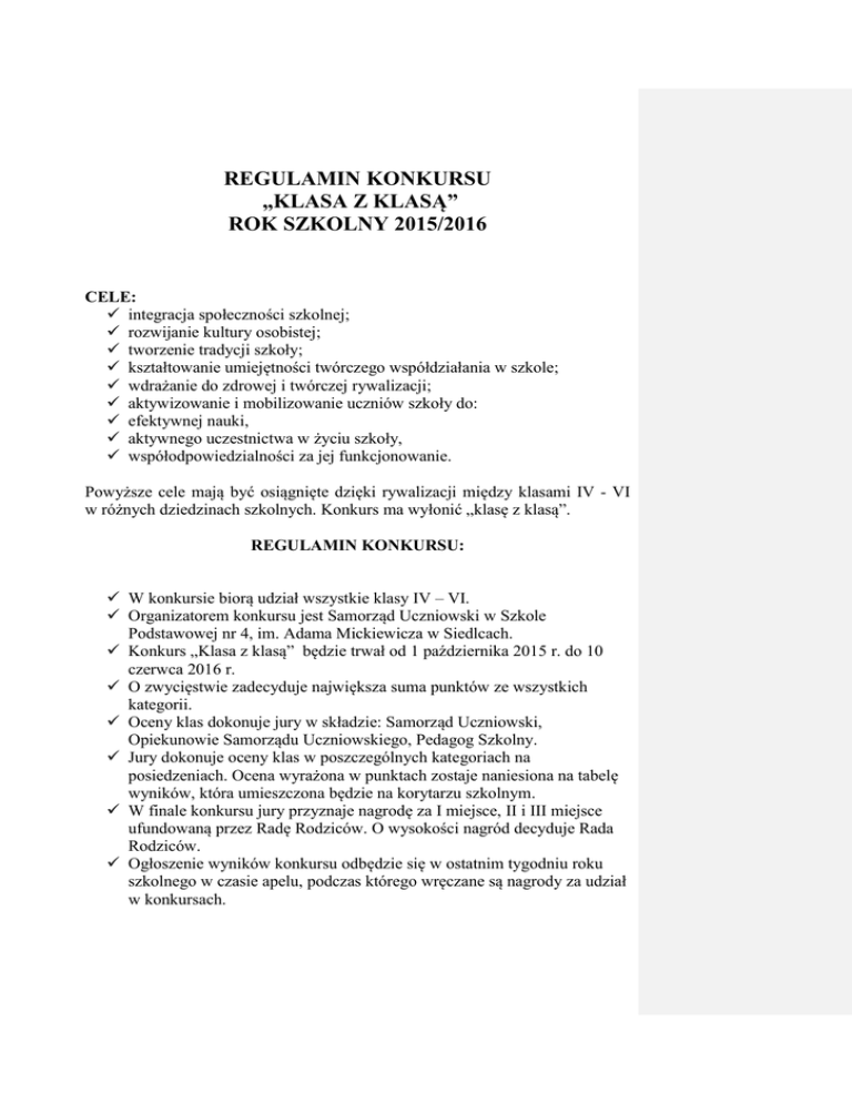 REGULAMIN KONKURSU „KLASA Z KLASĄ” ROK SZKOLNY 2015/2016 CELE: integracja społeczności szkolnej; rozwijanie kultury osobistej; tworzenie tradycji szkoły; kształtowanie umiejętności twórczego współdziałania w szkole; wdrażanie do zdrowej i twórczej rywalizacji; aktywizowanie i mobilizowanie uczniów szkoły do: efektywnej nauki, aktywnego uczestnictwa w życiu szkoły, współodpowiedzialności za jej funkcjonowanie. Powyższe cele mają być osiągnięte dzięki rywalizacji między klasami IV - VI w różnych dziedzinach szkolnych. Konkurs ma wyłonić „klasę z klasą”. REGULAMIN KONKURSU: W konkursie biorą udział wszystkie klasy IV – VI. Organizatorem konkursu jest Samorząd Uczniowski w Szkole Podstawowej nr 4, im. Adama Mickiewicza w Siedlcach. Konkurs „Klasa z klasą” będzie trwał od 1 października 2015 r. do 10 czerwca 2016 r. O zwycięstwie zadecyduje największa suma punktów ze wszystkich kategorii. Oceny klas dokonuje jury w składzie: Samorząd Uczniowski, Opiekunowie Samorządu Uczniowskiego, Pedagog Szkolny. Jury dokonuje oceny klas w poszczególnych kategoriach na posiedzeniach. Ocena wyrażona w punktach zostaje naniesiona na tabelę wyników, która umieszczona będzie na korytarzu szkolnym. W finale konkursu jury przyznaje nagrodę za I miejsce, II i III miejsce ufundowaną przez Radę Rodziców. O wysokości nagród decyduje Rada Rodziców. Ogłoszenie wyników konkursu odbędzie się w ostatnim tygodniu roku szkolnego w czasie apelu, podczas którego wręczane są nagrody za udział w konkursach. Klasa, która w danym roku zajęła I miejsce w konkursie ma prawo do tytułu „Klasy z klasą” przez następny rok szkolny. Obszary współzawodnictwa: 1. Wyniki nauce. 2. Zachowanie. 3. Frekwencja. 4. Czytelnictwo. 5. Udział w konkursach przedmiotowych. 6. Udział w zawodach sportowych. 7. Udział w akcjach charytatywnych. 8. Zaangażowanie w życie szkoły. 9. Wygląd pomieszczeń klasowych. 10. Zmiana obuwia. 11. Strój. W konkursie pod uwagę bierzemy: 1. Oceny semestralne i końcowo-roczne. Za wyniki w nauce punkty zostaną przyznane wg zasady: Klasa z najwyższą średnią otrzymuje 11 pkt. i odpowiednio 9,8,7 …itd. 2. Semestralne i końcowo-roczne oceny z zachowania. Za wyniki z zachowania punkty zostaną przyznane wg zasady: Ilość ocen wzorowych na koniec każdego semestru: za każdą ocenę wzorową uczeń otrzymuje 2 punkty na rzecz klasy; za każdą ocenę bardzo dobrą uczeń otrzymuje 1 punkt na rzecz klasy. jeżeli uczniowie otrzymają ocenę nieodpowiednią, Klasie zostanie odjęty – 1pkt., naganną – 2 pkt. Komentarz [u1]: 3. Frekwencja semestralna i końcowo-roczna. Punktami zostaną nagrodzone 3 klasy, które opuściły najmniej godzin lekcyjnych. - za I miejsce – 8 pkt. - za II miejsce – 4 pkt. - za III miejsce – 2 pkt. 4. Czytelnictwo. Klasa, która osiągnie najlepszy wynik w czytelnictwie w danym miesiącu otrzyma 11 pkt., następnie odpowiednio 9,8,7 itd. 5. Udział w konkursach przedmiotowych. - w etapie miejskim – 3 pkt. za każdego ucznia - w etapie rejonowym – 5 pkt. za każdego ucznia - w etapie wojewódzkim lub wyższym – 10 pkt. za każdego ucznia 6. Udział w zawodach sportowych. - w etapie miejskim – 1 pkt. za każdego ucznia - na etapie rejonowym – 2 pkt. za każdego ucznia - na etapie wojewódzkim lub wyższym – 3 pkt. za każdego ucznia 7. Udział w akcjach charytatywnych. Praca na rzecz organizacji i przeprowadzenia akcji charytatywnych – 2 pkt. za każdego ucznia. 8. Zaangażowanie w życie szkoły. - klasy przygotowujące szkolne apele i akademie – otrzymają po 5 pkt. - inne akcje pojawiające się w trakcie roku szkolnego – 3pkt. - dla uczniów, którzy wspomagają organizację imprez szkolnych - 2pkt 9. Wygląd pomieszczeń klasowych. Co 2 tygodnie komisja sprawdza wygląd klasy. Sprawdza zarówno wartość merytoryczną, jak i graficzną. Punktacja: 1-5 pkt. 10. Zmiana obuwia. Za każdym razem, gdy w klasie zostanie sprawdzone obuwie, a uczeń nie zmieni obuwia, Klasie zostanie odjęty 1pkt. 11. Strój Za każdym razem, gdy uczeń na uroczystości szkolne przyjdzie w stroju niezgodnym z zapisami w statucie, Klasie zostanie odjęte 2 pkt. za każdego ucznia. Samorząd Uczniowski: Przewodniczący: Joanna Wyrzykowska Zastępca: Wiktoria Sawicka Zastępca: Magdalena Jabłkowska Opiekunowie Samorządu Uczniowskiego: Agnieszka Protasiuk Anna Szostak