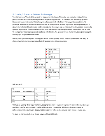 St. Louis, 22 marca. Sukces Pafnucego Turniej teamów Vanderbilta wszedł w fazę ćwierćfinałową. Niestety, nie ma już w niej polskich graczy. Pozostało nam się emocjonować innymi rozgrywkami. W turnieju par na maksy (puchar Silodora) rangi mistrzostw USA olbrzymi sukces odnieśli młodzicy: Pafnucy z Nowosadzkim. W pewnym momencie po zakończeniu turnieju w komputerze znaleźli się nawet na drugim miejscu i zjawił się redaktor biuletynu do zrobienia zdjęcia. Skończyło się na miejscu trzecim, co jest naprawdę sporym wyczynem. Dawno żadna polska para tak wysoko się nie uplasowała na turnieju par w USA. W następnej relacji opiszę jakieś rozdania młodzików. Na gorąca Paweł stwierdził, że najsilniejszą ich bronią była rozgrywka Nowosada. Nasza para tym razem grała trochę pod wiatr. Skończyliśmy na 29. miejscu (na blisko 300 par), a elementy niefartu rekompensowała trafna rozgrywka Mazurkiewicza. ♠ ♥ ♦ ♣ ♠ 10 4 ♥ 6 W ♦ K W 7 5 3 ♣ D 10 9 7 2 ♠ ♥ ♦ ♣ AW976 K43 42 W654 N E S KD52 A W 10 8 7 5 9 83 ♠ 8 4 ♥ D 9 2 ♦ A D 10 8 6 ♣ A K 3 WE po partii. W JIll Myers Pas 4♦ Pas N E Mazurkiewicz Pas 1♠ 2♦ 4♠ Pas S Jassem 1♥ 2♠ Pas Wistujący zgarnął dwa topy treflowe, ściągnął asa karo i wyszedł w pika. Po sprawdzeniu równego podziału atutów Mazurkiewicz zadał sobie pytanie, co skłoniło Jill Myers do skoku na 4♦ w założeniach niekorzystnych. Odpowiedź mogła być tylko jedna: singiel kier. Impas i swoja gra. To było w eliminacjach. A w finale przyszedł brat bliźniak: ♠ ♥ ♦ ♣ A9543 A43 AW K65 N ♠ 2 ♥ D 5 W E ♦ D 10 8 6 5 4 ♣ D W 4 3 S ♠ K 10 7 6 ♥ K W 10 8 7 6 ♦ K 3 2 ♣ W 2♦ Pas Pas N Mazurkiewicz 2BA 3♥ Pas E Pas Pas Pas ♠ D W 8 ♥ 9 2 ♦ 9 7 ♣ A 10 9 8 7 2 S Jassem 3♦ 4♥ Wist: ♦9. 2♦ oznaczało słabe dwa na karach. Pozornie trzeba impasować damę tam, gdzie jest mniej kar. Marcin doszedł jednak do wniosku, że sporo par może zagrać szlemika w piki. A skoro tak, to lepiej żeby właśnie ten kolor się nie dzielił równo. A w tej sytuacji kiery powinny być po dwa. I proszę! Jeszcze mało? ♠ ♥ ♦ ♣ ♠ D 5 ♥ K D 8 4 3 2 W ♦ A W 3 ♣ 4 3 ♠ ♥ ♦ ♣ W 1♥ N E Mazurkiewicz Pas Pas K64 A 10 5 D754 D86 N S A W 10 3 65 10 6 2 AKW5 S Jassem ktr ♠ 9 8 7 2 E ♥ W 9 ♦ K 9 8 ♣ 10 9 7 2 Pas Pas 1BA Pas Pas Złośliwy wist: walet kier. Kiery dwa razy przepuszczone. Grać na swoje, czy na nadróbki? I kto ma damę pik? Marcin przydzielił graczowi E figurę karo (może W by się pochwalił i zgrał jedną z nich?), stwierdził więc, że damkę pikową powinien mieć W. Wszedł do stołu, zagrał waleta pik, a gdy W nie postawił damy, twardo przepuścił. 9 lew! Oby tak Marcinowi wychodziła rozgrywka również dzisiaj, w turnieju teamów na odchodzenie!