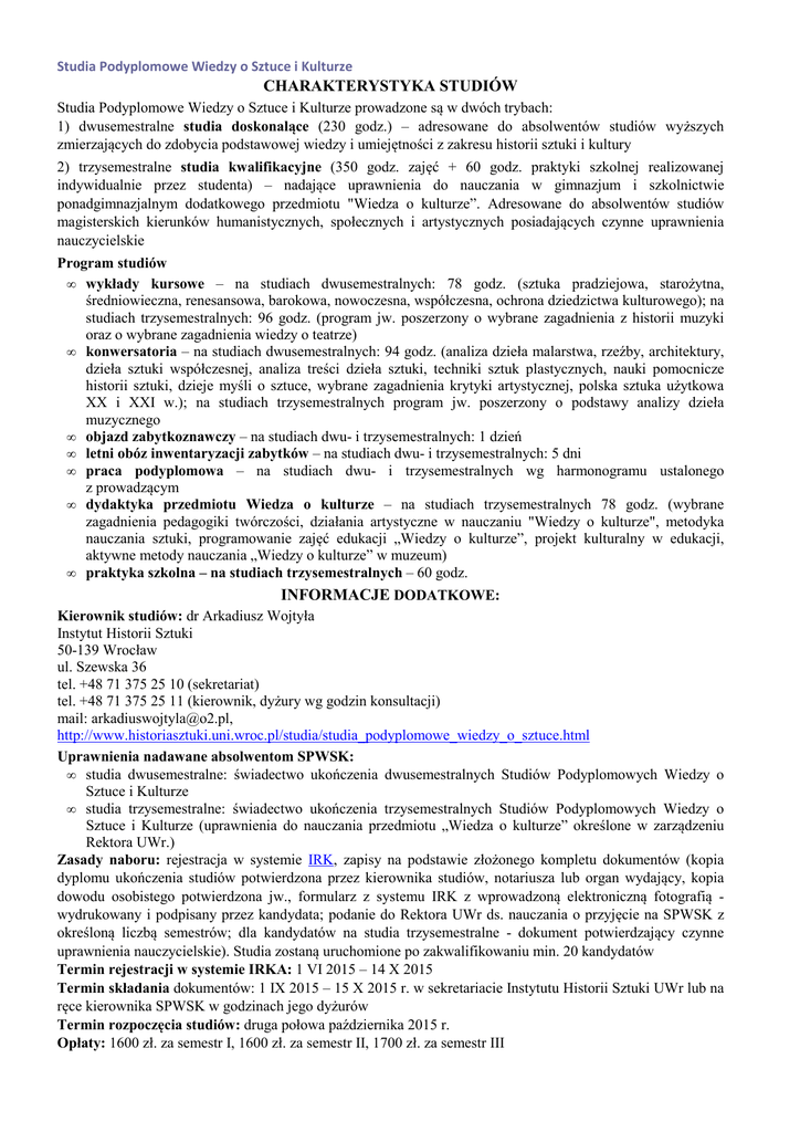 Studia Podyplomowe Wiedzy o Sztuce i Kulturze CHARAKTERYSTYKA STUDIÓW Studia Podyplomowe Wiedzy o Sztuce i Kulturze prowadzone są w dwóch trybach: 1) dwusemestralne studia doskonalące (230 godz.) – adresowane do absolwentów studiów wyższych zmierzających do zdobycia podstawowej wiedzy i umiejętności z zakresu historii sztuki i kultury 2) trzysemestralne studia kwalifikacyjne (350 godz. zajęć + 60 godz. praktyki szkolnej realizowanej indywidualnie przez studenta) – nadające uprawnienia do nauczania w gimnazjum i szkolnictwie ponadgimnazjalnym dodatkowego przedmiotu "Wiedza o kulturze”. Adresowane do absolwentów studiów magisterskich kierunków humanistycznych, społecznych i artystycznych posiadających czynne uprawnienia nauczycielskie Program studiów • wykłady kursowe – na studiach dwusemestralnych: 78 godz. (sztuka pradziejowa, starożytna, średniowieczna, renesansowa, barokowa, nowoczesna, współczesna, ochrona dziedzictwa kulturowego); na studiach trzysemestralnych: 96 godz. (program jw. poszerzony o wybrane zagadnienia z historii muzyki oraz o wybrane zagadnienia wiedzy o teatrze) • konwersatoria – na studiach dwusemestralnych: 94 godz. (analiza dzieła malarstwa, rzeźby, architektury, dzieła sztuki współczesnej, analiza treści dzieła sztuki, techniki sztuk plastycznych, nauki pomocnicze historii sztuki, dzieje myśli o sztuce, wybrane zagadnienia krytyki artystycznej, polska sztuka użytkowa XX i XXI w.); na studiach trzysemestralnych program jw. poszerzony o podstawy analizy dzieła muzycznego • objazd zabytkoznawczy – na studiach dwu- i trzysemestralnych: 1 dzień • letni obóz inwentaryzacji zabytków – na studiach dwu- i trzysemestralnych: 5 dni • praca podyplomowa – na studiach dwu- i trzysemestralnych wg harmonogramu ustalonego z prowadzącym • dydaktyka przedmiotu Wiedza o kulturze – na studiach trzysemestralnych 78 godz. (wybrane zagadnienia pedagogiki twórczości, działania artystyczne w nauczaniu "Wiedzy o kulturze", metodyka nauczania sztuki, programowanie zajęć edukacji „Wiedzy o kulturze”, projekt kulturalny w edukacji, aktywne metody nauczania „Wiedzy o kulturze” w muzeum) • praktyka szkolna – na studiach trzysemestralnych – 60 godz. INFORMACJE DODATKOWE: Kierownik studiów: dr Arkadiusz Wojtyła Instytut Historii Sztuki 50-139 Wrocław ul. Szewska 36 tel. +48 71 375 25 10 (sekretariat) tel. +48 71 375 25 11 (kierownik, dyżury wg godzin konsultacji) mail: [email protected], http://www.historiasztuki.uni.wroc.pl/studia/studia_podyplomowe_wiedzy_o_sztuce.html Uprawnienia nadawane absolwentom SPWSK: • studia dwusemestralne: świadectwo ukończenia dwusemestralnych Studiów Podyplomowych Wiedzy o Sztuce i Kulturze • studia trzysemestralne: świadectwo ukończenia trzysemestralnych Studiów Podyplomowych Wiedzy o Sztuce i Kulturze (uprawnienia do nauczania przedmiotu „Wiedza o kulturze” określone w zarządzeniu Rektora UWr.) Zasady naboru: rejestracja w systemie IRK, zapisy na podstawie złożonego kompletu dokumentów (kopia dyplomu ukończenia studiów potwierdzona przez kierownika studiów, notariusza lub organ wydający, kopia dowodu osobistego potwierdzona jw., formularz z systemu IRK z wprowadzoną elektroniczną fotografią wydrukowany i podpisany przez kandydata; podanie do Rektora UWr ds. nauczania o przyjęcie na SPWSK z określoną liczbą semestrów; dla kandydatów na studia trzysemestralne - dokument potwierdzający czynne uprawnienia nauczycielskie). Studia zostaną uruchomione po zakwalifikowaniu min. 20 kandydatów Termin rejestracji w systemie IRKA: 1 VI 2015 – 14 X 2015 Termin składania dokumentów: 1 IX 2015 – 15 X 2015 r. w sekretariacie Instytutu Historii Sztuki UWr lub na ręce kierownika SPWSK w godzinach jego dyżurów Termin rozpoczęcia studiów: druga połowa października 2015 r. Opłaty: 1600 zł. za semestr I, 1600 zł. za semestr II, 1700 zł. za semestr III
