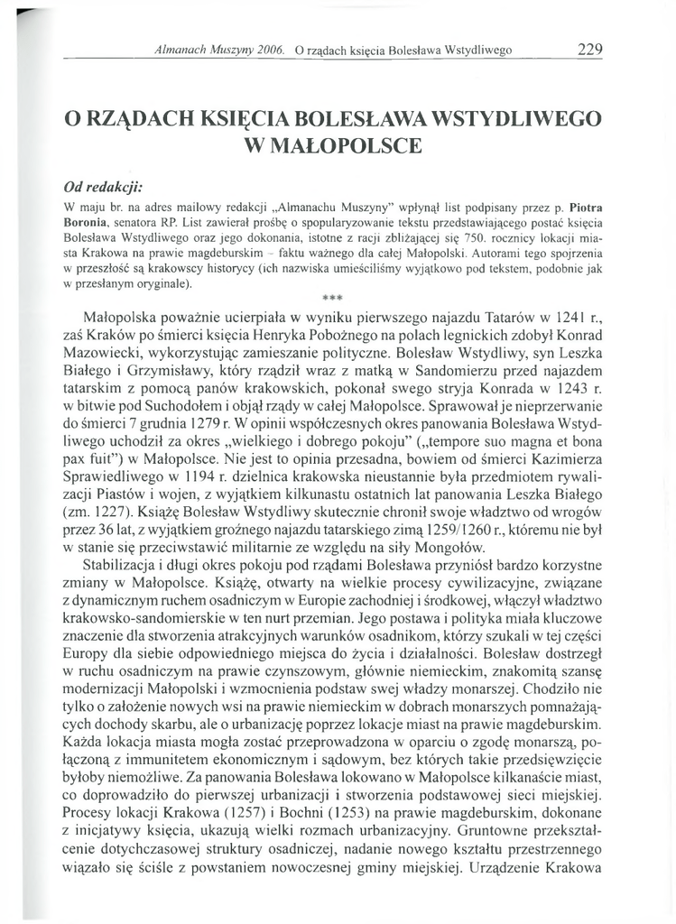 Almanach M uszyny 2006. O rządach księcia Bolesława W stydliwego 229 O RZĄDACH KSIĘCIA BOLESŁAWA WSTYDLIWEGO W MAŁOPOLSCE Od redakcji: W maju br. na adres mailowy redakcji ״Almanachu Muszyny” wpłynął list podpisany przez p. P io tra Boronia, senatora RP. List zawierał prośbę o spopularyzowanie tekstu przedstawiającego postać księcia Bolesława W stydliwego oraz jego dokonania, istotne z racji zbliżającej się 750. rocznicy lokacji miasta Krakowa na prawie magdeburskim - faktu ważnego dla całej M ałopolski. Autorami tego spojrzenia w przeszłość są krakowscy historycy (ich nazwiska umieściliśmy wyjątkowo pod tekstem, podobnie jak w przesłanym oryginale). Małopolska poważnie ucierpiała w wyniku pierwszego najazdu Tatarów w 1241 r., zaś Kraków po śmierci księcia Henryka Pobożnego na polach legnickich zdobył Konrad Mazowiecki, wykorzystując zamieszanie polityczne. Bolesław Wstydliwy, syn Leszka Białego i Grzymisławy, który rządził wraz z matką w Sandomierzu przed najazdem tatarskim z pom ocą panów krakowskich, pokonał swego stryja Konrada w 1243 r. w bitwie pod Suchodołem i objął rządy w całej Małopolsce. Sprawował je nieprzerwanie do śmierci 7 grudnia 1279 r. W opinii współczesnych okres panowania Bolesława Wstydliwego uchodził za okres ״wielkiego i dobrego pokoju” ( ״tempore suo magna et bona pax fuit”) w Małopolsce. Nie jest to opinia przesadna, bowiem od śmierci Kazimierza Sprawiedliwego w 1194 r. dzielnica krakowska nieustannie była przedmiotem rywalizacji Piastów i wojen, z wyjątkiem kilkunastu ostatnich lat panowania Leszka Białego (zm. 1227). Książę Bolesław Wstydliwy skutecznie chronił swoje władztwo od wrogów przez 36 lat, z wyjątkiem groźnego najazdu tatarskiego zimą 1259/1260 r., któremu nie był w stanie się przeciwstawić militarnie ze względu na siły Mongołów. Stabilizacja i długi okres pokoju pod rządami Bolesława przyniósł bardzo korzystne zmiany w Małopolsce. Książę, otwarty na wielkie procesy cywilizacyjne, związane z dynamicznym ruchem osadniczym w Europie zachodniej i środkowej, włączył władztwo krakowsko-sandomierskie w ten nurt przemian. Jego postawa i polityka miała kluczowe znaczenie dla stworzenia atrakcyjnych warunków osadnikom, którzy szukali w tej części Europy dla siebie odpowiedniego miejsca do życia i działalności. Bolesław dostrzegł w ruchu osadniczym na prawie czynszowym, głównie niemieckim, znakomitą szansę modernizacji Małopolski i wzmocnienia podstaw swej władzy monarszej. Chodziło nie tylko o założenie nowych wsi na prawie niemieckim w dobrach monarszych pomnażających dochody skarbu, ale o urbanizację poprzez lokacje miast na prawie magdeburskim. Każda lokacja miasta mogła zostać przeprowadzona w oparciu o zgodę monarszą, połączoną z immunitetem ekonomicznym i sądowym, bez których takie przedsięwzięcie byłoby niemożliwe. Za panowania Bolesława lokowano w Małopolsce kilkanaście miast, co doprowadziło do pierwszej urbanizacji i stworzenia podstawowej sieci miejskiej. Procesy lokacji Krakowa (1257) i Bochni (1253) na prawie magdeburskim, dokonane z inicjatywy księcia, ukazują wielki rozmach urbanizacyjny. Gruntowne przekształcenie dotychczasowej struktury osadniczej, nadanie nowego kształtu przestrzennego wiązało się ściśle z powstaniem nowoczesnej gminy miejskiej. Urządzenie Krakowa 230 Zespół krakowskich historyków według wzoru Magdeburga na mocy aktu lokacyjnego księcia Bolesława Wstydliwego z 5 VI 1257 r. doprowadziło stworzenia fundamentów samorządu, bowiem powstała zaraz rada miejska, która szybko zyskała wielki wpływ na rządy w Krakowie. W wielu miastach Europy środkowowschodniej rada miejska rodziła się w długim procesie, niekiedy nawet poprzez konflikt z właścicielem miasta i wójtem. Główna instytucja sądowa, tj. ława miejska na czele z wójtem, sądziła mieszczan, zaś w sporach między ludnością rycerską, podlegającą zwyczajowemu prawu polskiemu i jego sądom, a mieszczanami książę wprowadził nowoczesną wtedy zasadę: ״actor forum rei sequi debeat”, co znaczy, że powód winien stawać przed sądem właściwym dla pozwanego. Zastosowanie tej zasady w życiu społecznym świadczy o wielkim poczuciu sprawiedliwości monarchy, bowiem książę chronił w ten sposób prawa tworzącego się stanu mieszczańskiego przed dominacją możnowładztwa i rycerstwa. W wyniku lokacji 1257 r. Kraków stał się miastem europejskim o silnym samorządzie, dynamicznym ośrodkiem handlu i rzemiosła o dalekosiężnym oddziaływaniu. Modernizacja Małopolski związana była również z rozwojem górnictwa. Pod rządami Bolesława Wstydliwego odkryto w 1251 r. sól kamienną w Bochni, a nieco później w Wieliczce oraz ołów w Olkuszu i kruszce w Chęcinach. Książę zmonopolizował górnictwo w swoich rękach, tworząc z salin bocheńsko-wielickich przedsiębiorstwa należące do domeny monarszej. Dzięki dalekowzrocznej polityce księcia stały się one jednym z podstawowych źródeł dochodów skarbu monarszego nie tylko w średniowieczu, ale również w następnych wiekach. Bolesław był politykiem o horyzontach przekraczających piastowskie dziedziny. Uczestniczył w wielkim środkowoeuropejskim konflikcie o spadek po austriackich Babenbergach - najpierw jako długoletni sojusznik potężnej monarchii Arpadów, a potem króla Czech Przemysła Ottokara II w jego starciu z Habsburgami. Wspierał plan pokojowej chrystianizacji Jaćwięgów i Litwinów, związany z koronacją Mendoga na króla Litwy w 1253 r., którą miał prowadzić dominikanin krakowski Wit, konsekrowany na biskupa litewskiego. Ponadto doprowadził do utworzenia biskupstwa łukowskiego na pograniczu małopolskim dla misji wśród Litwinów i Jaćwięgów. Potrafił wykorzystać kanonizację św. Stanisława, o którą zabiegał w Rzymie wraz z Kingą, dla wzmocnienia swego autorytetu, gdyż uroczysto