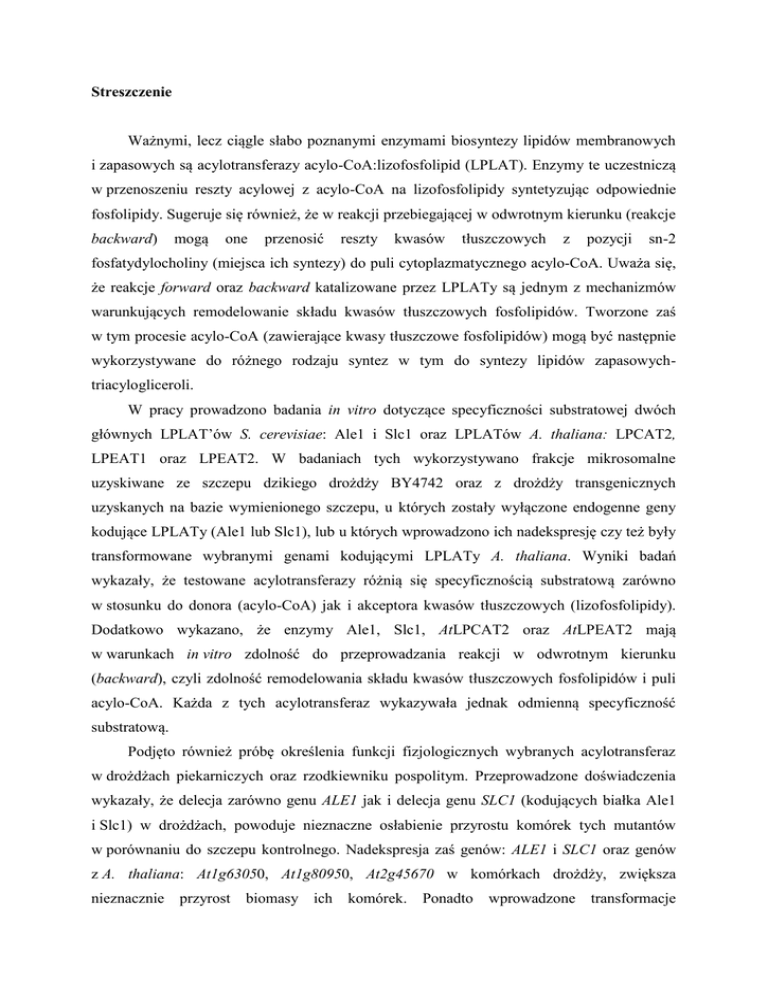 Streszczenie Ważnymi, lecz ciągle słabo poznanymi enzymami biosyntezy lipidów membranowych i zapasowych są acylotransferazy acylo-CoA:lizofosfolipid (LPLAT). Enzymy te uczestniczą w przenoszeniu reszty acylowej z acylo-CoA na lizofosfolipidy syntetyzując odpowiednie fosfolipidy. Sugeruje się również, że w reakcji przebiegającej w odwrotnym kierunku (reakcje backward) mogą one przenosić reszty kwasów tłuszczowych z pozycji sn-2 fosfatydylocholiny (miejsca ich syntezy) do puli cytoplazmatycznego acylo-CoA. Uważa się, że reakcje forward oraz backward katalizowane przez LPLATy są jednym z mechanizmów warunkujących remodelowanie składu kwasów tłuszczowych fosfolipidów. Tworzone zaś w tym procesie acylo-CoA (zawierające kwasy tłuszczowe fosfolipidów) mogą być następnie wykorzystywane do różnego rodzaju syntez w tym do syntezy lipidów zapasowychtriacylogliceroli. W pracy prowadzono badania in vitro dotyczące specyficzności substratowej dwóch głównych LPLAT’ów S. cerevisiae: Ale1 i Slc1 oraz LPLATów A. thaliana: LPCAT2, LPEAT1 oraz LPEAT2. W badaniach tych wykorzystywano frakcje mikrosomalne uzyskiwane ze szczepu dzikiego drożdży BY4742 oraz z drożdży transgenicznych uzyskanych na bazie wymienionego szczepu, u których zostały wyłączone endogenne geny kodujące LPLATy (Ale1 lub Slc1), lub u których wprowadzono ich nadekspresję czy też były transformowane wybranymi genami kodującymi LPLATy A. thaliana. Wyniki badań wykazały, że testowane acylotransferazy różnią się specyficznością substratową zarówno w stosunku do donora (acylo-CoA) jak i akceptora kwasów tłuszczowych (lizofosfolipidy). Dodatkowo wykazano, że enzymy Ale1, Slc1, AtLPCAT2 oraz AtLPEAT2 mają w warunkach in vitro zdolność do przeprowadzania reakcji w odwrotnym kierunku (backward), czyli zdolność remodelowania składu kwasów tłuszczowych fosfolipidów i puli acylo-CoA. Każda z tych acylotransferaz wykazywała jednak odmienną specyficzność substratową. Podjęto również próbę określenia funkcji fizjologicznych wybranych acylotransferaz w drożdżach piekarniczych oraz rzodkiewniku pospolitym. Przeprowadzone doświadczenia wykazały, że delecja zarówno genu ALE1 jak i delecja genu SLC1 (kodujących białka Ale1 i Slc1) w drożdżach, powoduje nieznaczne osłabienie przyrostu komórek tych mutantów w porównaniu do szczepu kontrolnego. Nadekspresja zaś genów: ALE1 i SLC1 oraz genów z A. thaliana: At1g63050, At1g80950, At2g45670 w komórkach drożdży, zwiększa nieznacznie przyrost biomasy ich komórek. Ponadto wprowadzone transformacje powodowały drobne zmiany w całkowitej zawartości lipidów w komórkach drożdży oraz niewielkie zmiany w składzie tych lipidów. Mutanty insercyjne (T-DNA) A. thaliana wykazujące brak aktywności LPEATów (acylotransferaz acylo-CoA:lizofosfatydyloetanoloamina) oraz mutanty z nadkspresją genów odpowiedzialnych za aktywność tych acylotransferaz (geny: At1g80950 - LPEAT1 oraz At2g45670 - LPEAT2) wykazywały wyraźne różnice fenotypowe w porównaniu do roślin kontrolnych. Wyłączenie badanych genów powodowało szereg defektów w rozwoju roślin. Mutanty te wykazywały karłowaty fenotyp oraz produkowały mniejszą ilość, mniejszych nasion. Nasiona, liście i korzenie tych mutantów posiadały także obniżoną zawartość i zazwyczaj zmieniony profil lipidów (w porównaniu do roślin kontrolnych). Nadekspresja zaś genów odpowiedzialnych za aktywność LPEAT powodowała, że rośliny były większe i produkowały większą ilość nasion. Korzenie tych mutantów charakteryzowały się natomiast wyższą, niż korzenie roślin kontrolych, zawartością lipidów (głównie polarnych).