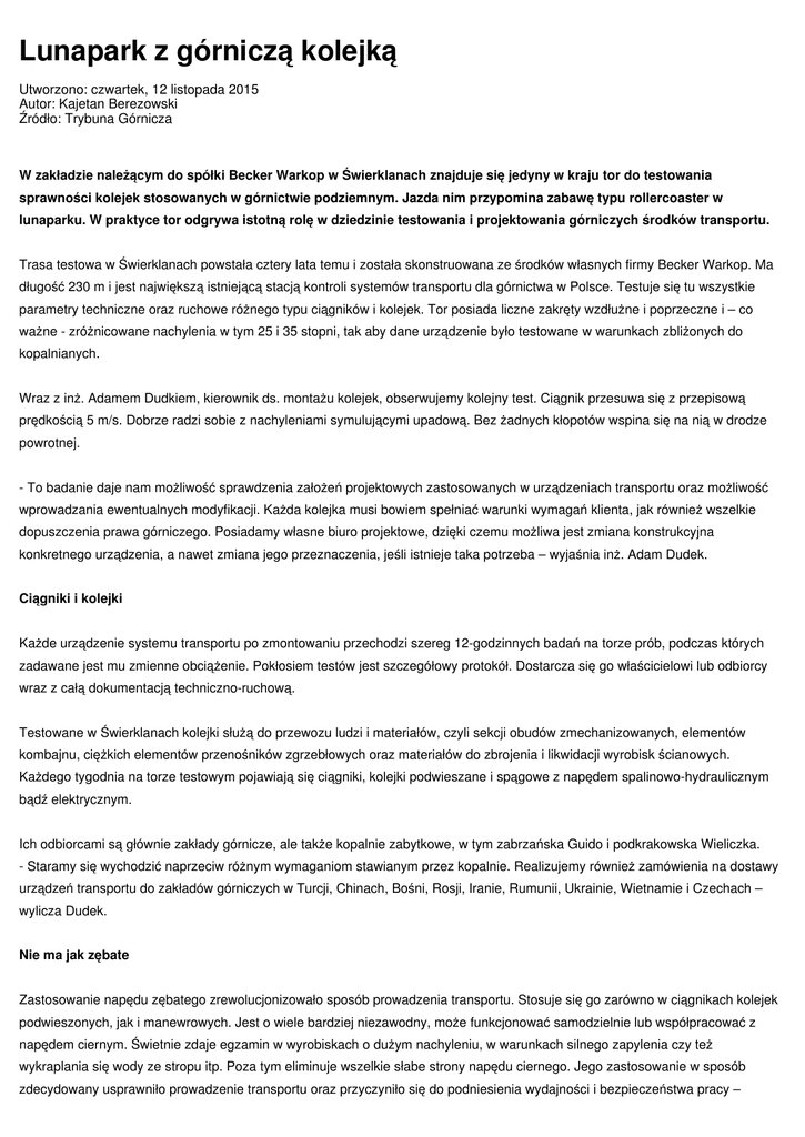 Lunapark z górniczą kolejką Utworzono: czwartek, 12 listopada 2015 Autor: Kajetan Berezowski Źródło: Trybuna Górnicza W zakładzie należącym do spółki Becker Warkop w Świerklanach znajduje się jedyny w kraju tor do testowania sprawności kolejek stosowanych w górnictwie podziemnym. Jazda nim przypomina zabawę typu rollercoaster w lunaparku. W praktyce tor odgrywa istotną rolę w dziedzinie testowania i projektowania górniczych środków transportu. Trasa testowa w Świerklanach powstała cztery lata temu i została skonstruowana ze środków własnych firmy Becker Warkop. Ma długość 230 m i jest największą istniejącą stacją kontroli systemów transportu dla górnictwa w Polsce. Testuje się tu wszystkie parametry techniczne oraz ruchowe różnego typu ciągników i kolejek. Tor posiada liczne zakręty wzdłużne i poprzeczne i – co ważne - zróżnicowane nachylenia w tym 25 i 35 stopni, tak aby dane urządzenie było testowane w warunkach zbliżonych do kopalnianych. Wraz z inż. Adamem Dudkiem, kierownik ds. montażu kolejek, obserwujemy kolejny test. Ciągnik przesuwa się z przepisową prędkością 5 m/s. Dobrze radzi sobie z nachyleniami symulującymi upadową. Bez żadnych kłopotów wspina się na nią w drodze powrotnej. - To badanie daje nam możliwość sprawdzenia założeń projektowych zastosowanych w urządzeniach transportu oraz możliwość wprowadzania ewentualnych modyfikacji. Każda kolejka musi bowiem spełniać warunki wymagań klienta, jak również wszelkie dopuszczenia prawa górniczego. Posiadamy własne biuro projektowe, dzięki czemu możliwa jest zmiana konstrukcyjna konkretnego urządzenia, a nawet zmiana jego przeznaczenia, jeśli istnieje taka potrzeba – wyjaśnia inż. Adam Dudek. Ciągniki i kolejki Każde urządzenie systemu transportu po zmontowaniu przechodzi szereg 12-godzinnych badań na torze prób, podczas których zadawane jest mu zmienne obciążenie. Pokłosiem testów jest szczegółowy protokół. Dostarcza się go właścicielowi lub odbiorcy wraz z całą dokumentacją techniczno-ruchową. Testowane w Świerklanach kolejki służą do przewozu ludzi i materiałów, czyli sekcji obudów zmechanizowanych, elementów kombajnu, ciężkich elementów przenośników zgrzebłowych oraz materiałów do zbrojenia i likwidacji wyrobisk ścianowych. Każdego tygodnia na torze testowym pojawiają się ciągniki, kolejki podwieszane i spągowe z napędem spalinowo-hydraulicznym bądź elektrycznym. Ich odbiorcami są głównie zakłady górnicze, ale także kopalnie zabytkowe, w tym zabrzańska Guido i podkrakowska Wieliczka. - Staramy się wychodzić naprzeciw różnym wymaganiom stawianym przez kopalnie. Realizujemy również zamówienia na dostawy urządzeń transportu do zakładów górniczych w Turcji, Chinach, Bośni, Rosji, Iranie, Rumunii, Ukrainie, Wietnamie i Czechach – wylicza Dudek. Nie ma jak zębate Zastosowanie napędu zębatego zrewolucjonizowało sposób prowadzenia transportu. Stosuje się go zarówno w ciągnikach kolejek podwieszonych, jak i manewrowych. Jest o wiele bardziej niezawodny, może funkcjonować samodzielnie lub współpracować z napędem ciernym. Świetnie zdaje egzamin w wyrobiskach o dużym nachyleniu, w warunkach silnego zapylenia czy też wykraplania się wody ze stropu itp. Poza tym eliminuje wszelkie słabe strony napędu ciernego. Jego zastosowanie w sposób zdecydowany usprawniło prowadzenie transportu oraz przyczyniło się do podniesienia wydajności i bezpieczeństwa pracy – tłumaczy dalej Dudek, śledząc test ruchu kolejki zębatej, która niebawem będzie wozić turystów po podziemnych wyrobiskach kopalni Guido. Produkowane ciągniki mogą być eksploatowane w podziemnych wyrobiskach górniczych ze stopniem „a”, „b”, „c” zagrożenia wybuchem metanu, przy koncentracji metanu do 1,5 proc. oraz klasy A i B zagrożenia wybuchem pyłu węglowego. - Przy projektowaniu nowych rozwiązań wykorzystano każdorazowo doświadczenia ruchowe z dotychczas przeprowadzonych testów. Istniejący tor jest pod tym względem wynalazkiem niezastąpionym – podsumowuje inż. Adam Dudek. Film z testów kolejki w zakładzie Becker Warkop tutaj