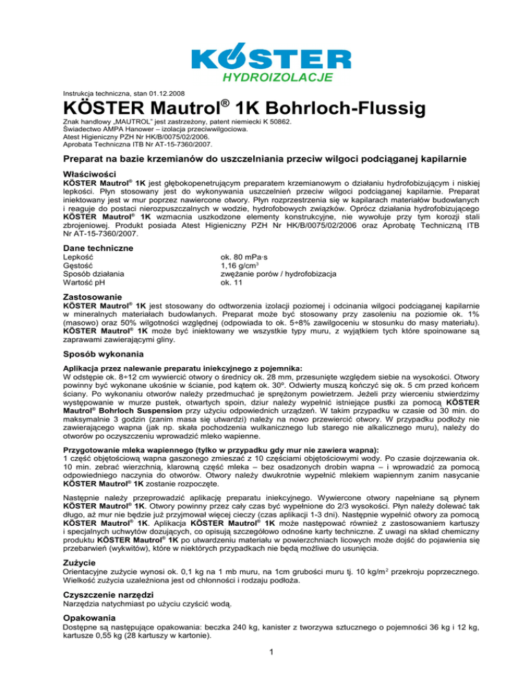 Instrukcja techniczna, stan 01.12.2008 KÖSTER Mautrol® 1K Bohrloch-Flussig Znak handlowy „MAUTROL” jest zastrzeżony, patent niemiecki K 50862. Świadectwo AMPA Hanower – izolacja przeciwwilgociowa. Atest Higieniczny PZH Nr HK/B/0075/02/2006. Aprobata Techniczna ITB Nr AT-15-7360/2007. Preparat na bazie krzemianów do uszczelniania przeciw wilgoci podciąganej kapilarnie Właściwości KÖSTER Mautrol® 1K jest głębokopenetrującym preparatem krzemianowym o działaniu hydrofobizującym i niskiej lepkości. Płyn stosowany jest do wykonywania uszczelnień przeciw wilgoci podciąganej kapilarnie. Preparat iniektowany jest w mur poprzez nawiercone otwory. Płyn rozprzestrzenia się w kapilarach materiałów budowlanych i reaguje do postaci nierozpuszczalnych w wodzie, hydrofobowych związków. Oprócz działania hydrofobizującego KÖSTER Mautrol® 1K wzmacnia uszkodzone elementy konstrukcyjne, nie wywołuje przy tym korozji stali zbrojeniowej. Produkt posiada Atest Higieniczny PZH Nr HK/B/0075/02/2006 oraz Aprobatę Techniczną ITB Nr AT-15-7360/2007. Dane techniczne Lepkość Gęstość Sposób działania Wartość pH ok. 80 mPa·s 1,16 g/cm3 zwężanie porów / hydrofobizacja ok. 11 Zastosowanie KÖSTER Mautrol® 1K jest stosowany do odtworzenia izolacji poziomej i odcinania wilgoci podciąganej kapilarnie w mineralnych materiałach budowlanych. Preparat może być stosowany przy zasoleniu na poziomie ok. 1% (masowo) oraz 50% wilgotności względnej (odpowiada to ok. 5÷8% zawilgoceniu w stosunku do masy materiału). KÖSTER Mautrol® 1K może być iniektowany we wszystkie typy muru, z wyjątkiem tych które spoinowane są zaprawami zawierającymi gliny. Sposób wykonania Aplikacja przez nalewanie preparatu iniekcyjnego z pojemnika: W odstępie ok. 8÷12 cm wywiercić otwory o średnicy ok. 28 mm, przesunięte względem siebie na wysokości. Otwory powinny być wykonane ukośnie w ścianie, pod kątem ok. 30º. Odwierty muszą kończyć się ok. 5 cm przed końcem ściany. Po wykonaniu otworów należy przedmuchać je sprężonym powietrzem. Jeżeli przy wierceniu stwierdzimy występowanie w murze pustek, otwartych spoin, dziur należy wypełnić istniejące pustki za pomocą KÖSTER Mautrol® Bohrloch Suspension przy użyciu odpowiednich urządzeń. W takim przypadku w czasie od 30 min. do maksymalnie 3 godzin (zanim masa się utwardzi) należy na nowo przewiercić otwory. W przypadku podłoży nie zawierającego wapna (jak np. skała pochodzenia wulkanicznego lub starego nie alkalicznego muru), należy do otworów po oczyszczeniu wprowadzić mleko wapienne. Przygotowanie mleka wapiennego (tylko w przypadku gdy mur nie zawiera wapna): 1 część objętościową wapna gaszonego zmieszać z 10 częściami objętościowymi wody. Po czasie dojrzewania ok. 10 min. zebrać wierzchnią, klarowną część mleka – bez osadzonych drobin wapna – i wprowadzić za pomocą odpowiedniego naczynia do otworów. Otwory należy dwukrotnie wypełnić mlekiem wapiennym zanim nasycanie KÖSTER Mautrol® 1K zostanie rozpoczęte. Następnie należy przeprowadzić aplikację preparatu iniekcyjnego. Wywiercone otwory napełniane są płynem KÖSTER Mautrol® 1K. Otwory powinny przez cały czas być wypełnione do 2/3 wysokości. Płyn należy dolewać tak długo, aż mur nie będzie już przyjmował więcej cieczy (czas aplikacji 1-3 dni). Następnie wypełnić otwory za pomocą KÖSTER Mautrol® 1K. Aplikacja KÖSTER Mautrol® 1K może następować również z zastosowaniem kartuszy i specjalnych uchwytów dozujących, co opisują szczegółowo odnośne karty techniczne. Z uwagi na skład chemiczny produktu KÖSTER Mautrol® 1K po utwardzeniu materiału w powierzchniach licowych może dojść do pojawienia się przebarwień (wykwitów), które w niektórych przypadkach nie będą możliwe do usunięcia. Zużycie Orientacyjne zużycie wynosi ok. 0,1 kg na 1 mb muru, na 1cm grubości muru tj. 10 kg/m 2 przekroju poprzecznego. Wielkość zużycia uzależniona jest od chłonności i rodzaju podłoża. Czyszczenie narzędzi Narzędzia natychmiast po użyciu czyścić wodą. Opakowania Dostępne są następujące opakowania: beczka 240 kg, kanister z tworzywa sztucznego o pojemności 36 kg i 12 kg, kartusze 0,55 kg (28 kartuszy w kartonie). 1 Przechowywanie Materiał należy przechowywać w chłodnym pomieszczeniu, chronić przed mrozem. Składowanie do 24 miesięcy. Środki ostrożności Nosić okulary ochronne i rękawice ochronne. Uwagi ogólne Powyższe wskazówki opierają się na aktualnym stanie naszej wiedzy i naszego doświadczenia. Nie niosą za sobą odpowiedzialności prawnej i nie zwalniają wykonawcy od odpowiedzialności za wykonaną pracę. W czasie wykonywania prac należy przestrzegać odpowiednich norm i ogólnie przyjętych reguł sztuki budowlanej, a także uwzględniać warunki panujące na budowie. KOESTER Polska Sp. z o.o. 31-416 Kraków; ul. Dobrego Pasterza 121 tel. 012/ 411 49 94; fax 012/ 413 09 63 www.koester.pl; e-mail: [email protected] 2