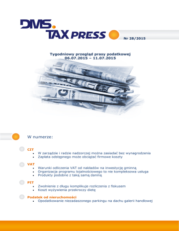 Nr 28/2015 Tygodniowy przegląd prasy podatkowej 06.07.2015 – 11.07.2015 W numerze: CIT · · W zarządzie i radzie nadzorczej można zasiadać bez wynagrodzenia Zapłata odstępnego może obciążać firmowe koszty VAT · · · Warunki odliczenia VAT od nakładów na inwestycję gminną Organizacja programu lojalnościowego to nie kompleksowa usługa Produkty podobne z taką samą daniną PIT · · Zwolnienie z długu komplikuje rozliczenia z fiskusem Koszt wyżywienia przekroczy dietę Podatek od nieruchomości · Opodatkowanie niezadaszonego parkingu na dachu galerii handlowej CIT W zarządzie i radzie nadzorczej można zasiadać bez wynagrodzenia Źródło: Rzeczpospolita, Bożena Nowicka, 06-07-2015 W niniejszym artykule autor omawia aktualne stanowisko organów skarbowych na temat powstawania przychodu po stronie spółki kapitałowej w sytuacji, gdy funkcję członków zarządu pełnią nieodpłatnie osoby będące jej wspólnikami. Pani Bożena Nowicka wskazuje, że izby skarbowe prezentowały do tej pory przychylne dla podatników stanowisko, zgodnie z którym spółka nie uzyskuje przychodu z nieodpłatnych świadczeń, jeżeli w jej władzach zasiada osoba będąca jednocześnie udziałowcem lub akcjonariuszem i wykonuje swoje obowiązki bez wynagrodzenia. W takich przypadkach nie można mówić o nieodpłatnym świadczeniu dla spółki, gdyż wspólnik będący jednocześnie członkiem zarządu jest zainteresowany, aby uzyskać od spółki w przyszłości świadczenie wzajemne (dywidenda, przychód z odpłatnego zbycia udziałów). Organy potwierdzają także, że jeśli funkcję członka zarządu pełni nieodpłatnie pracownik zatrudniony u akcjonariusza spółki, to po stronie spółki także nie powstaje przychód z nieodpłatnych świadczeń (interpretacja Izby Skarbowej w Łodzi z dnia 8 kwietnia 2015 r., IPTPB3/4510-33/ 15-4/PM). [pobierz artykuł] Zapłata odstępnego może obciążać firmowe koszty Źródło: Gazeta Podatkowa, Redakcja Gazety Podatkowej, 09-07-2015 W niniejszym artykule autor omawia wyrok WSA w Krakowie z dnia 27 kwietnia 2015 r. (I SA/Kr 28/15). Spółka prowadziła działalność handlową na terenach hipermarketów w lokalach użytkowanych na podstawie umów najmu. Z uwagi na zmienną sytuację rynkową i zmniejszającą się opłacalność spółka niejednokrotnie podejmowała decyzję o zaprzestaniu prowadzenia działalności w danej lokalizacji przed zakończeniem umowy najmu. To z kolei wiązało się z koniecznością zapłaty wynajmującemu kwoty odstępnego. Obowiązek zapłaty rekompensaty występował także w przypadku, gdy jeszcze przed zawarciem umowy najmu wynajmujący dostosował nieruchomość na potrzeby spółki, a podatniczka finalnie nie zdecydowała się na jej podpisanie. Spółka miała wątpliwości, czy kwotę odstępnego może zaliczyć do kosztów uzyskania przychodów. Fiskus uznał, że nie ma takiej możliwości, gdyż odstąpienie od umowy w celu zmniejszenia straty ekonomicznej nie jest wystarczającą podstawą do uznania, że mamy do czynienia z zabezpieczeniem źródła przychodów. Sprawa trafiła do WSA w Krakowie, który uwzględnił skargę spółki wskazując, że wydatki na odstępne spełniają przesłanki do uznania ich za koszt podatkowy. [pobierz artykuł] VAT Warunki odliczenia VAT od nakładów na inwestycję gminną Źródło: Gazeta Podatkowa, Redakcja Gazety Podatkowej, 06-07-2015 Autor artykułu analizuje interpretację Izby Skarbowej w Łodzi z dnia 18 maja 2015 r. (IPTPP1/4512-169/15-3/MW). Gmina będąca czynnym podatnikiem VAT planowała przeprowadzić inwestycję polegającą na wybudowaniu obiektu sportowego składającego się z boiska o nawierzchni ze sztuczną trawą, boiska wielofunkcyjnego, bieżni oraz instalacji odwodnienia boisk. Wszystkie wydatki gminy w tym zakresie będą potwierdzone fakturami VAT. Gmina chciała, aby organ potwierdził jej, że będzie mogła odliczać podatek VAT od w/w wydatków, gdyż będą one związane z wykonywaniem czynności opodatkowanych. Gmina zamierza bowiem wydzierżawiać obiekt sportowy. Izba skarbowa w pełni podzieliła pogląd, że wnioskodawczyni będzie uprawniona do odliczenia podatku VAT z faktur dokumentujących przeprowadzenie w/w inwestycji . Organ przypomniał , że prawdo do odliczenia VAT Nr 28 / 2015 2 przysługuje wówczas, gdy nabyte towary i usługi są wykorzystywane do wykonywania czynności opodatkowanych, tj. „takich, których następstwem jest określenie podatku należnego (powstanie zobowiązania podatkowego)”. [pobierz artykuł] Organizacja programu lojalnościowego to nie kompleksowa usługa Źródło: Rzeczpospolita, Patrycja Niemczyk, 06-07-2015 Autor artykułu analizuje wyrok WSA w Poznaniu z dnia 16 kwietnia 2015 r. (I SA/Po 466/15). Spółka świadczyła na rzecz swoich akcjonariuszy usługę organizacji kompleksowego programu lojalnościowego. Za dokonanie zakupów uczestnicy programu otrzymywali punkty podlegające wymianie na nagrody. Spółka otrzymywała wynagrodzenie za świadczoną usługę, tj. równowartość kosztów nagród oraz prowizję. Zdaniem spółki, wydanie nagród w ramach programu lojalnościowego jego uczestnikom nie powoduje powstania po jej stronie obowiązku podatkowego w VAT. Wynika to z faktu, iż wartość przekazanych nagród stanowi element otrzymywanego od zleceniodawcy wynagrodzenia z tytułu świadczenia kompleksowej usługi. Organ uznał jednak, że wydanie nagród jest dostawą towarów w świetle uVAT, gdyż mamy do czynienia tutaj z przeniesieniem prawa do rozporządzaniem towarem jak właściciel. Spółka próbowała dochodzić swoich racji przed WSA, ale sąd oddalił jej skargę. WSA przypomniał treść wyroku NSA z dnia 10 października 2014 roku (I FSK 1523/13), zgodnie z którym „obsługa programu lojalnościowego oraz wydanie w jej ramach nagród to dwa odrębne świadczenia: świadczenie usług i dostawa towarów”. [pobierz artykuł] Produkty podobne z taką sa