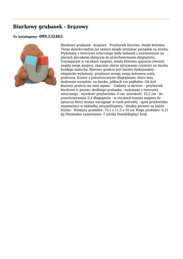 Biurkowy grubasek - brązowy Nr katalogowy: 099,132465 Biurkowy grubasek - brązowy Przybornik biurowy, dzięki któremu Twoje dziecko będzie już zawsze mogło utrzymać porządek na biurku. Wykonany z tworzywa sztucznego mały bobasek z zawieszonym na plecach plecakiem służącym do przechowywania długopisów, trzymającym w rączkach magnes, dzięki któremu spinacze również znajdą swoje miejsce, znacznie ułatwi utrzymanie czystości na biurku każdego malucha. Biurowy grubcio jest bardzo funkcjonalny, elegancko wykonany, przykuwa uwagę swoją kolorową szatą graficzną. Koniec z porozrzucanymi długopisami, które leżą dosłownie wszędzie, na biurku, półkach czy podłodze. Od dziś biurowy grubcio się nimi zajmie. Gadżety w skrócie: - przybornik biurkowy w postaci słodkiego grubaska - wykonany z tworzywa sztucznego - wysokość przybornika: 9 cm, szerokość: 10,5 cm - do przechowywania 2-4 długopisów - w raczkach trzyma magnes do spinaczy który można wyciągnąć w razie potrzeby - spód przybornika wyposażony w nakładkę antypoślizgową - idealny prezent na każde biurko Wymiary produktu: 10,5 x 11,5 x 10 cm Waga produktu: 0,21 kg Minimalne zamówienie: 1 sztuka Stand/display: brak