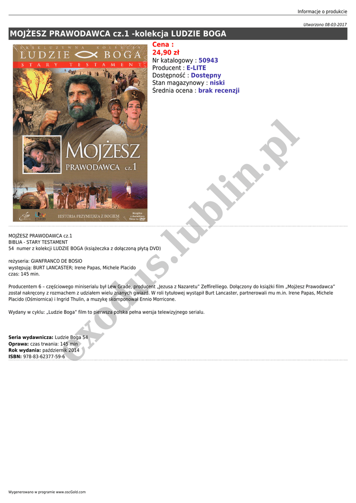 Informacje o produkcie Utworzono 08-03-2017 MOJŻESZ PRAWODAWCA cz.1 -kolekcja LUDZIE BOGA Cena : 24,90 zł .lu bl in .p l Nr katalogowy : 50943 Producent : E-LITE Dostępność : Dostępny Stan magazynowy : niski Średnia ocena : brak recenzji MOJŻESZ PRAWODAWCA cz.1 BIBLIA - STARY TESTAMENT 54 numer z kolekcji LUDZIE BOGA (książeczka z dołączoną płytą DVD) od us reżyseria: GIANFRANCO DE BOSIO występują: BURT LANCASTER; Irene Papas, Michele Placido czas: 145 min. Producentem 6 – częściowego miniserialu był Lew Grade, producent „Jezusa z Nazaretu” Zeffirelliego. Dołączony do książki film „Mojżesz Prawodawca” został nakręcony z rozmachem z udziałem wielu znanych gwiazd. W roli tytułowej wystąpił Burt Lancaster, partnerowali mu m.in. Irene Papas, Michele Placido (Ośmiornica) i Ingrid Thulin, a muzykę skomponował Ennio Morricone. ex Wydany w cyklu: „Ludzie Boga” film to pierwsza polska pełna wersja telewizyjnego serialu. Seria wydawnicza: Ludzie Boga 54 Oprawa: czas trwania: 145 min Rok wydania: październik 2014 ISBN: 978-83-62377-59-6 Wygenerowano w programie www.oscGold.com