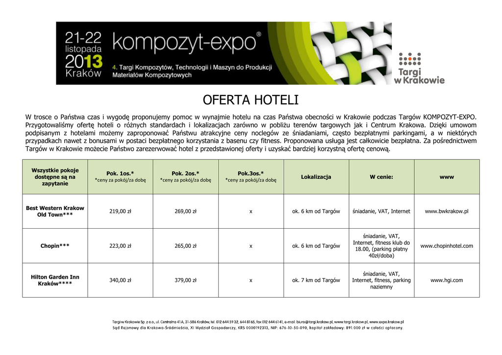 OFERTA HOTELI W trosce o Państwa czas i wygodę proponujemy pomoc w wynajmie hotelu na czas Państwa obecności w Krakowie podczas Targów KOMPOZYT-EXPO. Przygotowaliśmy ofertę hoteli o różnych standardach i lokalizacjach zarówno w pobliżu terenów targowych jak i Centrum Krakowa. Dzięki umowom podpisanym z hotelami możemy zaproponować Państwu atrakcyjne ceny noclegów ze śniadaniami, często bezpłatnymi parkingami, a w niektórych przypadkach nawet z bonusami w postaci bezpłatnego korzystania z basenu czy fitness. Proponowana usługa jest całkowicie bezpłatna. Za pośrednictwem Targów w Krakowie możecie Państwo zarezerwować hotel z przedstawionej oferty i uzyskać bardziej korzystną ofertę cenową. Wszystkie pokoje dostępne są na zapytanie Pok. 1os.* *ceny za pokój/za dobę Pok. 2os.* *ceny za pokój/za dobę Pok.3os.* *ceny za pokój/za dobę Lokalizacja W cenie: www Best Western Krakow Old Town*** 219,00 zł 269,00 zł x ok. 6 km od Targów śniadanie, VAT, Internet www.bwkrakow.pl www.chopinhotel.com www.hgi.com Chopin*** 223,00 zł 265,00 zł x ok. 6 km od Targów śniadanie, VAT, Internet, fitness klub do 18.00, (parking płatny 40zł/doba) Hilton Garden Inn Kraków**** 340,00 zł 379,00 zł x ok. 7 km od Targów śniadanie, VAT, Internet, fitness, parking naziemny Hotel Polski Pod Białym Orłem*** 257,00 zł Justyna **** 218,00 zł Krakus *** 215,00 zł 323,00 zł 255,00 zł 242,00 zł 390,00 zł 315,00 zł x ok. 9 km od Targów śniadanie, VAT, Internet www.podorlem.com.pl 800 m od Targów śniadanie, VAT, Internet, parking bezpłatny, (parking strzeżony płatny) www.hoteljustyna.pl 1km od Targów śniadanie, VAT, Internet, dowóz na Targi, (parking dla sam. os. płatny 10 zł) www.hotel-krakus.com.pl www.hotelkrakus.com.pl Krakus ***economic 161,00 zł 199,00 zł 266,00 zł 1km od Targów śniadanie, VAT, Internet, dowóz na Targi, (parking dla sam. os. płatny 10 zł) Maksymilian*** 150,00 zł 190,00 zł 270,00 zł Centrum miasta, około 9,5 km od Targów śniadanie, VAT, Internet www.hotelmaksymilian.pl www.hotelorient.pl Orient **** 320,00 zł 390,00 zł 440,00 zł 0,5 km od Targów śniadanie, VAT, basen z jacuzzi, Internet, parking bezpłatny dozorowany, (parking strzeżony płatny) RT Regent*** 179,00 zł 209,00 zł x ok. 6 km od Targów śniadanie, VAT, Internet www.rthotels.com.pl ok. 5,5 km od Targów śniadanie, VAT, Internet; godzinne, jednorazowe wejście do Parku Wodnego (1 godzina) www.hotelswing.pl Swing**** 245,00 zł 265,00 zł x Poniższe ceny obowiązują tylko w przypadku dokonania rezerwacji za pośrednictwem firmy Targi w Krakowie Sp. z o.o. W celu dokonania rezerwacji w jednym z hoteli znajdujących się w naszej ofercie, prosimy o kontakt z panią Pauliną Polewką: tel.: 12 651 90 15, e-mail: [email protected] Po otrzymaniu od nas potwierdzenia rezerwacji stajecie się Państwo klientem wybranego hotelu i ponosicie całkowitą odpowiedzialność finansową za dokonaną za naszym pośrednictwem rezerwację.