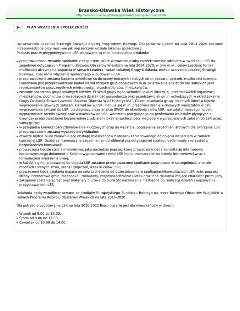 Brzesko-Oławska Wieś Historyczna http://wieshistoryczna.pl/strona/plan-wlaczenia-spolecznosci/2184 PLAN WŁĄCZENIA SPOŁECZNOŚCI Opracowania Lokalnej Strategii Rozwoju objętej Programem Rozwoju Obszarów Wiejskich na lata 2014-2020 zostanie przeprowadzone przy możliwie jak najszerszym udziale lokalnej społeczności. Podczas prac w przygotowywanie LSR planowane są m.in. następujące działania: ● ● ● ● ● ● ● ● ● przeprowadzone zostanie spotkanie z ekspertem, które wprowadzi osoby zainteresowane udziałem w tworzeniu LSR do zagadnień dotyczących Programu Rozwoju Obszarów Wiejskich na lata 2014-2020, w tym m.in.: celów Leadera, form i możliwości otrzymania wsparcia w ramach Leadera, zadań Lokalnej Grupy Działania, metod tworzenia Lokalnej Strategii Rozwoju, znaczenia włączenia społecznego w budowaniu LSR; przeprowadzone zostaną badania ankietowe co do oceny mocnych i słabych stron obszaru, potrzeb, możliwości rozwoju. Planowane jest przeprowadzenie badań wśród różnych grup docelowych m.in. skierowanie ankiet do rad sołeckich jako reprezentantów poszczególnych miejscowości, przedsiębiorców, mieszkańców; zostanie stworzona grupa lokalnych liderów. W skład grupy będą wchodzili lokalni liderzy, tj. przedstawicieli organizacji, mieszkańców, podmiotów prowadzących działalność gospodarczą oraz przedstawicieli gmin wchodzących w skład Lokalnej Grupy Działania Stowarzyszenia „Brzesko-Oławska Wieś Historyczna”. Celem powołania grupy lokalnych liderów będzie wypracowania głównych założeń, kierunków w LSR. Planuje się m.in. przeprowadzenie 2-dniowych warsztatów w celu wypracowania założeń do LSR: od diagnozy przez analizę SWOT do określania celów LSR; warsztatu mającego na celu wypracowanie przedsięwzięć oraz wskaźników do LSR; warsztatu polegającego na porównaniu wniosków płynących z diagnozy przeprowadzanej bezpośrednio z udziałem lokalnej społeczności względem wypracowanych założeń do LSR przez samą grupę; w przypadku konieczności zdefiniowania kluczowych grup do wsparcia, pogłębienia zagadnień istotnych dla tworzenia LSR przeprowadzone zostaną wywiady indywidualne; otwarte będzie biuro zapewniające obsługę mieszkańców z obszaru zaplanowanego do objęcia wsparciem w ramach tworzonej LSR. Osoby zainteresowane zagadnieniami/problematyką dotyczącymi strategii będą mogły skorzystać z bezpośrednich konsultacji; prowadzona będzie strona internetowa, jako narzędzie poprzez które prowadzone będą konsultacje internetowe opracowywanego dokumentu. Kolejne wypracowane części LSR będą umieszczane na stronie internetowej wraz z formularzem wnoszenia uwag; w każdej z gmin planowanej do objęcia LSR zostanie przeprowadzone spotkanie poświęcone w szczególności analizie mocnych i słabych stron, szans i zagrożeń, a także celów LSR; prowadzone będą działania mające na celu zachęcenie do uczestniczenia w spotkaniach/konsultacjach LSR m.in. poprzez strony internetowe gmin, facebooka, rollbanery, rozpowszechnienie ulotek oraz inne działania mające charakter promujący, zakupiony zostanie sprzęt oraz materiały biurowe do biura Stowarzyszenia niezbędne do realizacji działań związanych z przygotowaniem LSR. Działania będą współfinansowane ze środków Europejskiego Funduszu Rolnego na rzecz Rozwoju Obszarów Wiejskich w ramach Programu Rozwoju Obszarów Wiejskich na lata 2014-2020. Dla potrzeb przygotowania LSR na lata 2016-2022 Biuro otwarte jest dla mieszkańców w dniach: ● ● ● Wtorek od 9.00 do 13.00, Środa od 9.00 do 13.00, Czwartek od 10.00 do 14.00.