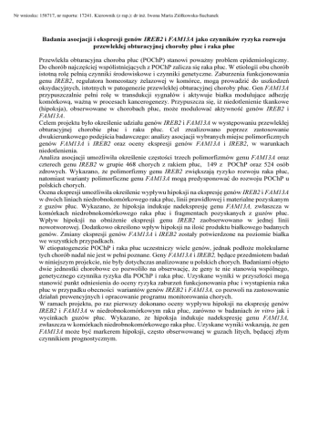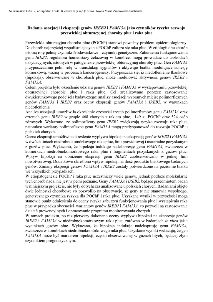 Nr wniosku: 158717, nr raportu: 17241. Kierownik (z rap.): dr inż. Iwona Maria Ziółkowska-Suchanek Badania asocjacji i ekspresji genów IREB2 i FAM13A jako czynników ryzyka rozwoju przewlekłej obturacyjnej choroby płuc i raka płuc Przewlekła obturacyjna choroba płuc (POChP) stanowi poważny problem epidemiologiczny. Do chorób najczęściej współistniejących z POChP zalicza się raka płuc. W etiologii obu chorób istotną rolę pełnią czynniki środowiskowe i czynniki genetyczne. Zaburzenia funkcjonowania genu IREB2, regulatora homeostazy żelazowej w komórce, mogą prowadzić do uszkodzeń oksydacyjnych, istotnych w patogenezie przewlekłej obturacyjnej choroby płuc. Gen FAM13A przypuszczalnie pełni rolę w transdukcji sygnałów i aktywuje białka modulujące adhezję komórkową, ważną w procesach kancerogenezy. Przypuszcza się, iż niedotlenienie tkankowe (hipoksja), obserwowane w chorobach płuc, może modulować aktywność genów IREB2 i FAM13A. Celem projektu było określenie udziału genów IREB2 i FAM13A w występowaniu przewlekłej obturacyjnej chorobie płuc i raku płuc. Cel zrealizowano poprzez zastosowanie dwukierunkowego podejścia badawczego: analizy asocjacji wybranych miejsc polimorficznych genów FAM13A i IREB2 oraz oceny ekspresji genów FAM13A i IREB2, w warunkach niedotlenienia. Analiza asocjacji umożliwiła określenie częstości trzech polimorfizmów genu FAM13A oraz czterech genu IREB2 w grupie 468 chorych z rakiem płuc, 149 z POChP oraz 524 osób zdrowych. Wykazano, że polimorfizmy genu IREB2 zwiększają ryzyko rozwoju raka płuc, natomiast warianty polimorficzne genu FAM13A mogą predysponować do rozwoju POChP u polskich chorych. Ocena ekspresji umożliwiła określenie wypływu hipoksji na ekspresję genów IREB2 i FAM13A w dwóch liniach niedrobnokomórkowego raka płuc, linii prawidłowej i materialne pozyskanym z guzów płuc. Wykazano, że hipoksja indukuje nadekspresję genu FAM13A, zwłaszcza w komórkach niedrobnokomórkowego raka płuc i fragmentach pozyskanych z guzów płuc. Wpływ hipoksji na obniżenie ekspresji genu IREB2 zaobserwowano w jednej linii nowotworowej. Dodatkowo określono wpływ hipoksji na ilość produktu białkowego badanych genów. Zmiany ekspresji genów FAM13A i IREB2 zostały potwierdzone na poziomie białka we wszystkich przypadkach. W etiopatogenezie POChP i raka płuc uczestniczy wiele genów, jednak podłoże molekularne tych chorób nadal nie jest w pełni poznane. Geny FAM13A i IREB2, będące przedmiotem badań w niniejszym projekcie, nie były dotychczas analizowane u polskich chorych. Badaniami objęto dwie jednostki chorobowe co pozwoliło na obserwację, że geny te nie stanowią wspólnego, genetycznego czynnika ryzyka dla POChP i raka płuc. Uzyskane wyniki w przyszłości mogą stanowić punkt odniesienia do oceny ryzyka zaburzeń funkcjonowania płuc i wystąpienia raka płuc w przypadku obecności wariantów genów IREB2 i FAM13A, co pozwoli na zastosowanie działań prewencyjnych i opracowanie programu monitorowania chorych. W ramach projektu, po raz pierwszy dokonano oceny wypływu hipoksji na ekspresję genów IREB2 i FAM13A w niedrobnokomórkowym raku płuc, zarówno w badaniach in vitro jak i wycinkach guzów płuc. Wykazano, że hipoksja indukuje nadekspresję genu FAM13A, zwłaszcza w komórkach niedrobnokomórkowego raka płuc. Uzyskane wyniki wskazują, że gen FAM13A może być markerem hipoksji, często obserwowanej w guzach litych, będącej złym czynnikiem prognostycznym.