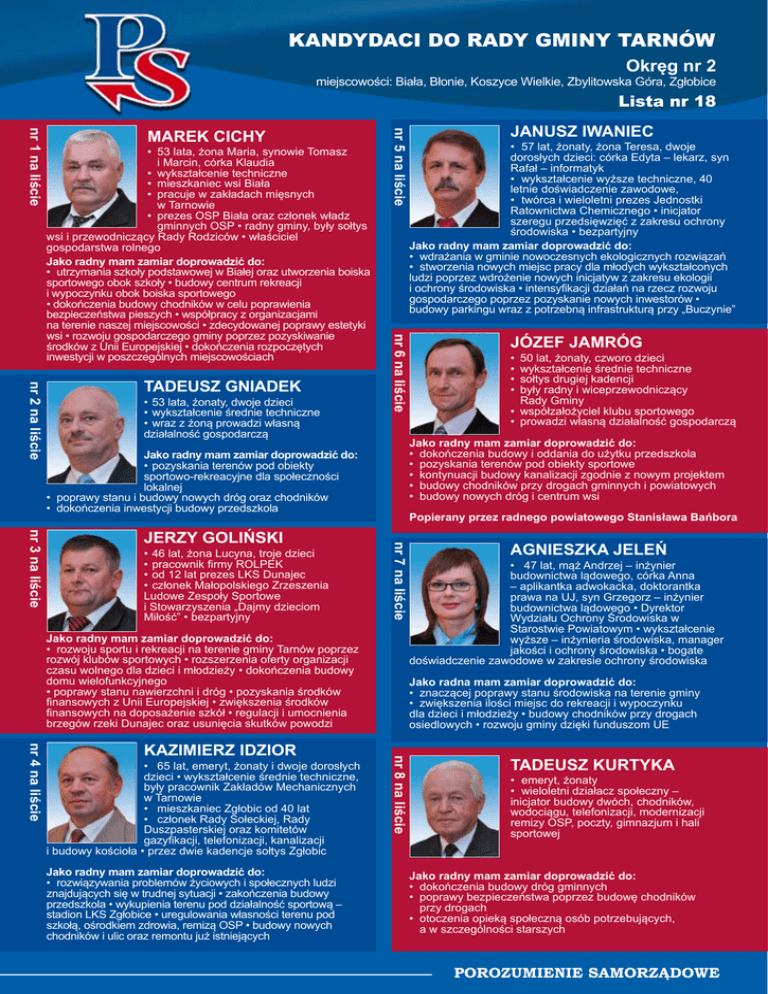 www.grzegorzkoziol.eu KANDYDACI DO RADY GMINY TARNÓW Okręg nr 2 miejscowości: Biała, Błonie, Koszyce Wielkie, Zbylitowska Góra, Zgłobice Lista nr 18 nr 2 na liście Tadeusz Gniadek •53 lata, żonaty, dwoje dzieci •wykształcenie średnie techniczne •wraz z żoną prowadzi własną działalność gospodarczą nr 6 na liście • 53 lata, żona Maria, synowie Tomasz i Marcin, córka Klaudia • wykształcenie techniczne • mieszkaniec wsi Biała • pracuje w zakładach mięsnych w Tarnowie • prezes OSP Biała oraz członek władz gminnych OSP • radny gminy, były sołtys wsi i przewodniczący Rady Rodziców • właściciel gospodarstwa rolnego Jako radny mam zamiar doprowadzić do: • utrzymania szkoły podstawowej w Białej oraz utworzenia boiska sportowego obok szkoły • budowy centrum rekreacji i wypoczynku obok boiska sportowego • dokończenia budowy chodników w celu poprawienia bezpieczeństwa pieszych • współpracy z organizacjami na terenie naszej miejscowości • zdecydowanej poprawy estetyki wsi • rozwoju gospodarczego gminy poprzez pozyskiwanie środków z Unii Europejskiej • dokończenia rozpoczętych inwestycji w poszczególnych miejscowościach nr 5 na liście nr 1 na liście Marek Cichy Jako radny mam zamiar doprowadzić do: • rozwoju sportu i rekreacji na terenie gminy Tarnów poprzez rozwój klubów sportowych • rozszerzenia oferty organizacji czasu wolnego dla dzieci i młodzieży • dokończenia budowy domu wielofunkcyjnego • poprawy stanu nawierzchni i dróg • pozyskania środków finansowych z Unii Europejskiej • zwiększenia środków finansowych na doposażenie szkół • regulacji i umocnienia brzegów rzeki Dunajec oraz usunięcia skutków powodzi • 65 lat, emeryt, żonaty i dwoje dorosłych dzieci • wykształcenie średnie techniczne, były pracownik Zakładów Mechanicznych w Tarnowie • mieszkaniec Zgłobic od 40 lat • członek Rady Sołeckiej, Rady Duszpasterskiej oraz komitetów gazyfikacji, telefonizacji, kanalizacji i budowy kościoła • przez dwie kadencje sołtys Zgłobic Jako radny mam zamiar doprowadzić do: • rozwiązywania problemów życiowych i społecznych ludzi znajdujących się w trudnej sytuacji • zakończenia budowy przedszkola • wykupienia terenu pod działalność sportową – stadion LKS Zgłobice • uregulowania własności terenu pod szkołą, ośrodkiem zdrowia, remizą OSP • budowy nowych chodników i ulic oraz remontu już istniejących 3 • 50 lat, żonaty, czworo dzieci • wykształcenie średnie techniczne • sołtys drugiej kadencji • były radny i wiceprzewodniczący Rady Gminy • współzałożyciel klubu sportowego • prowadzi własną działalność gospodarczą Agnieszka Jeleń • 47 lat, mąż Andrzej – inżynier budownictwa lądowego, córka Anna – aplikantka adwokacka, doktorantka prawa na UJ, syn Grzegorz – inżynier budownictwa lądowego • Dyrektor Wydziału Ochrony Środowiska w Starostwie Powiatowym • wykształcenie wyższe – inżynieria środowiska, manager jakości i ochrony środowiska • bogate doświadczenie zawodowe w zakresie ochrony środowiska Jako radna mam zamiar doprowadzić do: • znaczącej poprawy stanu środowiska na terenie gminy • zwiększenia ilości miejsc do rekreacji i wypoczynku dla dzieci i młodzieży • budowy chodników przy drogach osiedlowych • rozwoju gminy dzięki funduszom UE nr 8 na liście nr 4 na liście Kazimierz Idzior Józef Jamróg Popierany przez radnego powiatowego Stanisława Bańbora nr 7 na liście nr 3 na liście •46 lat, żona Lucyna, troje dzieci •pracownik firmy ROLPEK •od 12 lat prezes LKS Dunajec •członek Małopolskiego Zrzeszenia Ludowe Zespoły Sportowe i Stowarzyszenia „Dajmy dzieciom Miłość” • bezpartyjny • 57 lat, żonaty, żona Teresa, dwoje dorosłych dzieci: córka Edyta – lekarz, syn Rafał – informatyk • wykształcenie wyższe techniczne, 40 letnie doświadczenie zawodowe, • twórca i wieloletni prezes Jednostki Ratownictwa Chemicznego • inicjator szeregu przedsięwzięć z zakresu ochrony środowiska • bezpartyjny Jako radny mam zamiar doprowadzić do: • wdrażania w gminie nowoczesnych ekologicznych rozwiązań • stworzenia nowych miejsc pracy dla młodych wykształconych ludzi poprzez wdrożenie nowych inicjatyw z zakresu ekologii i ochrony środowiska • intensyfikacji działań na rzecz rozwoju gospodarczego poprzez pozyskanie nowych inwestorów • budowy parkingu wraz z potrzebną infrastrukturą przy „Buczynie” Jako radny mam zamiar doprowadzić do: • dokończenia budowy i oddania do użytku przedszkola • pozyskania terenów pod obiekty sportowe • kontynuacji budowy kanalizacji zgodnie z nowym projektem • budowy chodników przy drogach gminnych i powiatowych • budowy nowych dróg i centrum wsi Jako radny mam zamiar doprowadzić do: •pozyskania terenów pod obiekty sportowo-rekreacyjne dla społeczności lokalnej • poprawy stanu i budowy nowych dróg oraz chodników • dokończenia inwestycji budowy przedszkola Jerzy Goliński Janusz Iwaniec Tadeusz Kurtyka • emeryt, żonaty • wieloletni działacz społeczny – inicjator budowy dwóch, chodników, wodociągu, telefonizacji, modernizacji remizy OSP, poczty, gimnazjum i hali sportowej Jako radny mam zamiar doprowadzić do: • dokończenia budowy dróg gminnych • poprawy bezpieczeństwa poprzez budowę chodników przy drogach • otoczenia opieką społeczną osób potrzebujących, a w szczególności starszych POROZUMIENIE SAMORZĄDOWE www.grzegorzkoziol.eu KANDYDACI DO RADY GMINY TARNÓW Okręg nr 2 miejscowości: Biała, Błonie, Koszyce Wielkie, Zbylitowska Góra, Zgłobice Lista nr 18 • 29 lat, żonaty, dwoje dzieci • wykształcenie wyższe, nauczyciel wychowania fizycznego • członek zarządu OSP w Zgłobicach,współzałożyciel i prezes UKS „Spartakus” • zasłużony krwiodawca, ratownik WOPR Jako radny mam zamiar doprowadzić do: • do