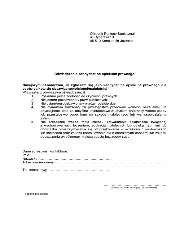 Ośrodek Pomocy Społecznej ul. Rycerska 13 05-510 Konstancin-Jeziorna Oświadczenie kandydata na opiekuna prawnego Niniejszym oświadczam, że zgłaszam się jako kandydat na opiekuna prawnego dla osoby całkowicie ubezwłasnowolnionej/małoletniej* W związku z powyższym oświadczam, iż: 1) Posiadam pełną zdolność do czynności prawnych. 2) Nie jestem pozbawiona/y praw publicznych. 3) Nie byłam/em pozbawiona/y władzy rodzicielskiej. 4) Nie byłam/em skazana/y za przestępstwo przeciwko wolności seksualnej lub obyczajności albo za umyślne przestępstwo z użyciem przemocy wobec osoby lub przestępstwo popełnione na szkodę małoletniego lub we współdziałaniu z nim. 5) Nie orzeczono wobec mnie zakazu prowadzenia działalności związanej z wychowywaniem, leczeniem, edukacją małoletnich lub opieką nad nimi lub obowiązku powstrzymywania się od przebywania w określonych środowiskach lub miejscach oraz zakazu kontaktowania się z określonymi osobami lub zakazu opuszczania określonego miejsca pobytu bez zgody sądu. Dane adresowe i kontaktowe: Imię ………………………………………………………………. Nazwisko ………………………………….…………………….. Adres zamieszkania: …………………………………………………………………………………. …………………………………………………………………………………………………………… Tel. kontaktowy: ………………………………………………… …………………….…………………………. (podpis osoby składającej oświadczenie) * odpowiednie skreślić