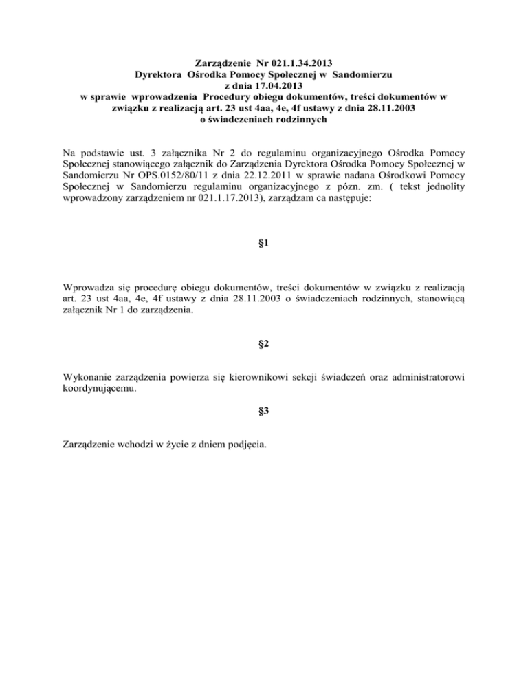 Zarządzenie Nr 021.1.34.2013 Dyrektora Ośrodka Pomocy