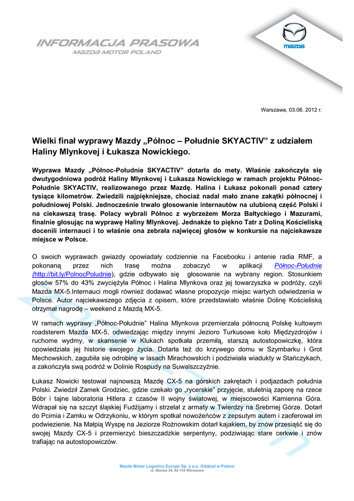 Warszawa, 03.08. 2012 r. Wielki fina wyprawy Mazdy „Pó noc – Po udnie SKYACTIV” z udzia em Haliny Mlynkovej i 6ukasza Nowickiego. Wyprawa Mazdy „Pó noc-Po udnie SKYACTIV” dotar a do mety. W a8nie zako9czy a si: dwutygodniowa podró Haliny Mlynkovej i 6ukasza Nowickiego w ramach projektu Pó nocPo udnie SKYACTIV, realizowanego przez Mazd:. Halina i 6ukasz pokonali ponad cztery tysi<ce kilometrów. Zwiedzili najpi:kniejsze, chocia nadal ma o znane zak<tki pó nocnej i po udniowej Polski. Jednocze8nie trwa o g osowanie internautów na ulubion< cz:8@ Polski i na ciekawsz< tras:. Polacy wybrali Pó noc z wybrze em Morza Ba tyckiego i Mazurami, finalnie g osuj<c na wypraw: Haliny Mlynkovej. Jednak e to pi:kno Tatr z Dolin< Ko8cielisk< docenili internauci i to w a8nie ona zebra a najwi:cej g osów w konkursie na najciekawsze miejsce w Polsce. O swoich wyprawach gwiazdy opowiada y codziennie na Facebooku i antenie radia RMF, a pokonan" przez nich tras# mo%na zobaczy& w aplikacji Pó noc-Po udnie (http://bit.ly/PolnocPoludnie), gdzie odbywa o si# g osowanie na wybrany region. Stosunkiem g osów 57% do 43% zwyci#%y a Pó noc i Halina Mlynkova oraz jej towarzyszka w podró%y, czyli Mazda MX-5.Internauci mogli równie% dodawa& w asne propozycje miejsc wartych odwiedzenia w Polsce. Autor najciekawszego zdj#cia z opisem, które przedstawia o w a9nie Dolin# Ko9cielisk" otrzyma nagrod# – weekend z Mazd" MX-5. W ramach wyprawy „Pó noc-Po udnie” Halina Mlynkova przemierza a pó nocn" Polsk# kultowym roadsterem Mazda MX-5, odwiedzaj"c mi#dzy innymi Jezioro Turkusowe ko o Mi#dzyzdrojów i ruchome wydmy, w skansenie w Klukach spotka a przemi ", starsz" autostopowiczk#, która opowiedzia a jej historie swojego %ycia. Dotar a te% do krzywego domu w Szymbarku i Grot Mechowskich, zagubi a si# odrobin# w lasach Mirachowskich i podziwia a wiadukty w StaBczykach, a zakoBczy a sw" podró% w Dolinie Rospudy na SuwalszczyCnie. Dukasz Nowicki testowa najnowsz" Mazd# CX-5 na górskich zakr#tach i podjazdach po udnia Polski. Zwiedzi Zamek Grodziec, gdzie czeka o go „rycerskie” przyj#cie, stuletni" zapor# na rzece Bóbr i tajne laboratoria Hitlera z czasów II wojny 9wiatowej, w miejscowo9ci Kamienna Góra. Wdrapa si# na szczyt 9l"skiej Fud%ijamy i strzela z armaty w Twierdzy na Srebrnej Górze. Dotar do Pcimia i Zamku w Odrzykoniu, w którym spotka nowo%eBców z zepsutym autem i zaoferowa im podwiezienie. Na Ma pi" Wysp# na Jeziorze Ro%nowskim dotar kajakiem, by znów przesi"9& si# do swojej Mazdy CX-5 i przemierzy& bieszczadzkie serpentyny, podziwiaj"c stare cerkwie i znów trafiaj"c na autostopowiczów. Mazda Motor Logistics Europe Sp. z o.o. Oddzia w Polsce ul. I ecka 24, 02-135 Warszawa A tak opowiadaj" o swoich przygodach Halina i Dukasz: „To by a fantastyczna podró%, emocjonuj"ca jazda Mazd" MX-5, a% si# nie chcia o koBczy& i wraca& do rzeczywisto9ci. Spotka am po drodze tylu przyjaznych ludzi, wys ucha am czasem historii ich %ycia, odwiedzi am tak pi#kne miejsca, %e b#d# t# wypraw# wspomina& z u9miechem jeszcze d ugo” powiedzia a Halina Mlynkova. Dukasz z kolei docenia uroki prawdziwie m#skiej wyprawy w góry, podczas której odkry zalety Mazdy CX-5: „Po udnie Polski to pi#kne tereny, ale bardzo wymagaj"ce drogi, zarówno dla kierowcy, jak i samochodu. Mazda 9wietnie sobie radzi a na stromych podjazdach, szutrowych terenach, a nawet w szczerym polu. Z u9miechem wspominam szczególnie przystanek w Pcimiu, gdzie okaza o si#, %e nie mam gdzie przenocowa& i zdecydowa em si# na nocleg w baga%niku – po z o%eniu jednym ruchem opar& foteli dysponowa em tak wielk" przestrzeni", %e spokojnie zmie9ci aby si# tu ca a rodzina”. Wyniki g osowania w obu konkursach potwierdzaj", %e zarówno pó nocna, jak i po udniowa Polska maj" swoje powody do dumy, a liczba pi#knych i nieodkrytych jeszcze miejsc na mapie zach#ca do tego, by odkrywa& je samodzielnie podczas samochodowych wypraw. ### Kontakt: Magdalena W#glewska Tel. +48 606 600 260 e-mail: [email protected], strona prasowa: www.mazda-press.pl Mazda Motor Logistics Europe Sp. z o.o. Oddzia w Polsce ul. I ecka 24, 02-135 Warszawa