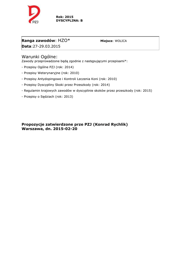 Rok: 2015 DYSCYPLINA: B Ranga zawodów: HZO* Miejsce: WOLICA Data:27-29.03.2015 Warunki Ogólne: Zawody przeprowadzone będą zgodnie z następującymi przepisami*: - Przepisy Ogólne PZJ (rok: 2014) - Przepisy Weterynaryjne (rok: 2010) - Przepisy Antydopingowe i Kontroli Leczenia Koni (rok: 2010) - Przepisy Dyscypliny Skoki przez Przeszkody (rok: 2014) - Regulamin krajowych zawodów w dyscyplinie skoków przez przeszkody (rok: 2015) - Przepisy o Sędziach (rok: 2013) Propozycje zatwierdzone prze PZJ (Konrad Rychlik) Warszawa, dn. 2015-02-20 Rok: 2015 DYSCYPLINA: B I. INFORMACJE OGÓLNE 1. Zawody: 1.1 Zawody Ogólnopolskie: Ranga zawodów: 1* 2* 3* x ZO-B CSN ZODiM-B N Zawody halowe: T Kategoria: Seniorzy Młodzi Jeźdźcy Kuce i Małe Konie 1.2 Mistrzostwa Polski: Kategoria: Seniorzy Kuce T Młodzi Jeźdźcy 1.3 Puchar Polski: T N Halowy T N Kategoria: Seniorzy Młodzi Jeźdźcy Kuce i Małe Konie Kuce Juniorzy Juniorzy Młodsi N Juniorzy Juniorzy Młodsi Juniorzy Juniorzy Młodsi Data : 27-29.03.2015 Miejsce: Wolica Uczestnicy: 2. Organizator (kompletny adres) Nazwa: Klub Jeździecki Wolica Adres: Wolica 1 g Kod pocztowy: 62-872 Godziesze Telefon: 62-76-12-564 Email : [email protected] Internet: Fax : 62-76-12-564 Rok: 2015 DYSCYPLINA: B 3. Komitet Organizacyjny Przewodniczący: Andrzej Kuświk Dyrektor Zawodów: Biuro Zawodów: Szef Stajni: Krystyna Kuświk Jerzy Skowronski 4. Dane kontaktowe na miejscu zawodów: Adres: Wolica 1 g ,62-872 Godziesze Tel.: 62-76-12-564 Telefon kom.: 605552137 II. OSOBY OFICJALNE (zgodnie z Przepisami o Sędziach wyd. 6.5) 1. Komisja Sędziowska: Przewodniczący: Tadeusz Szymoniak Sędzia PZJ: Andrzej Dąbrowski Członkowie: Józef Śląski 2. Delegat Techniczny: Asystent Delegata Technicznego 3. Gospodarz Toru: Krzysztof Kierzek Asystent Gospodarza Toru : Wiesław Laskowski 4. Szef Komisarzy: Roman Talaszka 5. Komisarz: Weronika Filipiak 6. Delegat weterynaryjny PZJ: 7. Lekarz weterynarii zawodów: Michał Stanisławiak 8. Komisja Odwoławcza: III WARUNKI TECHNICZNE Otwarcie stajni data 26.03.2015 godzina 12.00 Zebranie techniczne Przegląd Weterynaryjny Plac konkursowy/hala: podłoże: kwarcowe z włókniną wymiary:21x 70 Rozprężalnia: podłoże: piasek wymiary:20x40 Producent łyżek bezpieczeństwa (PZJ - Przepisy Dyscypliny B – Art 210): GALA inż. Włodzimierz Uchwat Rok: 2015 DYSCYPLINA: B IV. WARUNKI UCZESTNICTWA 1.Uczestnictwo Zgodnie Przepisami Ogólnymi PZJ wyd. 5.1 oraz Regulaminem Dyscypliny Skoków wyd.10.9 2. Zgłoszenia: Termin zgłoszeń wstępnych:..13.03.2015 Termin zgłoszeń ostatecznych:20.03.2015 Zgłoszenia prosimy wysyłać na adres: Wolica 1 g ,62-872 Godziesze Fax :62-76-12-564 Email: [email protected] Zgłoszenia ważne tylko z dołaczonym dowodem wpłaty na konto (150 zł od konia zaliczkowo) Konto KJ Wolica KB Kalisz 29 2030 0045 11100000 0133 4400 Zgłoszenia wyłącznie na drukach PZJ (w załączeniu) 3. Warunki finansowe: Boksy o wymiarach 9 m2 - opłata za boks:300 zł Wpisowe (zgodnie z Regulaminem Rozgrywania Zawodów w Skokach Art.8, pkt.5) 160 zł - dla koni startujących w MRi ŚR 200 zł - dla koni startujących w DR Opłata za program badań antydopingowych 15 zł od konia Pasza i siano własne: T N / na koszt KO: T Nx Podłączenie samochodu do prądu:200 z ł Istnieje możliwość zakupu siana i słomy -10 zł balot 4. Zakwaterowanie i wyżywienie: na koszt własny: T N na koszt KO: T N Pokoje nad domem: - pokój z łazienką: 50 zł/osobę/dobę - pokój bez łazienki (łazienka na korytarzu): 40 zł/osobę/dobę Pokoje przy hali: - pokój 1 osobowy z łazienką: 120 zł/dobę - pokój 2 osobowy z łazienką: 170 zł/dobę - pokój 3 osobowy z łazienką: 230 zł/dobę Pokoje o standardzie hotelowym: - pokój 1 osobowy: 160 zł/dobę - pokój 2 osobowy: 200 zł/dobę Rok: 2015 DYSCYPLINA: B 5. Kary za brak dokumentów – według stawek PZJ. 6. Za reklamacje i odwołania obowiązuje kaucja w wys.:300 PLN 7. Dokonanie zmiany w zapisach do konkursu (po wywieszeniu list startowych) za zgodą sędziego głównego: 40 PLN 8. Wymagana dokumentacja dla koni aktualne badania i szczepienia ochronne 9. Organizator nie ponosi odpowiedzialności za kradzieże, wypadki oraz inne szkody mogące mieć miejsce podczas zawodów i transportu V. ZAGADNIENIA WETERYNARYJNE Lp. Funkcja 1. Powiatowy lekarz wet. 2. Delegat wet. PZJ 3. Lekarz wet. zawodów Imię i nazwisko telefon Joanna Kokot-Ciszewska 62.7572659 Michał Stanisławiak 602231314 Szczepienia ochronne przeciwko grypie koni. Obowiązuje następujący schemat szczepień: a. szczepienie podstawowe: pierwsze szczepienie – w dniu rozpoczęcia szczepień drugie szczepienie – nie wcześniej niż 21-go dnia i nie później niż 92 dnia od pierwszego szczepienia. b. szczepienie przypominające: co 6 miesięcy od ostatniego szczepienia (jest dopuszczalny 21 dniowy okres karencji); żadne szczepienie przypominające nie może się odbyć później niż na 7 dni przed przybyciem na zawody. VI. NAGRODY (zgodnie z Regulaminem Rozgrywania Zawodów Krajowych w dyscyplinie skoków przez przeszkody Art.5) PULA NAGRÓD Konkurs Konkurs Konkurs Konkurs Konkurs Konkurs Konkurs Konkurs Konkurs nr nr nr nr nr nr nr nr nr 1: 2: 3: 4: 5: 6: 7: 8: 9: 1000 PLN 1500 PLN 2000 PLN 1000 PLN 1500 PLN 2500PLN 1000PLN 3500PLN 6000PLN Rok: 2015 DYSCYPLINA: B Razem: 20000.00 PLN Rok: 2015 DYSCYPLINA: B VII. PROGRAM ZAWODÓW Dzień I Dzień:piątek Data:27.03.15 KONKURS Nr. 1, (przewidywana godz. rozpoczęcia: 13.00) Runda:MR Konkurs :N(120) ZWYKŁY Art.:238.2.1 Pula nagród:1000PLN Podział puli nagród I-250 PLN ,II -200 PLN ,III-150 PLN ,IV-100 PLN ,V -80 PLN ,VI- 60 PLN ,VII - 50 PLN ,VIII-40 PLN : DO 25 % -70 PLN KONKURS Nr. 2, Runda:ŚR Konkurs : C (130 CM ) ZWYKŁY Art.:238.2.1 Pula nagród: 1500PLN Podział puli nagród: I- 450 PLN ,II- 300 PLN ,III-225 PLN ,IV-150 PLN ,V-100 PLN ,VI-75 PLN ,VII -50 PLN ,VIII-25 PLN ,:25 % -125 PLN KONKURS Nr.3 Runda:DR Konkurs :CC(140 CM)ZWYKŁY Art.:238.2.