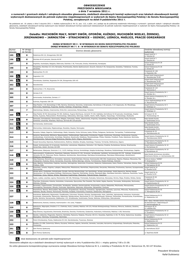 OBWIESZCZENIE PREZYDENTA WROCŁAWIA z dnia 7 września 2011 r. o numerach i granicach stałych i odrębnych obwodów głosowania, siedzibach obwodowych komisji wyborczych oraz lokalach obwodowych komisji wyborczych dostosowanych do potrzeb wyborców niepełnosprawnych w wyborach do Sejmu Rzeczypospolitej Polskiej i do Senatu Rzeczypospolitej Polskiej, zarządzonych na dzień 9 października 2011 r. Na podstawie art. 16 ustawy z dnia 5 stycznia 2011 r. Kodeks wyborczy(Dz.U. Nr 21, poz. 112, z późn. zm.) podaje się do publicznej wiadomości informację o numerach i granicach stałych i odrębnych obwodów głosowania, siedzibach obwodowych komisji wyborczych oraz lokalach obwodowych komisji wyborczych dostosowanych do potrzeb wyborców niepełnosprawnych w wyborach do Sejmu Rzeczypospolitej Polskiej i do Senatu Rzeczypospolitej Polskiej Osiedla: MUCHOBÓR MAŁY, NOWY DWÓR, OPORÓW, KUŹNIKI, MUCHOBÓR WIELKI, ŻERNIKI, JERZMANOWO – JARNOŁTÓW – STRACHOWICE – OSINIEC, LEŚNICA, MAŚLICE, PRACZE ODRZAŃSKIE OKRĘG WYBORCZY NR 3 - W WYBORACH DO SEJMU RZECZYPOSPOLITEJ POLSKIEJ OKRĘG WYBORCZY NR 7 i 8 - W WYBORACH DO SENATU RZECZYPOSPOLITEJ POLSKIEJ Numer obwodu Nr okręgu do Senatu Granice obwodu głosowania Siedziba obwodowej komisji wyborczej 195 8 Robotnicza 98-112, Strzegomska 196-320 Zespół Szkół Nr 3 ul. Szkocka 64 196 8 Estońska 40-42 parzyste, Szkocka 46-99 Zespół Szkół Nr 3 ul. Szkocka 64 197 8 Angielska, Australijska, Belgijska, Białoruska, Estońska 1-36, Francuska, Grecka, Holenderska, Kanadyjska Szkoła Podstawowa Nr 28 ul. Grecka 59 198 8 Hiszpańska, Klecińska 111-214, Norweska, Przemkowska, Stanów Zjednoczonych, Szczyrki, Szkocka 4-35, Szwajcarska, Szwedzka, Traktatowa, Turecka, Ukraińska Szkoła Podstawowa Nr 28 ul. Grecka 59 199 8 Budziszyńska 76-135 Przedszkole Nr 148 ul. Rogowska 18a 200 8 Rogowska 2-52 Zespół Szkół Integracyjnych ul. Nowodworska 70-82 201 8 Chociebuska, Gubińska, Rogowska 54-104, Strzegomska 109-143 Zespół Szkół Integracyjnych ul. Nowodworska 70-82 202 8 Nowodworska Zespół Szkół Integracyjnych ul. Nowodworska 70-82 203 8 Budziszyńska 1-74, Wojrowicka Przedszkole Nr 123 ul. Wojrowicka 3 204 8 Zemska 9-44 Zespół Szkolno-Przedszkolny Nr 1 ul. Zemska 16 c 205 8 Komorowska, Krośnieńska, Zemska 1-7 Zespół Szkolno-Przedszkolny Nr 1 ul. Zemska 16 c 206 8 Kuźnicka, Rogowska 106-176 Liceum Ogólnokształcące Nr XV ul. Wojrowicka 58 207 7 Aleja Piastów 1-29, Bukowskiego 2-49A, Darwina, Dzierżonia, Harcerska, Jordanowska, Karmelkowa 2-50 parzyste, 5-23 nieparzyste, 29, Mikulskiego, Mokronoska, Pękalskiego, Rosponda, Skarbka, Solskiego, Śniegockiego, Wiejska Zespół Szkolno-Przedszkolny Nr 9 ul. Solskiego 13 208 7 Adamieckiego, Balzaka, Cesarzowicka, Emila Zoli, Leszczynowa, Petrażyckiego, Tyniecka Zespół Szkolno-Przedszkolny Nr 9 ul. Solskiego 13 209 7 Aleja Piastów 30-99, Bukowskiego 50-180, Giełdowa, Hugona Steinhausa, Jutrzenki 74-102, Kadłubka, Karmelkowa 52-64 parzyste, Kowalskiego, Księdza Feichta, Kupiecka, Maleczyńskich, Morelowskiego, Nałkowskiej, Ostroroga, Sobótki, Stanki, Stefki, Ślązaka, Taszyckiego, Trentowskiego, Wysłoucha Gimnazjum Nr 40 ul. Morelowskiego 43 210 8 Darłowska, Domasławska, Dziwnowska, Elbląska, Gołnowska, Helska, Jaksonowicka, Knignicka, Koszalińska, Międzyzdrojska, Morska, Pucka, Pyrzycka, Sukielicka, Uznamska, Wołyńska, Woźnicza, Żernicka 86-130 parzyste Rada Osiedla Kuźniki ul. Sarbinowska 19-21 211 8 Hermanowska, Sarbinowska Rada Osiedla Kuźniki ul. Sarbinowska 19-21 212 8 Dźwirzyńska, Kołobrzeska, Majakowskiego, Rewalska, Słupska, Świnoujska Rada Osiedla Kuźniki ul. Sarbinowska 19-21 213 8 Buczacka, Cabaja, Gagarina, Godlewskiego, Hłaski, Karpacka, Knota, Końcowa, Łaska, Mińska, Postępowa, Samborska, Tarnopolska, Trzebiatowskiego Przedszkole Nr 22 ul. Stanisławowska 90 214 8 Awicenny, Baranowicka, Bliźniacza, Boguszewskiej, Cieślikowskiego, Dąbrowskiej, Drohobycka, Dygata, Dzielnicowa, Giżyckiego, Gombrowicza, Husycka, Kosidowskiego, Krzemieniecka, Kunickiego, Meissnera, Nowohucka, Osiedlowa, Parandowskiego, Pińska, Podolska, Przedświt, Pusta, Rakietowa, Słonimska, Stanisławowska, Tadeusza Dołęgi-Mostowicza, Zbarska, Żwirki i Wigury, Żytomierska Zespół Szkolno-Przedszkolny Nr 15 ul. Stanisławowska 38/44 215 8 Kossak-Szczuckiej, Rejonowa, Rodziewiczówny, Roślinna, Sokalska, Stryjska, Szarskiego, Trawowa, Tyrmanda, Wańkowicza, Zagony Zespół Szkolno-Przedszkolny Nr 15 ul. Stanisławowska 38/44 216 8 Dojazd, Jerzmanowska 10-14 parzyste, Kiemliczów, Lubczykowa, Objazdowa, Osiniecka 1-22, Pieprzna, Przednia, Rumiankowa, Ryżowa, Strachowicka, Szczecińska, Udzieli, Żernicka 152-299 Zespół Szkolno-Przedszkolny Nr 10 ul. Rumiankowa 34 217 8 Berberysowa, Gdacjusza, Graniczna 1-11, 11/23, Ketlinga, Kmicica, Komeńskiego, Księdza Kordeckiego, Rezedowa, Roździeńskiego, Skrzetuskiego, Zagłoby Zespół Szkolno-Przedszkolny Nr 10 ul. Rumiankowa 34 218 8 Adamczewskich, Chodkiewicza, Desantowa, Gałowska, Graniczna 21-161, Gruszowa, Jarnołtowska, Jasińskiej, Jerzmanowska 50-135, Kośnego, Krzeptowska, Osiniecka 48-124, Piołunowa, Płużna, Rdestowa, Samotworska, Skarżyńskiego, Stanisława Koniecpolskiego, Stanisława Żółkiewskiego, Wardzyńskich, Widłakowa, Zarembowicza Rada Osiedla Jerzmanowo-JarnołtówStrachowice-Osiniec, ul. Jerzmanowska 102 219 8 Aleja Platanowa, Ekonomiczna, Gromadzka, Jajczarska, Józefa Gielniaka, Klonowa, Kosmonautów 206-328, Krajobrazowa, Majchra, Miodowa, Mleczarska, Plac Świętojański, Pustecka, Równa, Serowarska, Snycerska, Stefana Batorego, Szkolna, Trzmielowicka, Wojska Polskiego, Wyboista Centrum Kultury "ZAMEK" Pl. Świętojański 1 220 8 Biała, Błękitna, Ciechocińska, Cieplicka, Iwonicka, Jeleniogórska, Jesiennicka, Kruszcowa, Skałeczna, Sobieszowska, Szara, Śnieżna, Tatrzańska, Zielona, Złota, Źródlana, Żółta Szkoła Podstawowa Nr 95 ul. Starogajowa 66-68 221 8 Brzezińs