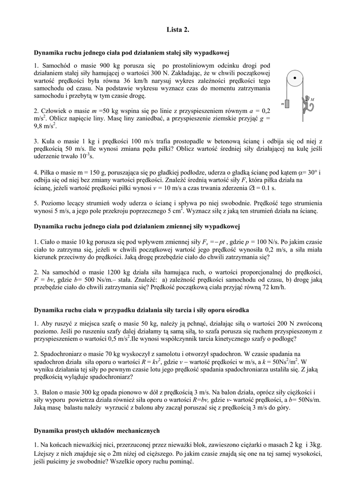 Lista 2. Dynamika ruchu jednego ciała pod działaniem stałej siły wypadkowej 1. Samochód o masie 900 kg porusza się po prostoliniowym odcinku drogi pod działaniem stałej siły hamującej o wartości 300 N. Zakładając, że w chwili początkowej wartość prędkości była równa 36 km/h narysuj wykres zależności prędkości tego samochodu od czasu. Na podstawie wykresu wyznacz czas do momentu zatrzymania samochodu i przebytą w tym czasie drogę. M m 2. Człowiek o masie m =50 kg wspina się po linie z przyspieszeniem równym a = 0,2 m/s2. Oblicz napięcie liny. Masę liny zaniedbać, a przyspieszenie ziemskie przyjąć g = 9,8 m/s2. 3. Kula o masie 1 kg i prędkości 100 m/s trafia prostopadle w betonową ścianę i odbija się od niej z prędkością 50 m/s. Ile wynosi zmiana pędu piłki? Oblicz wartość średniej siły działającej na kulę jeśli uderzenie trwało 10-3s. 4. Piłka o masie m = 150 g, poruszająca się po gładkiej podłodze, uderza o gładką ścianę pod kątem α= 30° i odbija się od niej bez zmiany wartości prędkości. Znaleźć średnią wartość siły F, która piłka działa na ścianę, jeżeli wartość prędkości piłki wynosi v = 10 m/s a czas trwania zderzenia ∆t = 0.1 s. 5. Poziomo lecący strumień wody uderza o ścianę i spływa po niej swobodnie. Prędkość tego strumienia wynosi 5 m/s, a jego pole przekroju poprzecznego 5 cm2. Wyznacz siłę z jaką ten strumień działa na ścianę. Dynamika ruchu jednego ciała pod działaniem zmiennej siły wypadkowej 1. Ciało o masie 10 kg porusza się pod wpływem zmiennej siły Fx =− pt , gdzie p = 100 N/s. Po jakim czasie ciało to zatrzyma się, jeżeli w chwili początkowej wartość jego prędkość wynosiła 0,2 m/s, a siła miała kierunek przeciwny do prędkości. Jaką drogę przebędzie ciało do chwili zatrzymania się? 2. Na samochód o masie 1200 kg działa siła hamująca ruch, o wartości proporcjonalnej do prędkości, F = bv, gdzie b= 500 Ns/m.– stała. Znaleźć: a) zależność prędkości samochodu od czasu, b) drogę jaką przebędzie ciało do chwili zatrzymania się? Prędkość początkową ciała przyjąć równą 72 km/h. Dynamika ruchu ciała w przypadku działania siły tarcia i siły oporu ośrodka 1. Aby ruszyć z miejsca szafę o masie 50 kg, należy ją pchnąć, działając siłą o wartości 200 N zwróconą poziomo. Jeśli po ruszeniu szafy dalej działamy tą samą siłą, to szafa porusza się ruchem przyspieszonym z przyspieszeniem o wartości 0,5 m/s2.Ile wynosi współczynnik tarcia kinetycznego szafy o podłogę? 2. Spadochroniarz o masie 70 kg wyskoczył z samolotu i otworzył spadochron. W czasie spadania na spadochron działa siła oporu o wartości R = kv2, gdzie v − wartość prędkości w m/s, a k = 50Ns2/m2. W wyniku działania tej siły po pewnym czasie lotu jego prędkość spadania spadochroniarza ustaliła się. Z jaką prędkością wyląduje spadochroniarz? 3. Balon o masie 300 kg opada pionowo w dół z prędkością 3 m/s. Na balon działa, oprócz siły ciężkości i siły wyporu powietrza działa również siła oporu o wartości R=bv, gdzie v- wartość prędkości, a b= 50Ns/m. Jaką masę balastu należy wyrzucić z balonu aby zaczął poruszać się z prędkością 3 m/s do góry. Dynamika prostych układów mechanicznych 1. Na końcach nieważkiej nici, przerzuconej przez nieważki blok, zawieszono ciężarki o masach 2 kg i 3kg. Lżejszy z nich znajduje się o 2m niżej od cięższego. Po jakim czasie znajdą się one na tej samej wysokości, jeśli puścimy je swobodnie? Wszelkie opory ruchu pominąć. 2. Na linie przerzuconej przez blok nieruchomy i przyczepionej do ciężarka o masie m (rysunek) znajduje się małpa o masie M. Z jakim przyspieszeniem a będzie poruszać się ciężarek w następujących przypadkach: a) małpa wspina się po linie ze stałą prędkością v0 względem liny, b) małpa wspina się po linie ze stałym przyspieszeniem a0 względem liny. Przyjąć, że masy M i m poruszają się bez tarcia. 3. Na poziomej desce o masie 1,5 kg leży cegła o masie 2 kg natomiast deska spoczywa na lodzie. Współczynnik tarcia statycznego między cegłą a deską wynosi 0,5, natomiast między deską a lodem siła tarcia jest praktycznie równa zeru. Siłę o jakiej maksymalnej wartości można przyłożyć do deski aby cegła pozostała w spoczynku względem niej (nie zaczęła się przesuwać)? 4. Na powierzchni, nachylonej pod kątem 300 do poziomu, klina umieszczono klocek o masie 3kg. Klocek ten jest połączony przy pomocy nieważkiego i nierozciągliwego sznura i nieważkiego bloczka z wiszącym ciężarkiem bloczkiem o masie 7,5 kg. Zakładając brak tarcia między klockiem a powierzchnią klina znajdź przyspieszenie (wartość i kierunek) klocka o masie 3kg. 5. Człowiek o masie m = 80 kg stoi na wadze sprężynowej. Jaką średnią siłę wskaże waga sprężynowa w czasie, gdy człowiek odbija się od niej, aby skoczyć w górę na wysokość h= 1 m, jeżeli czas trwania odbicia wynosi ∆t = 0,5 s . Ruch po okręgu i odśrodkowa siła bezwładności 1.W windzie na wadze sprężynowej stoi człowiek o masie m = 80 kg . Jakie jest wskazanie wagi, gdy winda porusza się: a) za stałą prędkością w górę, b) z przyspieszeniem a = g/4 w górę. Zadanie rozwiąż raz a) w układzie inercjalnym związanym z Ziemią i drugi b) w układzie nieinercjalnym związanym z kulą. 2. O jaki kąt odchyli się poziom cieczy przewożonej w samochodzie cysternie, gdy samochód hamuje z opóźnieniem 5 m/s2 . 3. Na równi pochyłej o kącie nachylenia a = 30° znajduje się sześcianik, dla którego współczynnik tarcia o równię wynosi 0,72 (rys. obok). Z jakim przyspieszeniem powinna poruszać się równia w kierunku pokazanym strzałką, aby sześcianik zaczął poruszać się w górę równi? 4. Chłopiec o masie M = 40 kg buja się na huśtawce zawieszonej na dwóch linkach o długości L = 200 cm każda. W